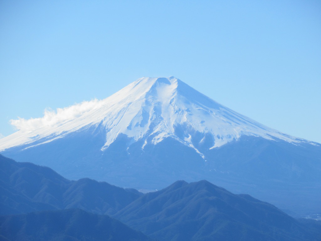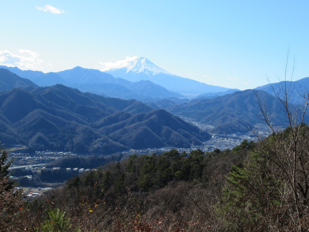 <詳細報告>空気も乾燥し霞もなくなるこの季節、富士山拝観にはウッテツケ、観光とB級グルメ賞味も兼ね、山梨の大月市秀麗富嶽十二景、百蔵山を訪れました。渋滞も無く小山から圏央道経由で2時間20分程、山梨も随分身近になりました。首都圏近郊は電車とバスを乗り継いで来る方が多く、登山客は多いのですが、駐車場は空いています。登山口近くの浄水場路肩も広く駐車できますが、行程も短いので、市営グラウンドの駐車場から舗装路を辿り20分程で登山口に着きました。冬枯れの灌木帯を抜け尾根に出た後は、稜線まで急登で林越しに富士山が見えます。稜線に出ると平坦で5分で山頂に到着、山頂は広く20人程の登山客が居ました。南西方面の展望が開け、大月市、三ツ峠山、中央に大きく富士山が見えます。人気の山か、入れ替わり立ち替わり人が絶えることはなく、のんびり景色を楽しみ和田美術館側の緩傾斜の道を下山しました。下山後第二目的の、甲斐の猿橋見物、B級グルメを賞味し、小山に17時頃には戻りました。行程も短いので、すぐ近くの富嶽十二景 岩殿山、扇山と組み合わせるのも良いかと思います。