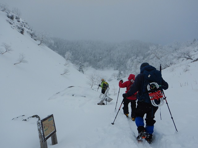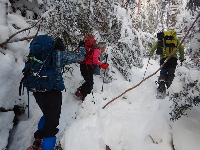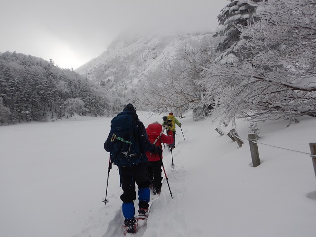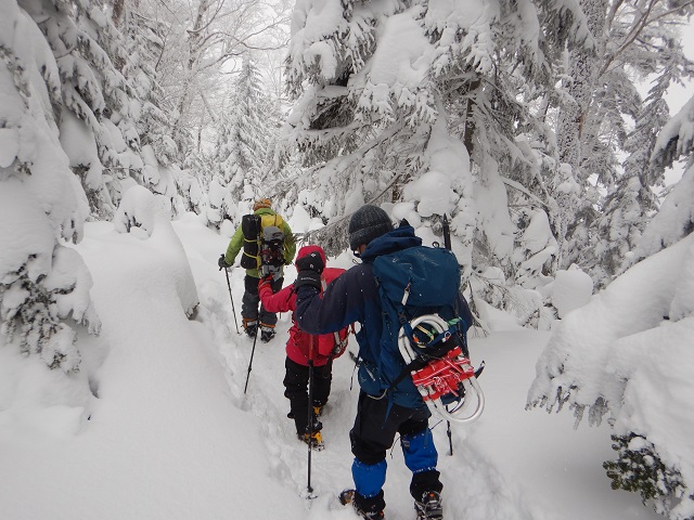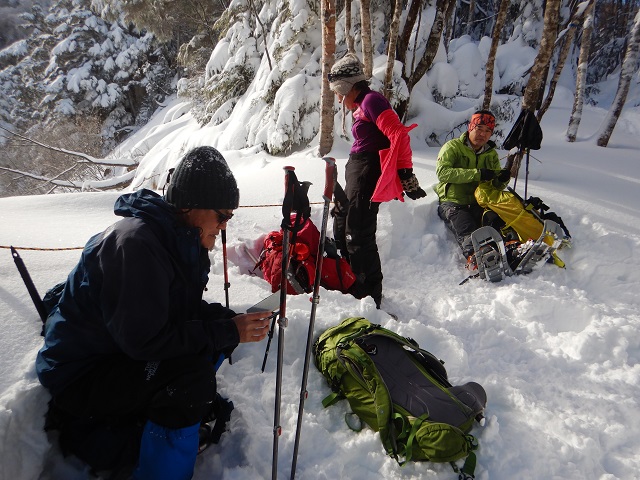 昨晩かなりの積雪があったようですが、私たちが入山するころ、登山道にはしっかりしたトレースがあり、ワカンとスノーシューを履いているもののラッセルの苦労はありませんでした。それでも樹林帯に入ると周りの木々がすっぽり雪に覆われていて、久々に観るそれは幻想的でした。