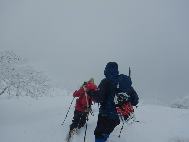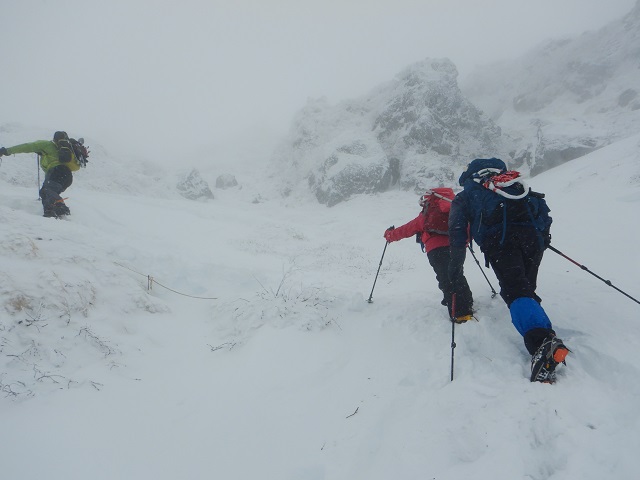 弥陀ヶ池から出てすぐの急登を越えると、いままでとは雪質が変わり、サラサラ雪からアイゼンが刺さりやすい締まった雪になっていました。弥陀ヶ池から見上げた時に観えた、「雲の中」付近までたどり着いた頃には、時々吹きつける横殴りの風と天候悪化の兆しの雪が降りはじめ、私たちは相談した結果、ここで下山を決めました。ちょうど山頂直下のガレ場に差しかかる手前でした。下りは慣れないアイゼン歩行のため、特に弥陀ヶ池までは、つまづき転倒などに注意しながら慎重に下りました。