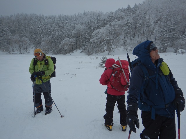 樹林帯をぬけて弥陀ヶ池に着くと、いままでの天候とは一転して曇り空に変わり、冷たい強風が私たちを待っていました。気温はマイナス10℃。強風を入れるとそれ以上の体感でした。ここでワカン、スノーシューからアイゼンに履き替えて出発。見上げると、山頂は雲の中で白根山は確認できませんでした。登っている途中、数人が山頂方面から下りてきたので山頂の状況を聞くと、みなさん「途中で断念しました」と疲れたような返答。先を進みました。