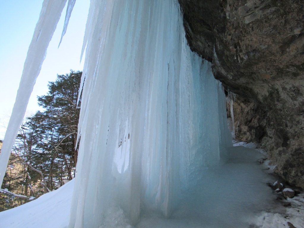 <概要>日光戦場ヶ原の庵滝が凍ったとのこと、天気も良いので氷瀑見物に出掛けました。天気も良く、風も無く穏やかで、見事に凍った滝を見られました。