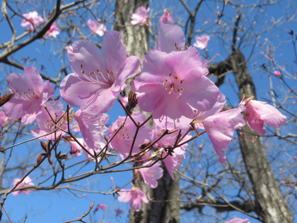 ともさん の金原山ヤシオ偵察から1週間経ち、そろそろ見頃になったかと出掛けてみた。峠の駐車場は10台程でほぼ満車、寒気のせいで少々肌寒いが、空気は澄み切り風も穏やかです。金原山までは花も有りませんが、ヤシオ山手前から今シーズンお初、ほぼ満開となった赤ヤシオがあちらこちらで見られ、早くもミヤマツツジも咲き始めています。麓の桜が満開なので、これからヤマザクラの季節かと思うのですが、何故かヤマザクラは既に散り葉が出ています。小俣峠のお地蔵様を拝み林山に向かい、山頂手前の岩場まではヤシオの花が楽しめましたが、ここから先は何もありませんでした。少々時間も早いので、天ケ岳方面に足を延ばし見晴らしの良い390Pで休み、往路を駐車場まで戻りました。花も満開を迎え30人程のハイカーでそこそこの人出で、期待より多いヤシオの花を楽しめました。