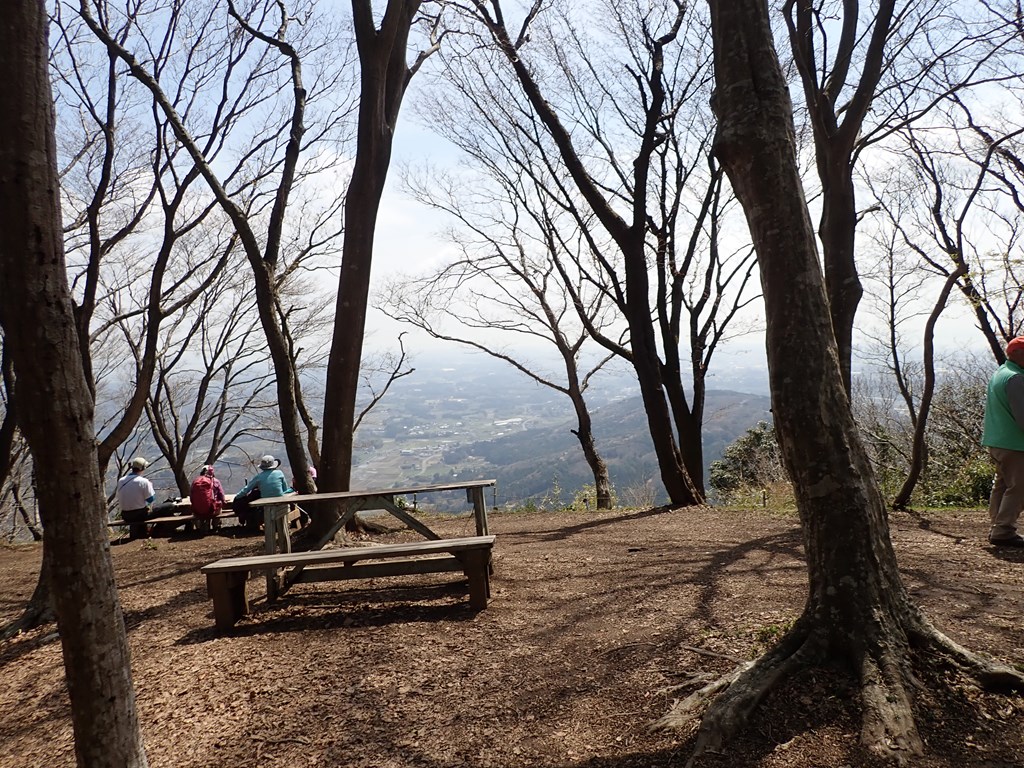 そこからは歩きやすい尾根だった。雪入山は平らで山頂らしくないが南の眺望は良い。あきば峠で車道を横切る。浅間山への登りは少しきつかった。山頂には石祠とテレビアンテナ中継所がある。浅間山を下るとまた気楽に歩ける山道が続く。中高年3人のトレラン隊が追い越していった。この尾根にはトレランだけでなくマウンテンバイクも良く登場するらしい。権現山で三角点を見る。そのすぐ下は「御野立所」という場所で、満開の桜が見事だった。「御野立所」というのは昭和4年に陸軍特別演習が行われたときに昭和天皇がこの地で御統監されたからこの地名になったらしい。その石碑で大休止。