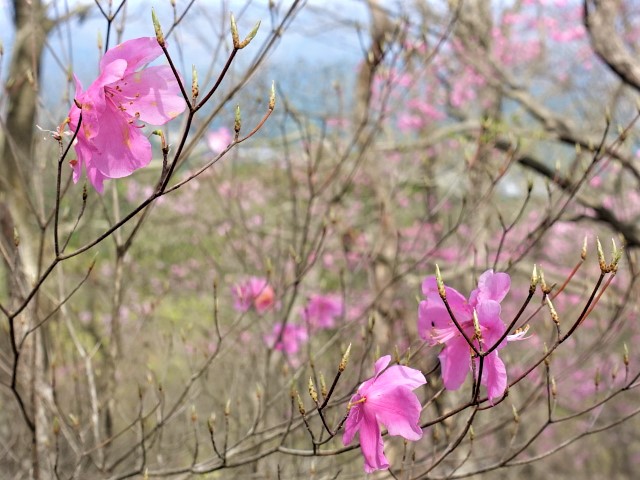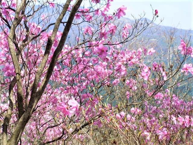 北側斜面のヤシオを楽しみながら頑張れば、山頂に到着。ヤシオと背景の表日光連山が素晴らしい。密を避け早めに下山、北西への一般道を合峰1084mへ。降り口のロープのあるところより修験道へ入る。ロープの張られた急斜面を落石に注意しながら慎重に降りる。珍しく単独者に遭った。銭澤不動尊は割愛し稜線を辿る。小さなピークが何度も出てきて、その度に方向確認が必要だ。特に危険なところは無いが、ルートファインデングには慣れておく必要がある。鉄塔まで降りれば終盤だ。トレースが無い何処を降りても帰還できるが、ふみ跡を辿る。予想ではお寺に降りると思っていたが、少し手前の登山口で、駐車場まで5分ほどであった。今回初めてのお二人さんには、変化の有る静かなルートとヤシオを楽しめたのは良かったことと思います。