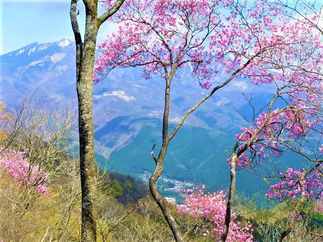 登山口の堰堤付近は工事され様相が変わっていた。この時期は未だ山ビルがいないはずで気が楽だ。登り始めは薄い踏み跡を辿り、直ぐに直下の高速道を見下ろしながら進む。鹿の遠吠えを聞きながら中間点の中曽根岩屋観音を参拝、稜線に戻る。随所にアカヤシオが出てきて疲れを癒してくれた。一頑張りで一般道1056mと合流、入口にはロープが張られている。