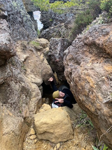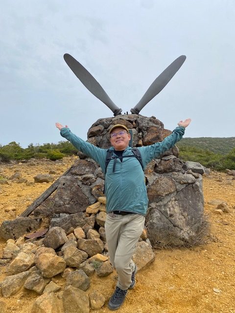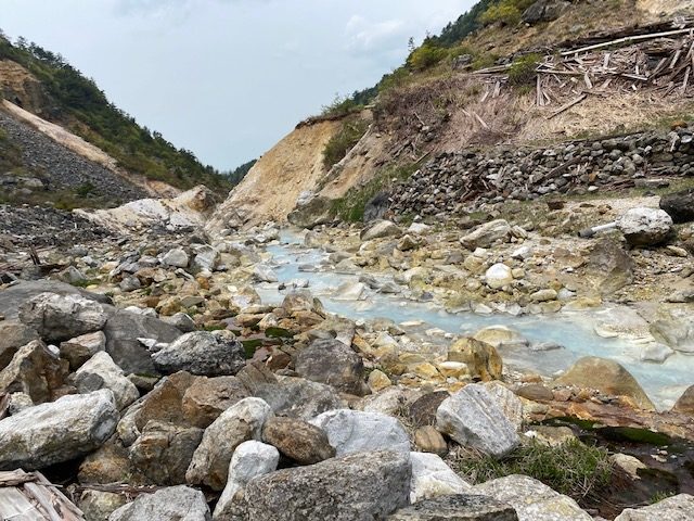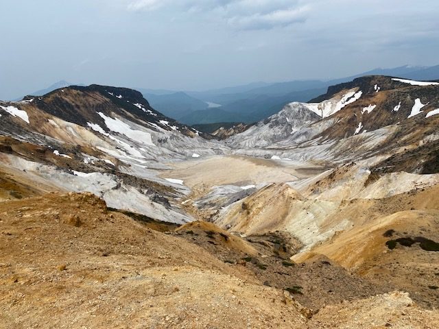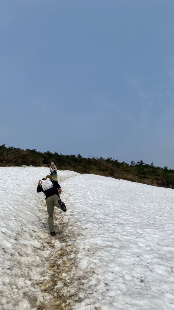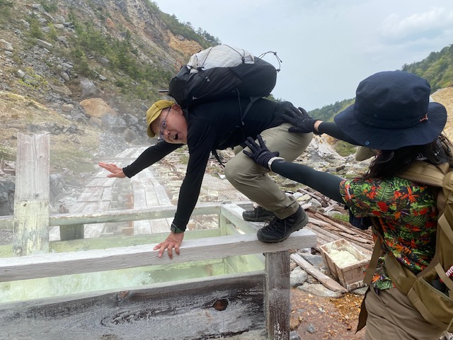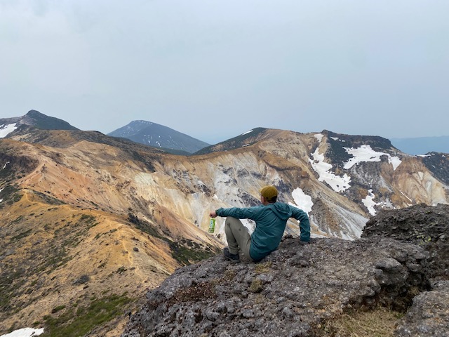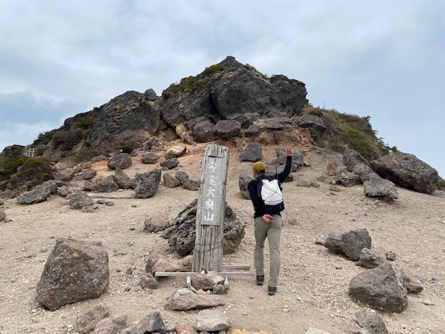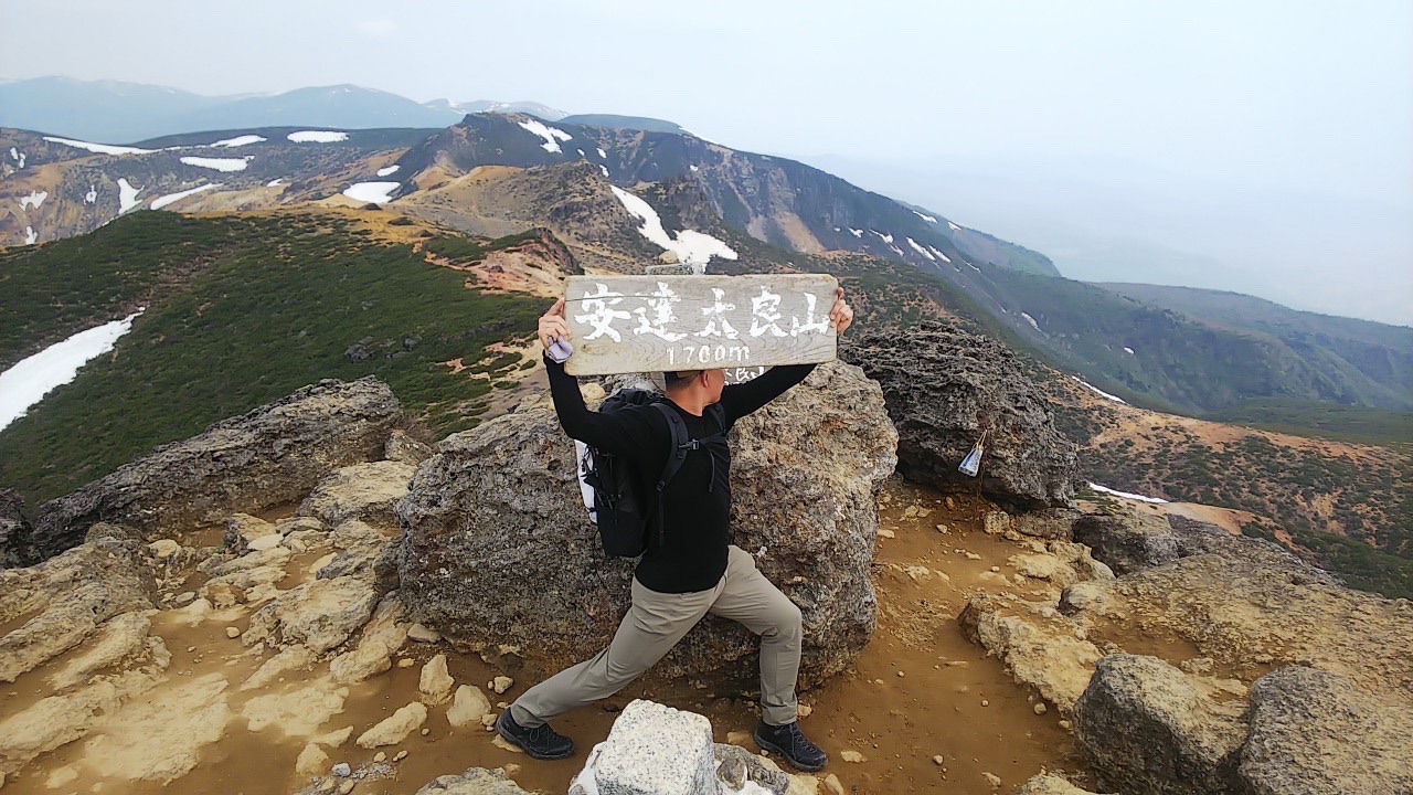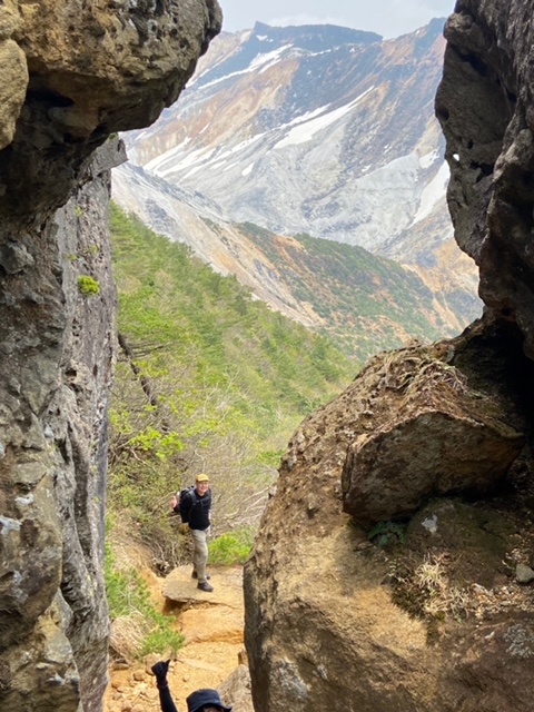 <詳細報告>小山を5時00分に出発。東北道経由あだたら高原スキー場の駐車場へ。県境より福島側では曇りでホッとする。駐車場には多数の車。ゲレンデの脇を登り始めると、山菜取りのおじさんがいて、山菜取りの人も多いのかなと思った。薬師岳まで順調に登ると展望よし。安達太良山の乳首が見えるようになる。1時間登ると安達太良山に到着。爆裂火口が目の前に広がり、その絵画的な色のコントラストが素晴らしい。登山者もほとんどいない。おそらくロープウェイが動くまでは少ないのだろう。ここから鉄山に向けて歩き始めると、鉄山側からの登山者がすれ違う。爆裂火口はガスが危険なため立ち入り禁止となっていた。火口を見ながら鉄山までは空中散歩のような稜線歩きで気持ちが良い。鉄山山頂は下から見ると崖のようになっており、一度道を間違えて、最後の崖をよじ登り始めたが、山頂にいるお兄さんから「そちらから登れますよ」と巻道を教えてもらい、また崖を降りて巻道をゆくと簡単に山頂に出た。ここは絶景ポイントでツレの3人も含めて思い思いのポーズをとって写真撮影。その後避難小屋に向かって出発。バックカントリーの時にはここまでも到達できなかったが、中に入ると結構居心地が良さそうな小屋であった。シャクナゲ記念碑を通り過ぎ、まるで東尋坊のような断崖の脇を進む。下るポイントに胎内岩があり、確かに狭い。ここを腹を引っ込めながら通過し、大きな岩の横を通り、下って行くと、硫黄の匂いが濃くなり、硫黄沢に出る。温泉が沢となって流れていた。橋を渡ると源泉取水の湯船のようなところあり、ここでも写真撮影。ここまで崖といい、温泉源泉といい、テンションが上がるスポット多数。登山者はほぼいないが、周回はおすすめである。ここからのまた登り返しがきついのだが誰も文句を言わずただひたすら火口の淵まで登り続けた。ようやくテラス状に突き出た絶好スポットを見つけ、ランチとする。セブンイレブンオリジナル麺神シリーズの豚骨。麺がかなり太く、硬めであるので好みは分かれるだろうが、私は好き。豚骨のスープもまあまあであった。その後雨がパラッときたので早足で峰の辻まで向かう。ザレた下りがあり、そこだけは慎重にその後はスピードを上げた。峰の辻あたりでゴロゴロと雷の音が鳴った。中学生と思われるジャージを着た集団が先生を先頭にぞろぞろと安達太良山の山頂に向かっている。雨が確実にきそうなのに呑気な感じで心配となった。くろがね小屋に着くと10人程度の登山者が休んでいた。水場を探したが見つからなかったので、そのまま下山。雨が微妙でレインウエアがいいのかウインドシェルでいいのか着替えたりしながら結局本降りにならずに下山完了した。見どころの多いコースであった。