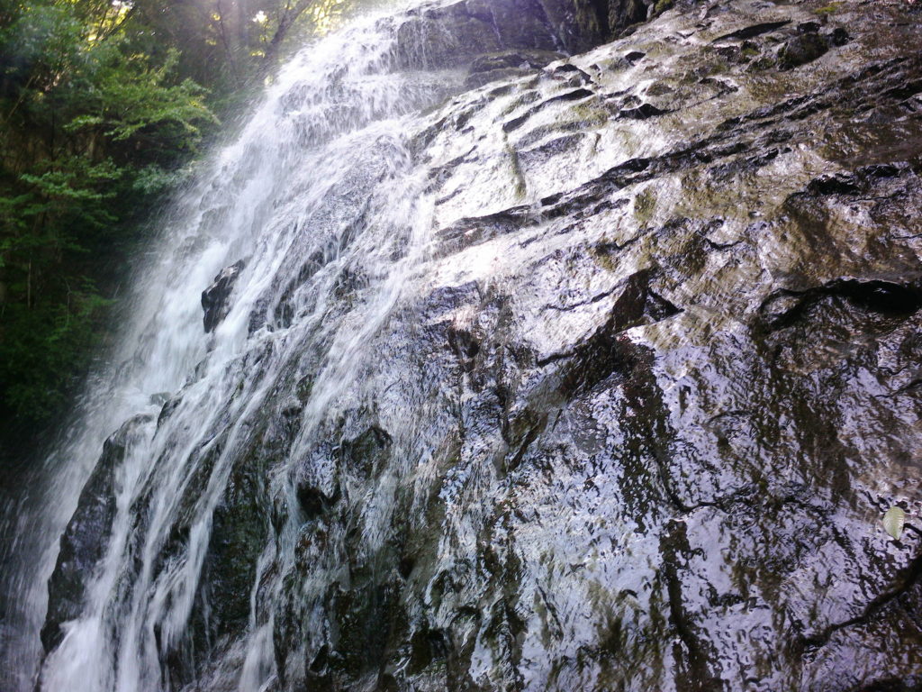 すぐに咆哮霹靂の滝、左は水量がある。取りついてみると、フリクションはよく効き良い感じだが、水流にホールドを探すのには手が冷たい。水流が少なく斜度が弱い右側からフリーで登ると、広いナメに出る。涼しくて気持ちが良いナメがしばらく続き、雷鳴の滝が現れる。