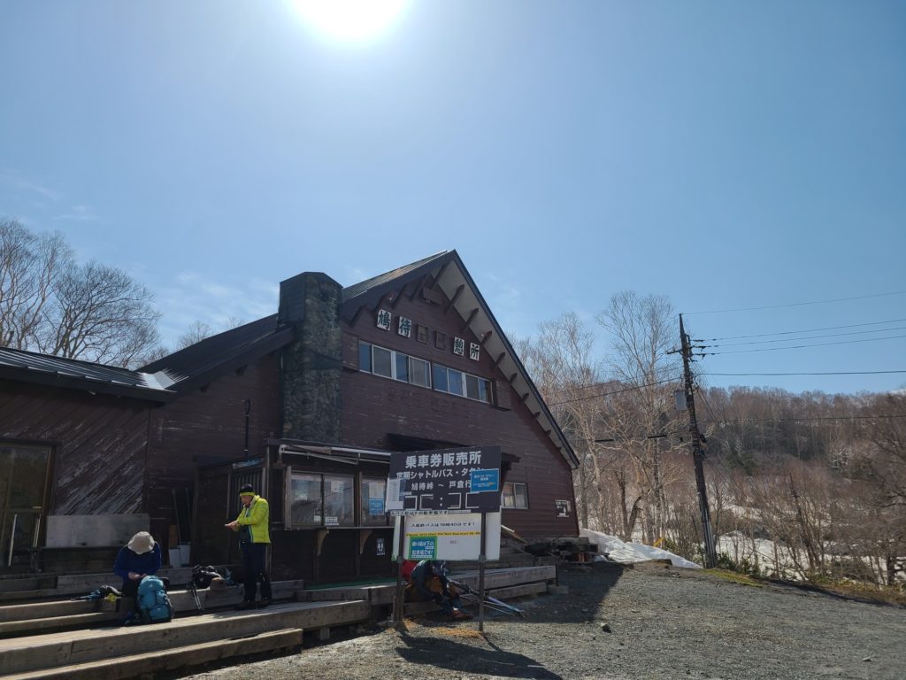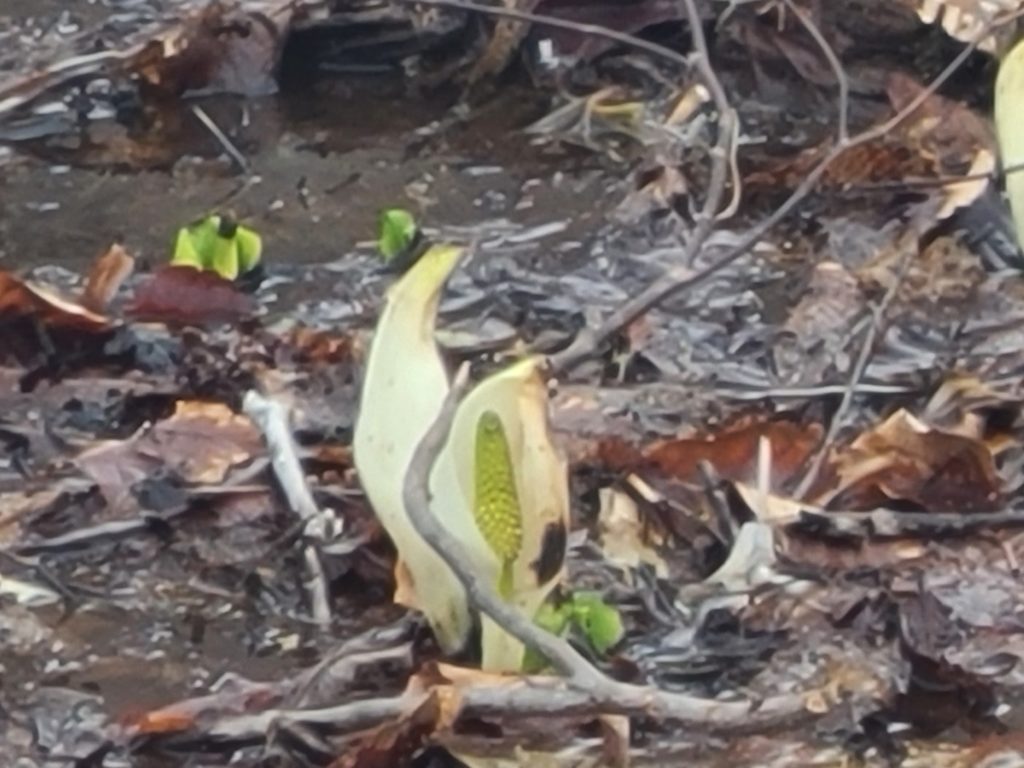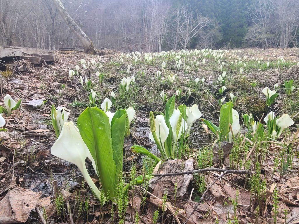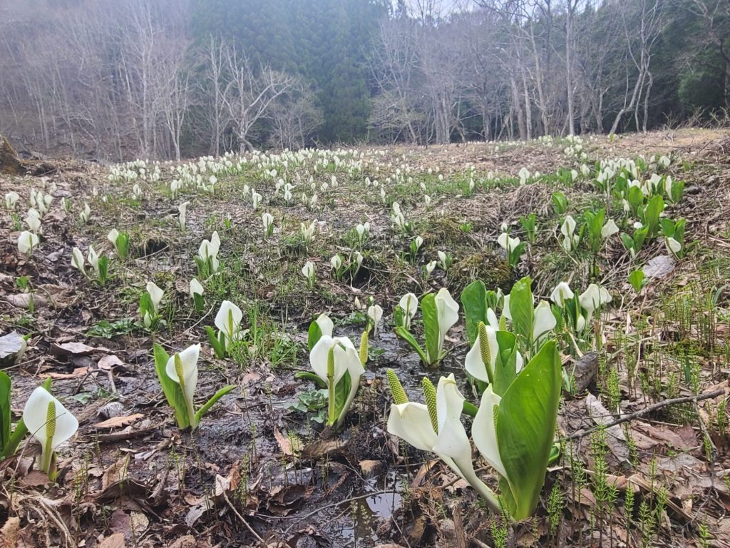 翌朝ものんびり起きて朝食はおじやともずくスープをいただき、撤収も帰るだけなのでゆっくりです。帰りも何度か休憩しながらゆっくりペースで歩きました。登山道の雪をカットし歩きやすいように整備している方とすれ違いました。木道の踏み抜きなどもあって注意して歩きました。帰りは尾瀬ぶらり館の温泉で温まり、その中にネイチャーセンターがあり見学してそこのスタッフに水芭蕉群生地で花が咲きだしてることを聞いて立ち寄りました。かわいい水芭蕉がたくさん見られました。道の駅かたしなで昼食を取り帰路につきました。
