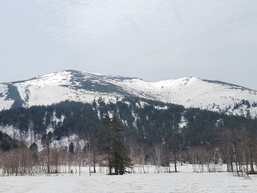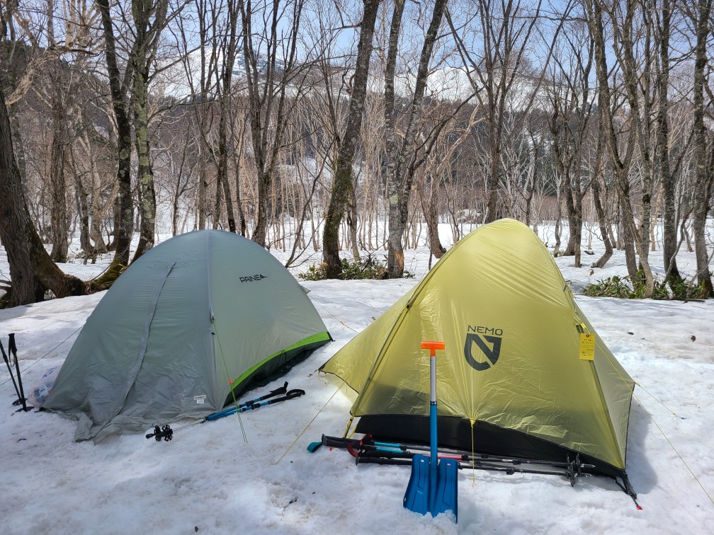 戸倉第1駐車場に着くと8割車が停まっていました。前日19日から期間限定至仏山が解禁され、ほとんどがBCの登山者のようです。支度を済ませタクシーに乗り鳩待峠に向かいました。峠には建設中の鉄骨の建物がありました。多くは至仏山へと行ったようですが、私たちは尾瀬ヶ原へ出発しました。人がいない静かな道です。昨年より登山道の雪は多く感じましたが、全体的には少ないようです。山ノ鼻へ近づく水辺に水芭蕉が咲き始めていました。まだまだ小さく可憐です。山ノ鼻に着きテント設営場所を探し整地をしてテントを張りました。やなぎさんのテントは買って初の山行で設営に苦戦?していました。無事設営し、さてこれからどうしましょうか?皆さん至仏山へ行く気はさらさらなく、昼食をたべてから尾瀬ヶ原へ出かけました。尾瀬ヶ原は昨年より雪が多く木道も埋まっているのでどこでも歩けるのがこの時期の楽しみでもあります。燧ケ岳と至仏山の展望スポットまで行き引き返しました。その後はお楽しみの夕食です。距離を歩かなくて済むためちょっと豪華な食事を持ってきました。みんなでおしゃべりしながら美味しいステーキをいただきました。続々と登山者も到着してテント場には30張りほど賑やでした。18時半には就寝。その時間には周りのテントも静かでした。