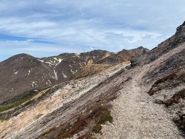 <詳細報告>一切経山を目指して小山を4時に出発した。しかし東北道を北上すると分厚い雲と雨が降ってきて、わざわざ一切経山まで行って、登らないんじゃもったいないねということになり、東北道でちょうど板室辺りだったので、那須岳に変更しようかということになり、峠の茶屋へ。ロープウエイ目指して登ってゆくと、途中で雲や雨がなくなり、高曇りの天気となっているので、登れると判断し峠の茶屋到着。車はあまり多くなかった。登りはじめに一部雪はあるものの、その後は雪は消えて登りやすかった。峠の茶屋より少し下ったところに一部雪渓のトラバースがあり、ここを帰りは一人のおじさんがシャベルで道を作ってくれていた。難なく峰の茶屋について朝日岳を目指した。ほとんど雪なく登山者も少ないのであっという間に朝日岳到着。鎌倉からきたというおじさんが一人タバコを吸いながら、3連休は明日男体山、明後日白根山と登って帰りますと言っていた。なんと皇海山は登ったことがあるらしい。ここから峰の茶屋に引き返し、茶臼岳を目指した。山頂からは雲海と男体山、女峰山、白根山、尾瀬の山々が見えた。お釜の周囲をぐるりとまわり、また下って南月山への分岐点でランチ。Sさんからいただいた寿がきやの辛辛魚という恐ろしく辛いカップラーメンを食べた。連れは一口食べただけで無理と言っていたが、私は全て食べた、が、その後なんとなく胃が痛いような気はしていた。その夜トイレにこもることになる。昼食後日の出平までゆき、南月山にはいかず、引き返して下山した。