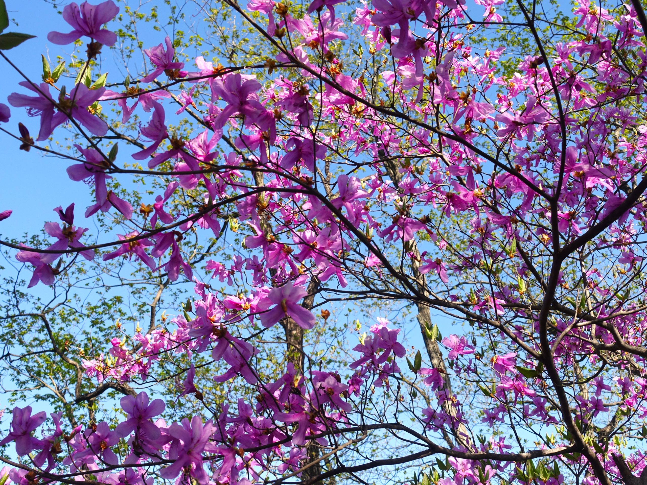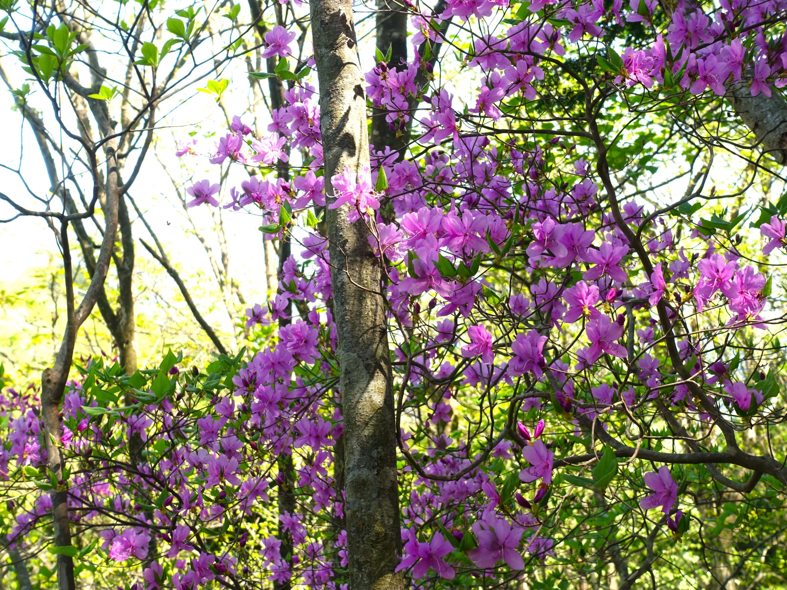 周囲は杉、檜の植林と自然林が交互に現れ、花を目的にきたのだが、思うにまかせません。雑木の中で目立つのは、紫色が目立つミツバツツジです、斜面のいたるところで咲いています。山ツツジには早いし、赤ヤシオは殆ど散っています、気の早い白ヤシオがたまに咲いていました。足元のスミレ類、カタクリも期待外れです。急登は疲れます、ステップが無いので足首、アキレスの疲れが溜まります。ようやく一般道との合流です、出口にはロープが張られていました。