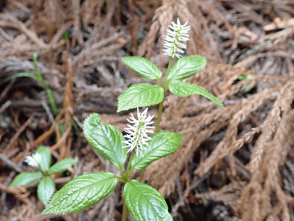 峠からは赤柴方面に下った。駒形から入山してカッコソウを見た人は大部分赤柴へ下るようだ。コアジサイは葉が出始めたばかりで花はまだまだ先だ。赤柴登山口からは林道歩きだが、少し進むと倒木が林道を塞いでいた。もちろん、下をくぐれるので通行に支障はないが、右側の杉林が広く伐採されていた。有名なヒイラギソウ群生地は日当たりが良くなったせいか、理由は不明だがこじんまりとしてしまった。