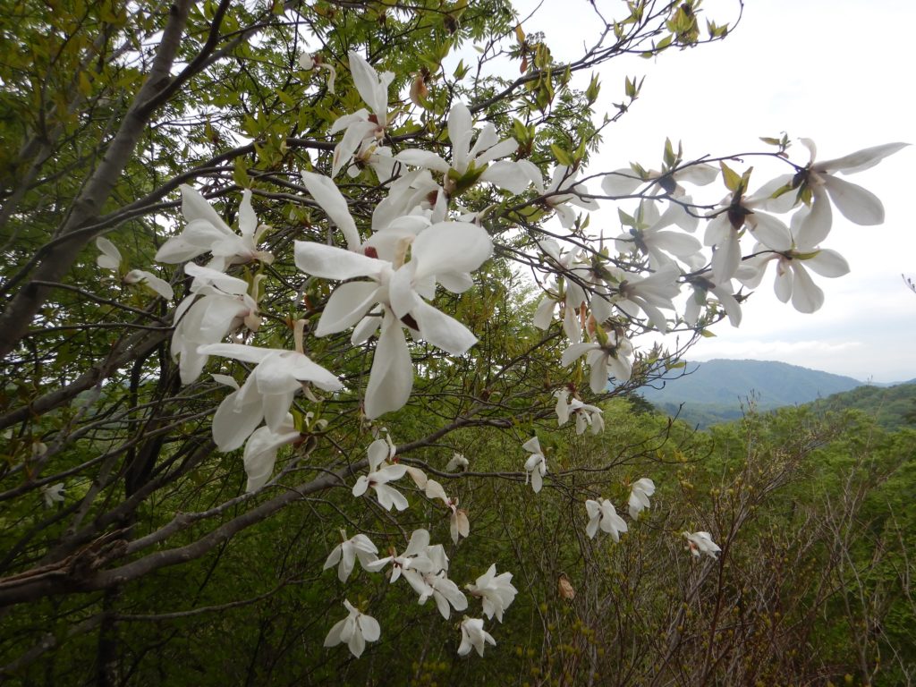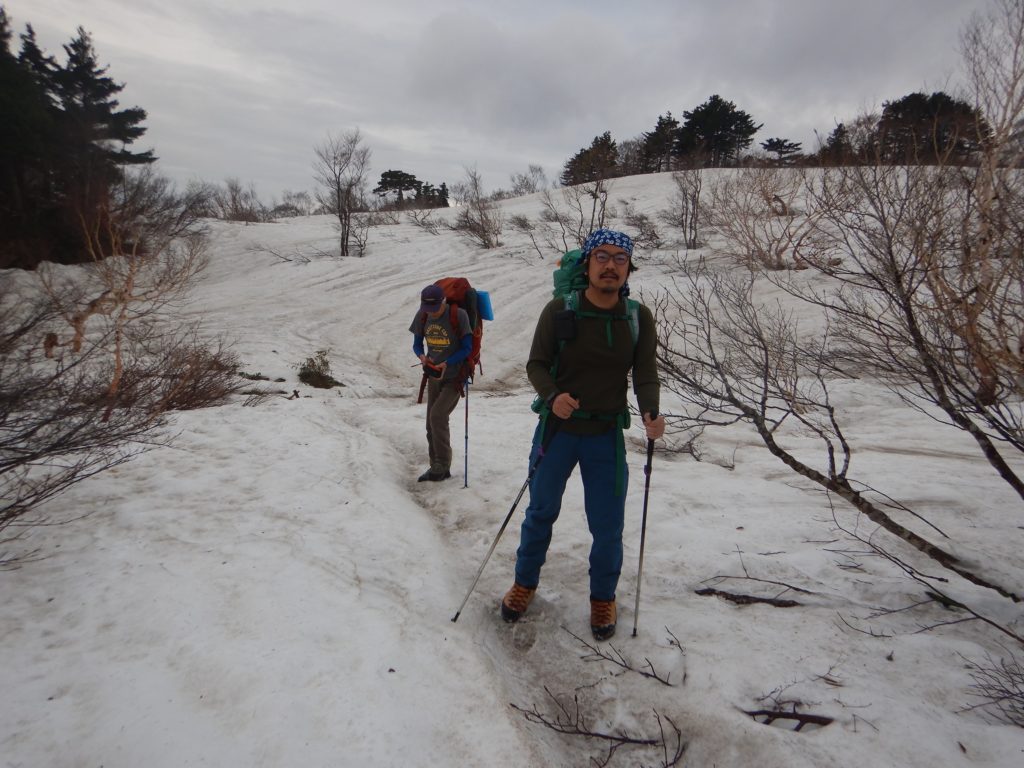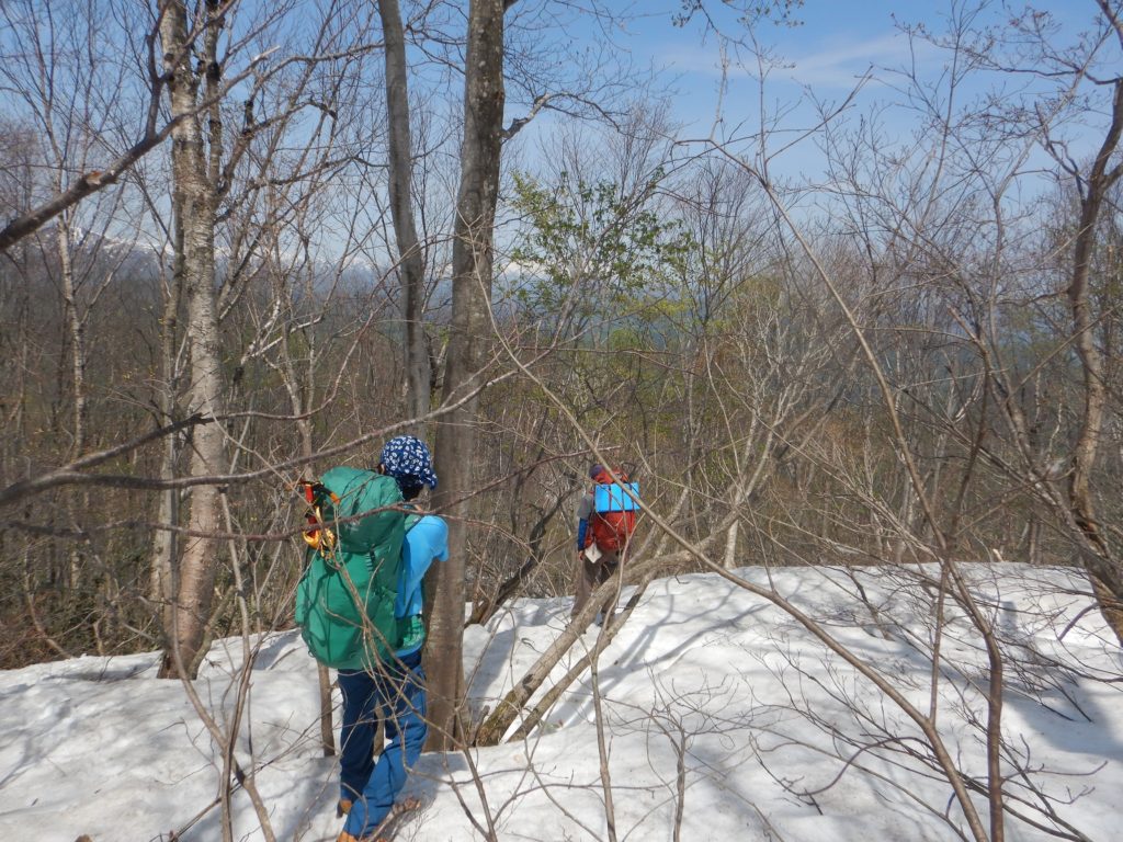 私たちはこの橋は渡らず、沢の左の鳥原コースを鳥原小屋目指して出発しました。すぐに尾根に取付き急な登り、足元にはイワウチワ、カタクリ、見上げるとタムシバというコブシに似た白い大きな花が迎えてくれました。2時間ほどで畑場峰に着くと急だった斜面が少し緩くなりました。この辺から残雪が増え始め、夏道が不明瞭になっていきました。対面の古寺山コースに比べると、私たちの鳥原コースは入山者か少ないらしく、この時期数人の雪の踏み跡はあるものの、ここのところの気温の上昇で踏み跡がほとんど消えてしまっていました。広い尾根は少しでも夏道を見失うと、低い木々の藪が行く手を遮りました。