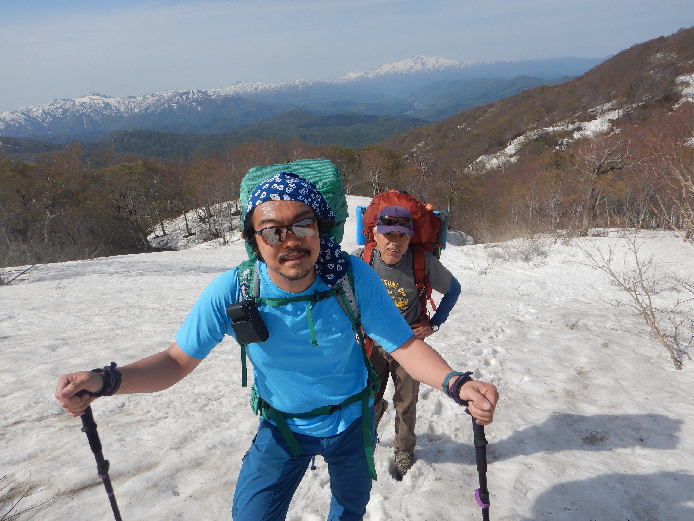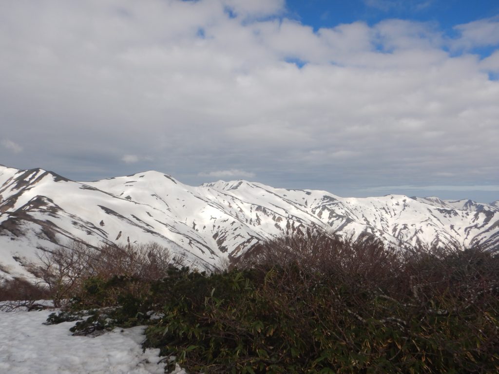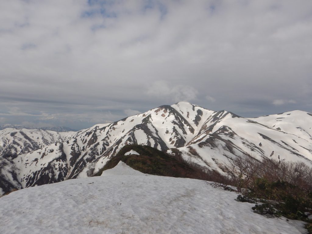 4/30(鳥原小屋~大朝日小屋)6時前に小屋を出発。夏道らしい残雪を進みます。30分ほどで鳥原山山頂。正面に大きな頂の大朝日岳。そこか左右に延びた稜線。朝日連峰全体が見渡せました。昨日の天気予報では、きょうは曇り時々雨。でも、実際は午前中は青空が時々覗かせるいい日になりました。