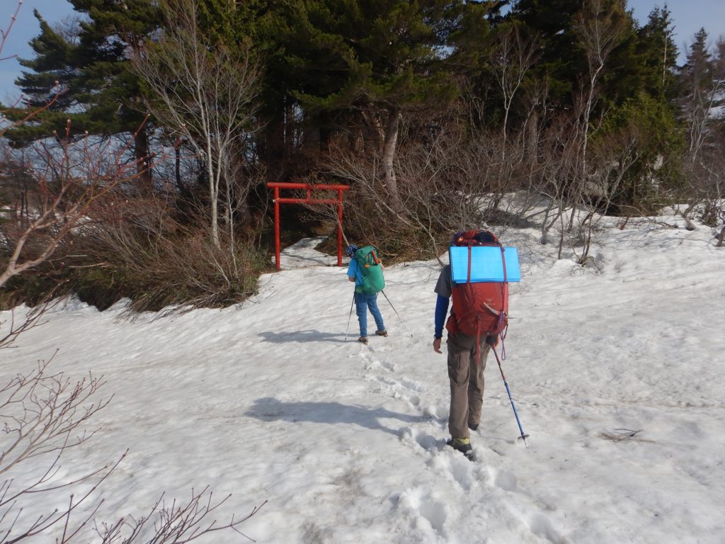 夏時間からかなり遅れて、湿原らしい広いところに出ると、鳥原小屋が近いことが分かりました。しばらく残雪の湿原を地図で確認しながら小屋を探していると、大きい木々の生い茂った前に赤い鳥居がありました。ようやく鳥原小屋に到着しました。2階建ての立派な小屋の下には、雪に隠れた沢の水がゴーゴー流れていました。この日の小屋の利用者は私たちのみでした。携帯はドコモはアンテナが4本、下界と同じ感度でした。