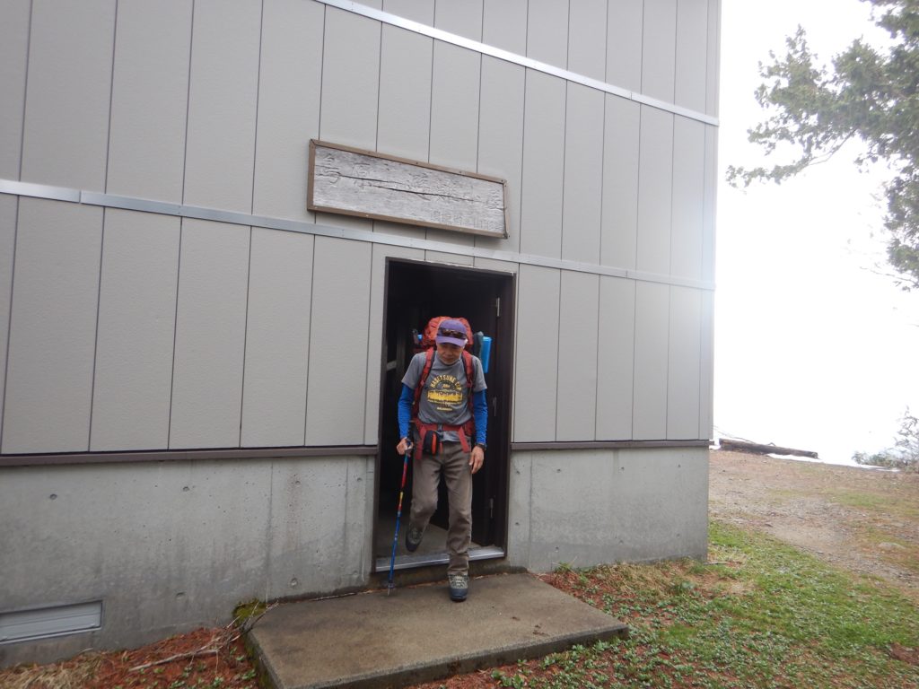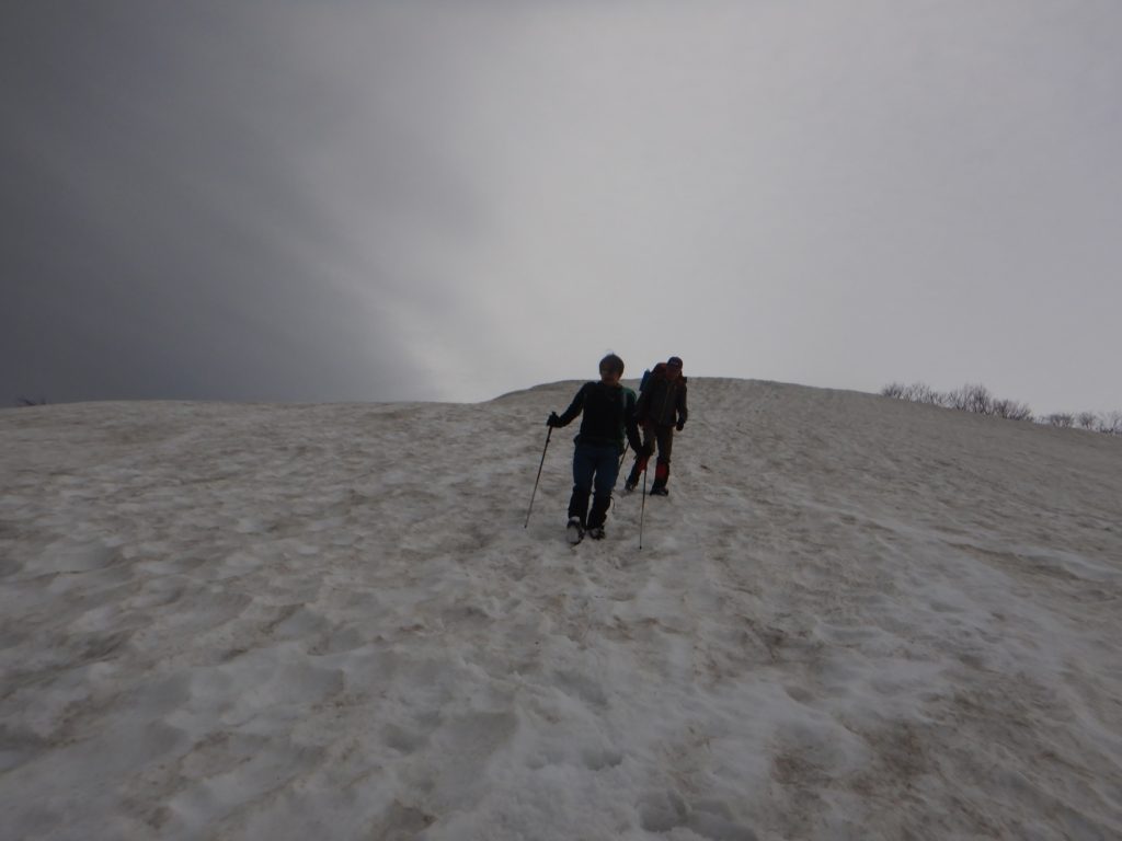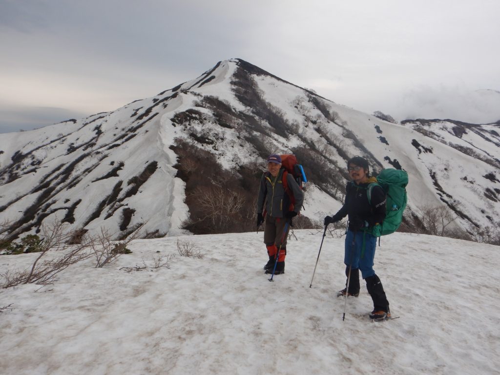 5/1(大朝日岳登頂~下山)昨夜は低気圧の通過の影響で、一時的に冬型になり、小屋に叩きつけるような雨風で、何度も起こされました。朝は寒くて目が覚めてしまい、窓からまだ薄暗い外をのぞくと、雪は降っていないものの、まだ昨夜からの風雨が残っていました。いつもの時間に朝食を済ませ、パッキングをしていると、少しづつ、風が弱くなっていくのが分かりました。雨がやむのを待って、大朝日岳まで空荷で登頂。山頂はガスで視界ゼロ。まだ風が5m前後あったので、記念写真を撮って、早めに小屋に戻りました。昨晩お酒をご馳走になった愛知から来た単独行の方は、私たちが山頂に向かうとき、わざわざ外で見送ってくらましたが、小屋に戻ると、もう出発してしまったようでした。