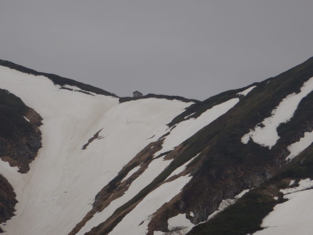 小朝日岳から眺める大朝日岳は山頂がすぐそこに観えて、その直下には縦長の大朝日小屋も近くに観えますが、まだこの先、一旦下って、最後約350mをのぼりかえさなくてはなりません。この登り返しは、小朝日岳の登り同様、最初は緩やかな登りですが、銀玉水の先は、約150mの案内の赤線が引いてある雪渓の急登でした。この直登を越えると小屋が近くなり。思ったより早い時間に大朝日小屋に到着しました。