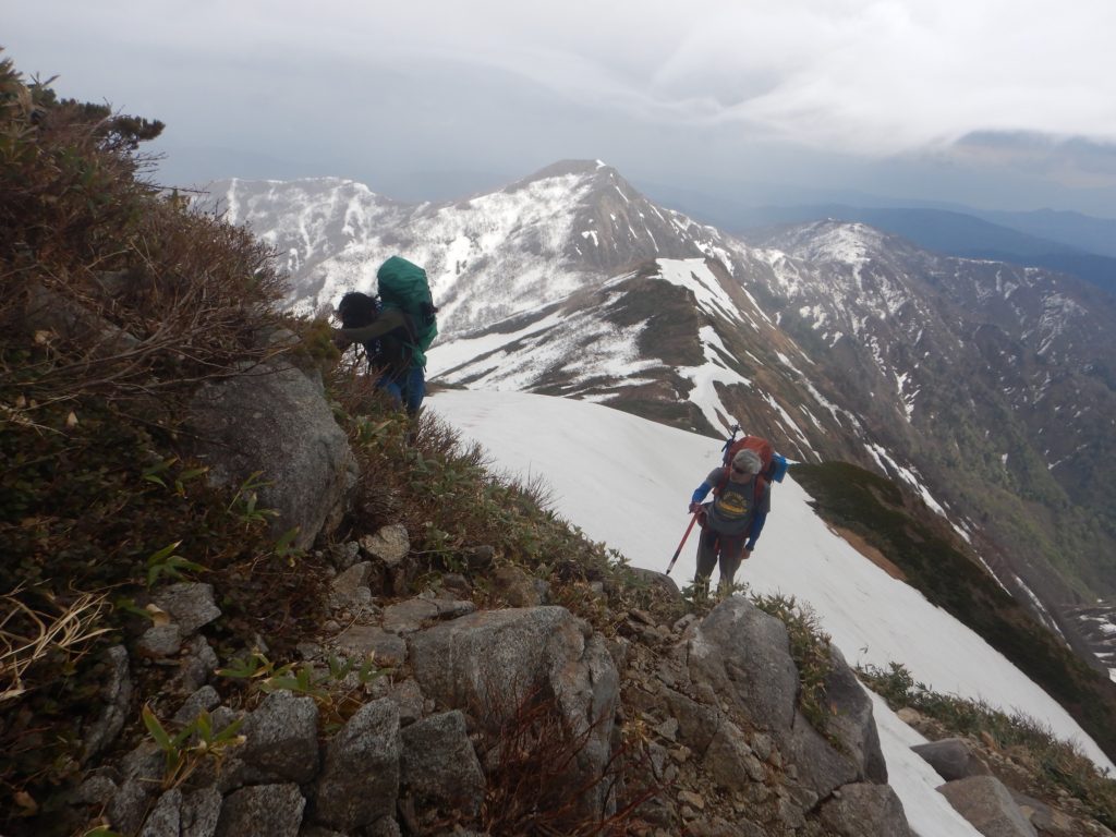 150mの雪渓を直登後岩場をトラバース
