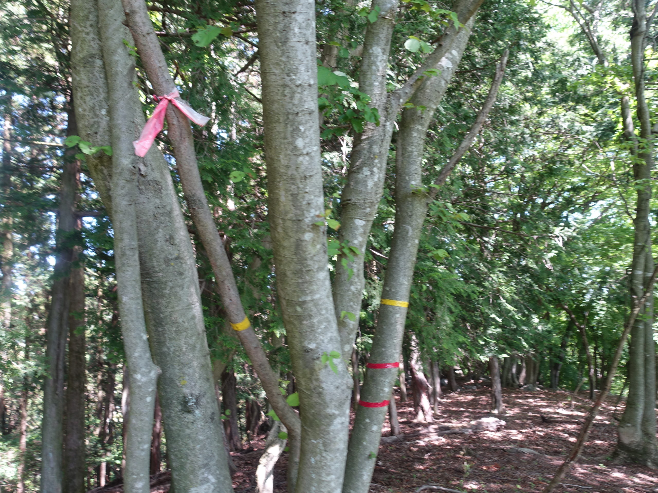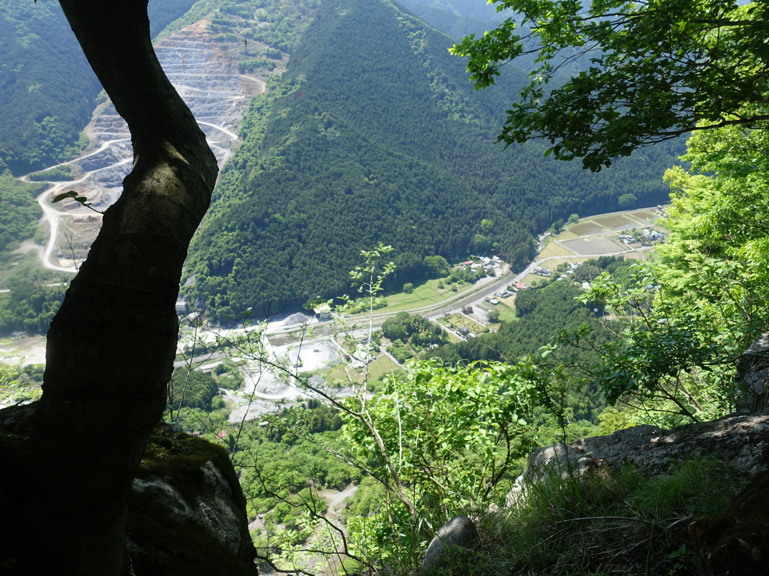 地形図にも表記なし、現場は山名板なし、標高表示なし、ただテープが巻かれているところが山頂みたいだ。この一帯は右も左も石灰の砕石場になっていて山肌が異様な雰囲気だ。土曜日といえ、重機の作業音が凄い。いよいよ最後の下りだ、北への急斜面をしばらく下り、緩斜面になり、右側の尾根らしきところにマーキングあり、それを辿るとデポ地にジャストでした。