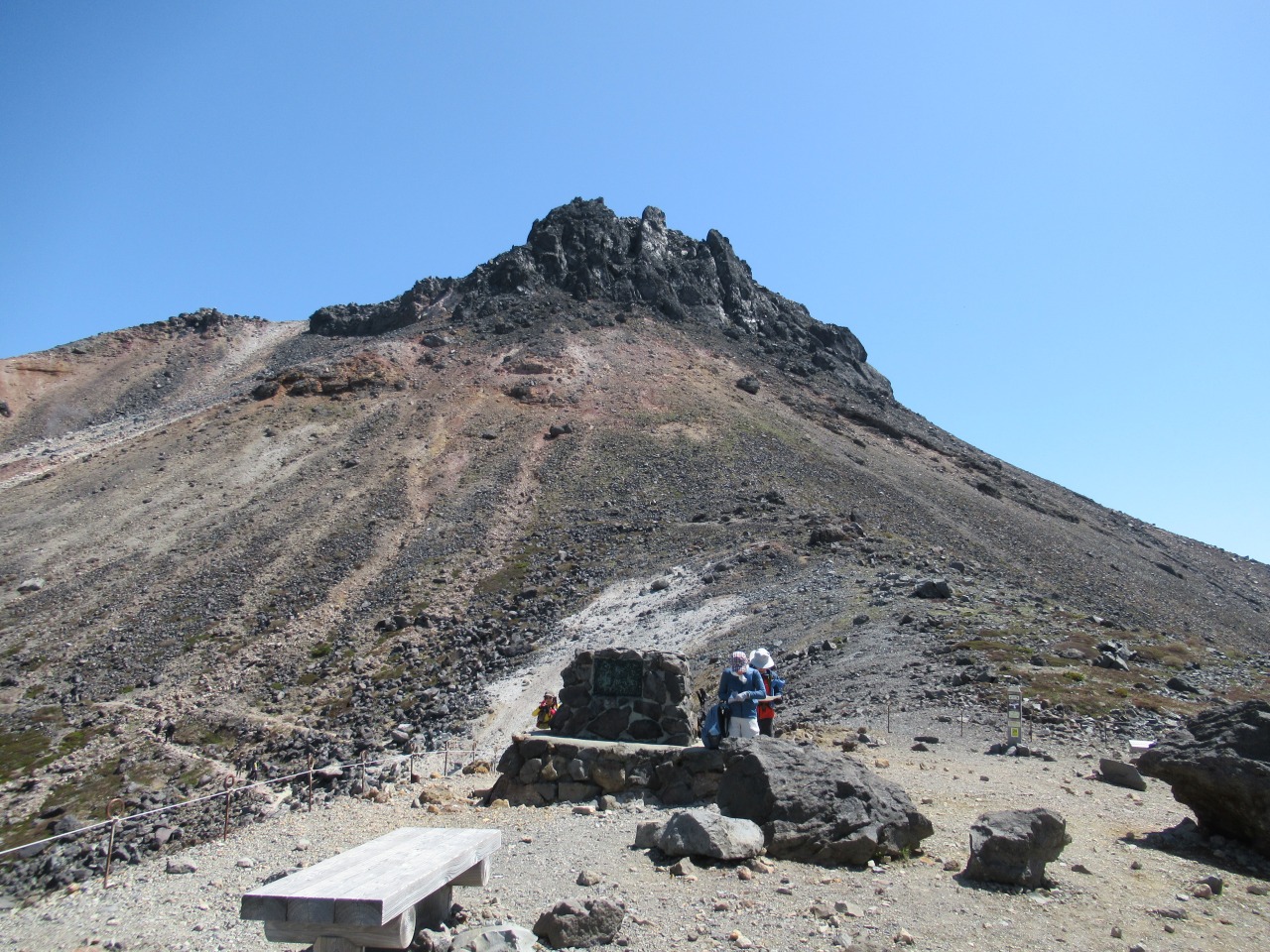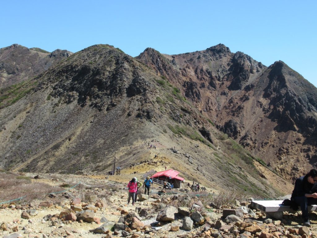峰の茶屋跡で四方に散らばる登山客を見て、沢山いるなぁ と、一休みする。牛ヶ首への道のりは、眼下に三斗小屋方面へ向う人や、ひょうたん池周辺を歩く人々が、小さく見えるのを面白がったり、ずーっと西へ伸びる気持ち良さそうな稜線は歩いてみたいと思ったり、遠くにはまだ雪に覆われた燧ヶ岳、会津駒ヶ岳、飯豊山のかっこよさに感動するなど、色々楽しめる。しかし、山側は黒くゴツゴツした茶臼岳の威圧感が恐ろしい。そして噴煙をなびかせ、硫黄の臭いには緊張感がよぎる。
