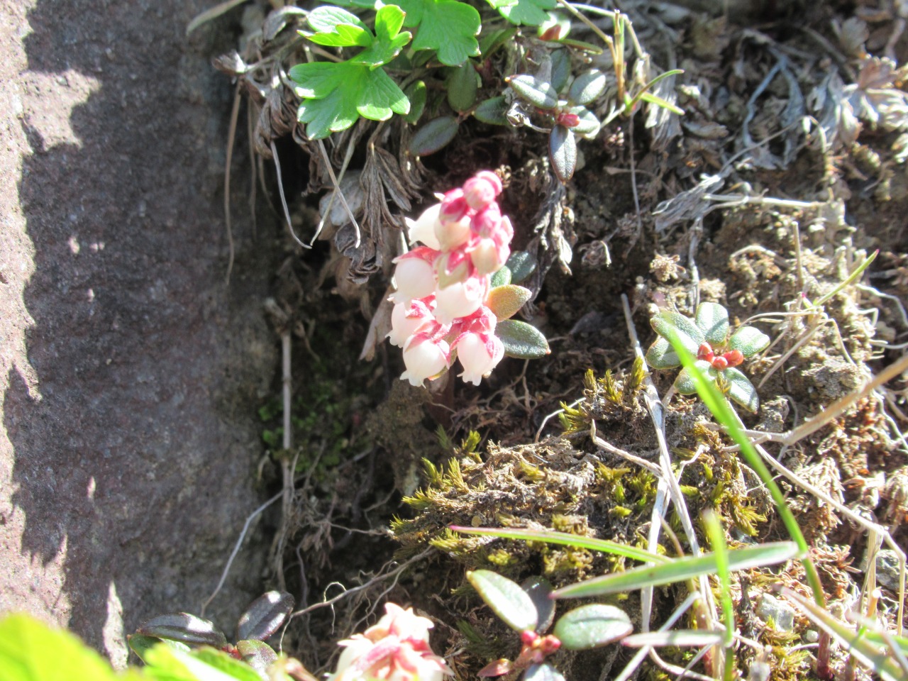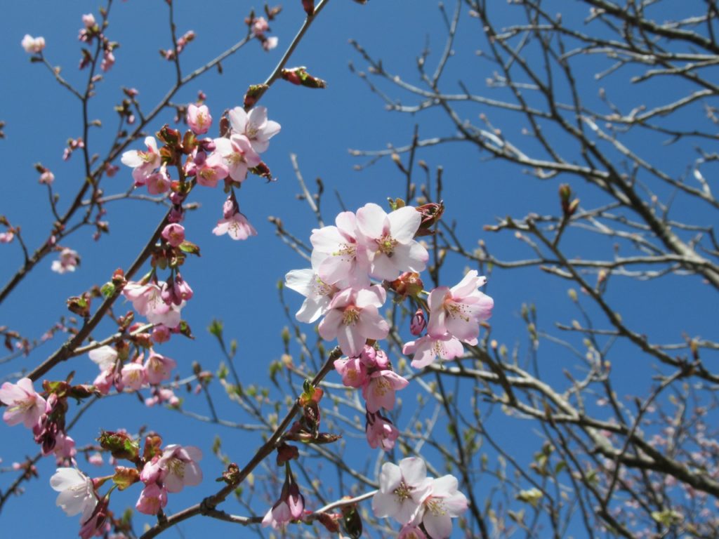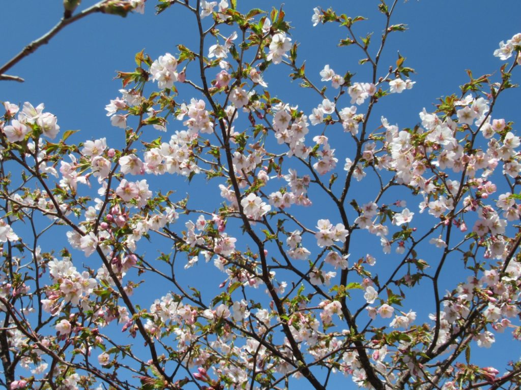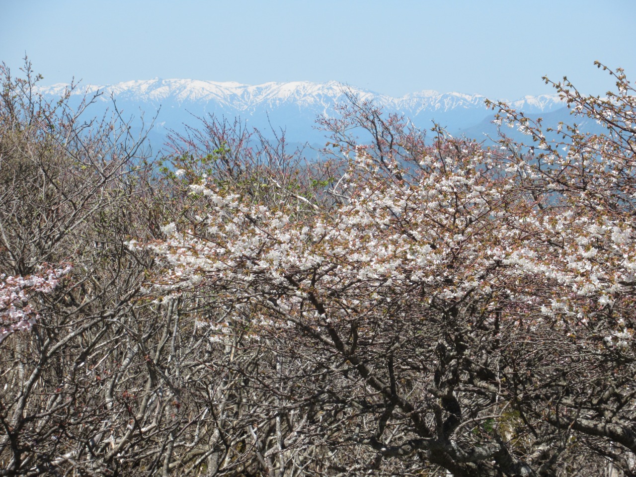 牛ヶ首が近づくと斜面がピンク色に染まっているのがわかる。ここからが長い長いミネザクラロードの始まりだ。白とピンクのミネザクラが入り交じり咲いていて、丁度見頃で綺麗だった。花と同時に赤い葉も出るので、ソメイヨシノなどとは違った趣きがある。また、背丈が低く、曲がったりしていて厳しい自然に耐えてきた事を思うと、よけいに美しく感じるものである。カメラに写る、空の青さと花のピンクとの色合いはあまりにも素敵すぎる。