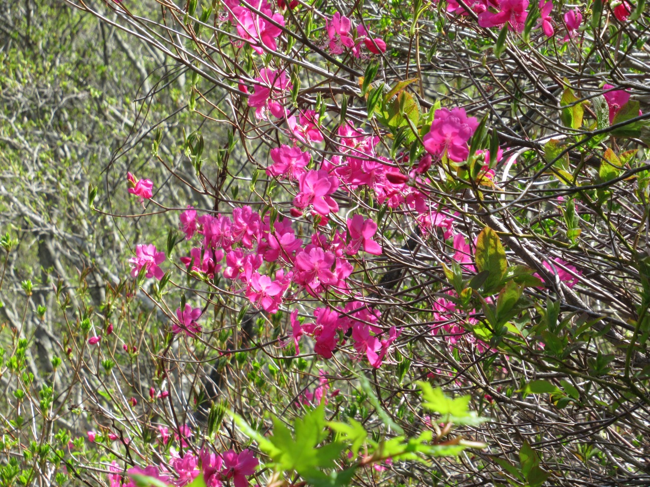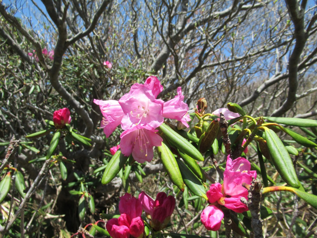 下山間際に白笹山方面の道にシャクナゲが咲いているというので見に行く。濃いピンクで綺麗だった。その後、また雄大な景色と花と風の心地よさを、見たり感じたりしながら戻った。