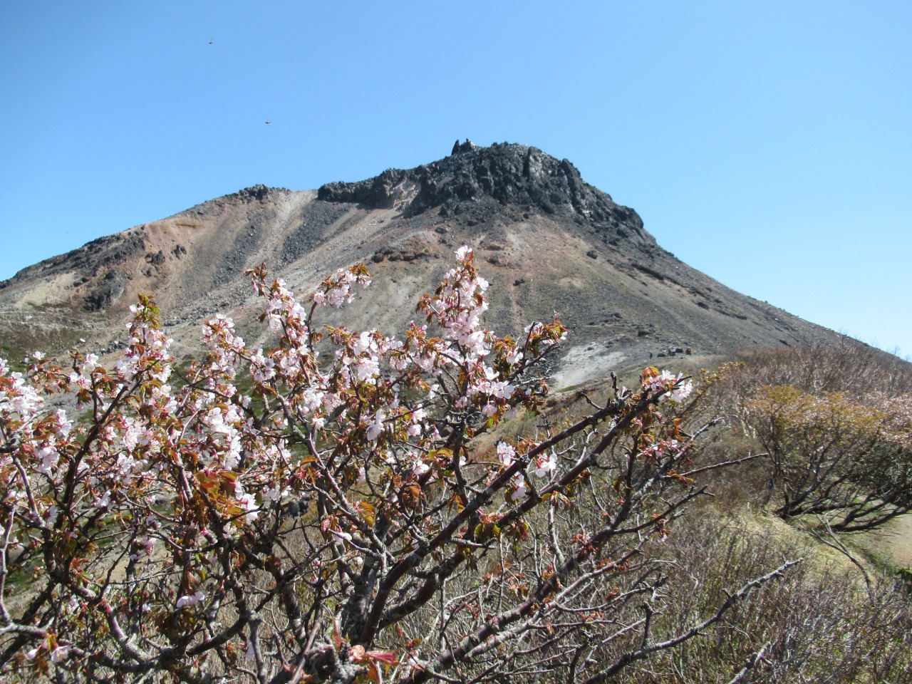 日の出平周辺はさらに増え、一面のミネザクラには、驚くばかりだった。そして、日の出平で初めて桜がバラ科であると知り、これにも驚いた。南月山に行く前に、沼原方面の道を歩いてみると、ここも、どこまで続くのだろー!ミネザクラを求めてとうとうピークまで来てしまい、折り返した。シャクナゲも同じように続いていて、咲く頃には華やかな景色が見られることでしょう。この道はかなり人は少ないが、南月山へ行く人はとても多い。何度も道の譲り合いをする。火山れきの道になると雄大な景色が広がり、とても気持ちい―!この景色を、たっぷりと静かに楽しめるのは最高であった。