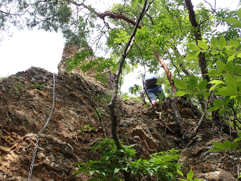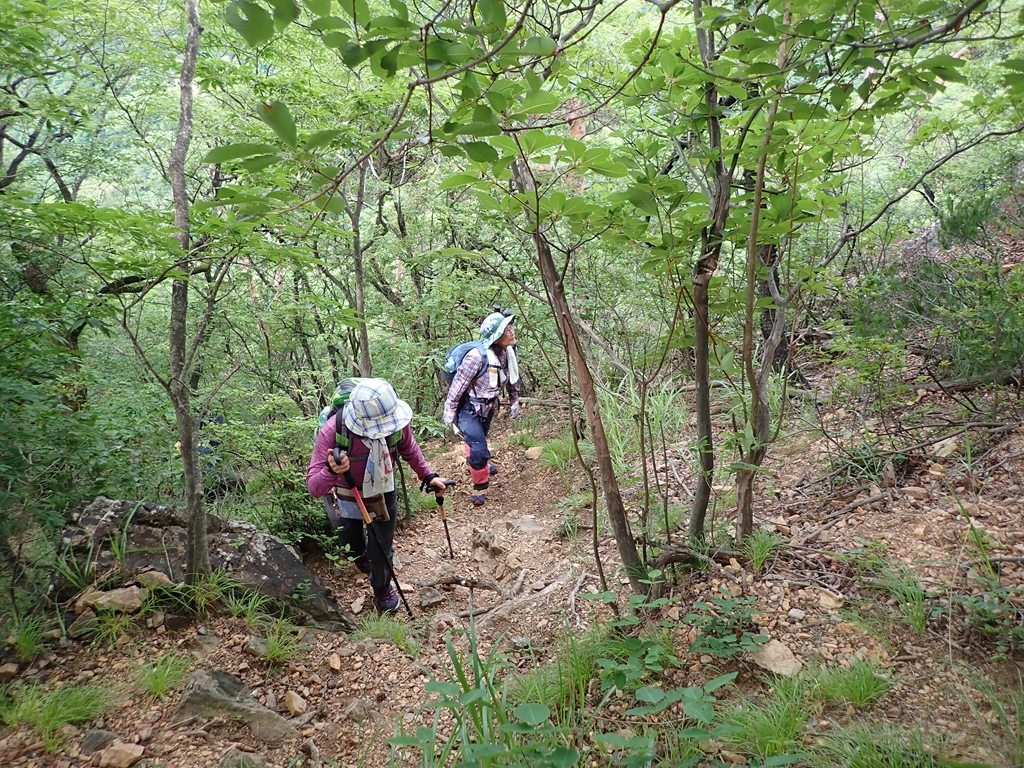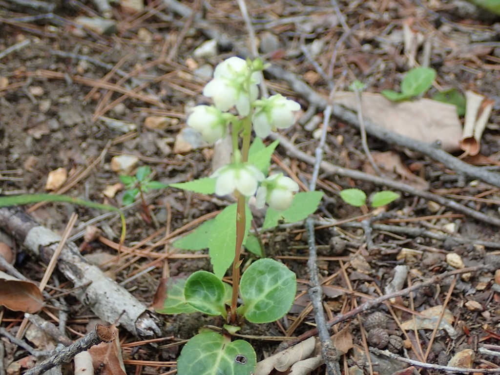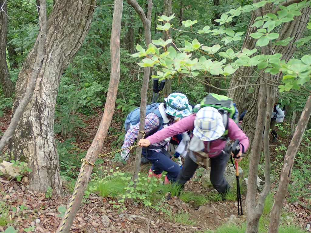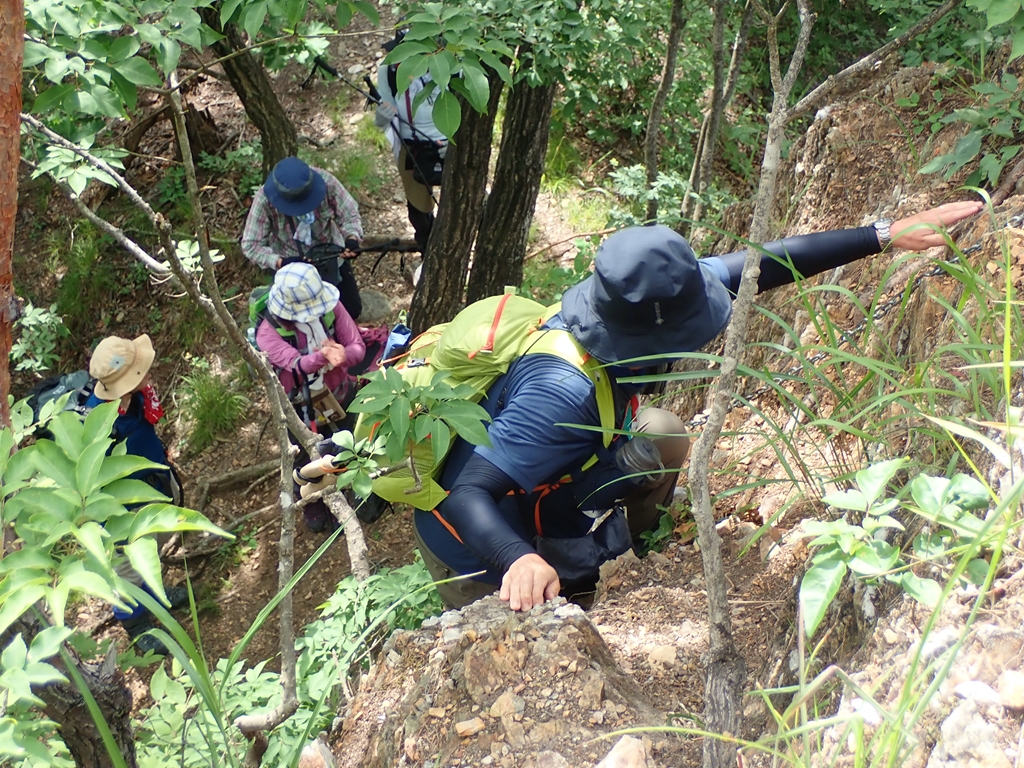 まず鹿嶋神社で安全登山を祈願して、地図の「正置」の練習をする。林道から尾根に取り付く。三床山への急登は相変わらず厳しい。山頂で少し休んで、西への降り口の展望が開ける場所で高松と二床山を対象にしてコンパスの使い方の練習をする。コルに下って2つ目のピークにクサリが架かっていた。今までは岩を右に巻いていたのだがしばらく来ないうちに架けられたらしい。そのクサリを登ってみる。上部がしっかりと固定されていた。その先で北に方向を変えて小三床山へ。そこで、三床山と232地点を使って再度コンパスの練習。バックべリング・クロスベアリングの説明もしたが、説明者も実地で使ったことがないので上手く教えられる筈もない。でも多少はコンパスの操作に慣れてくれたと思う。つつじ山で小休止。その時に登山道から少し離れた所にイチヤクソウを見付けた。この時期にこの山を歩くことが少ないので気が付かなかったが、この山では始めて見たのでうれしくなる。