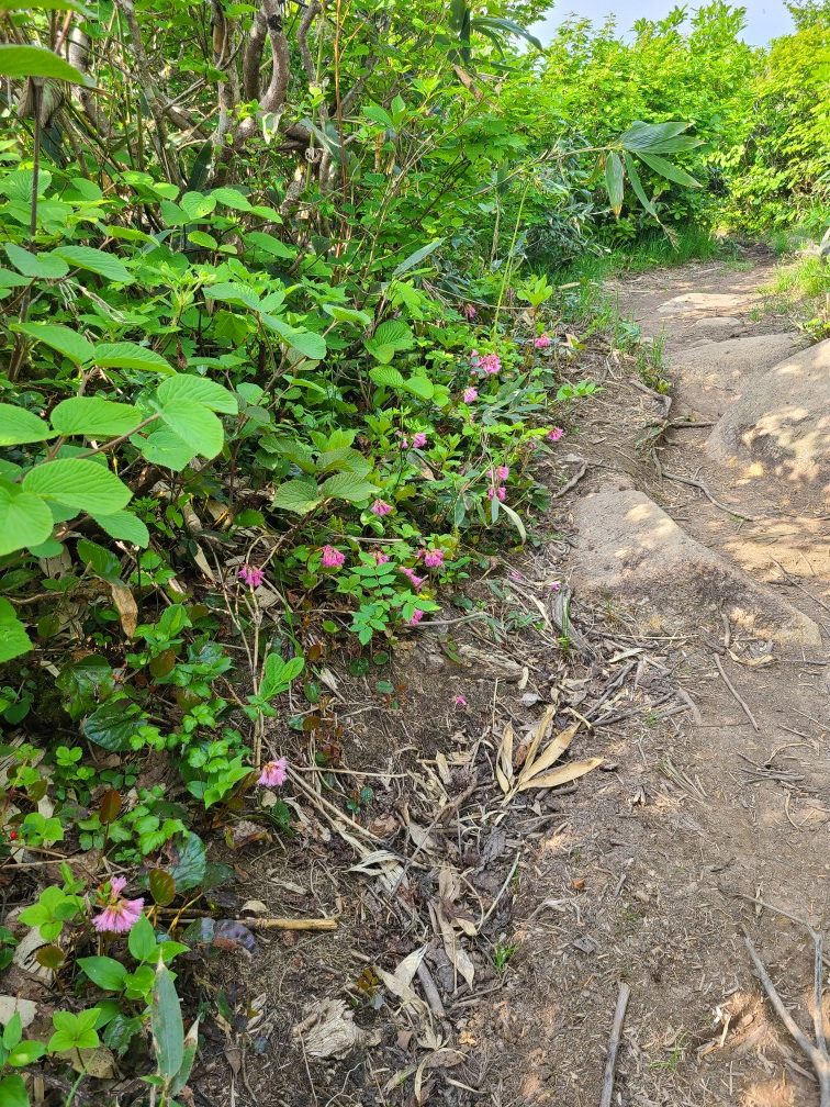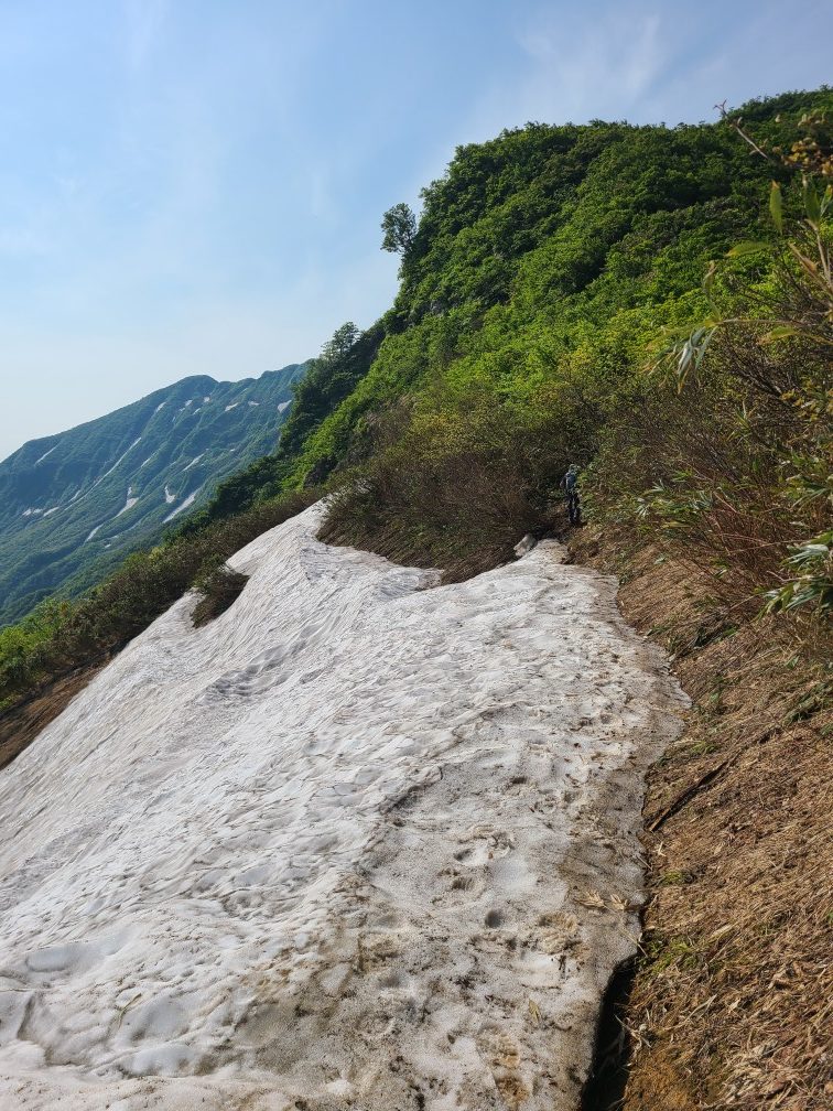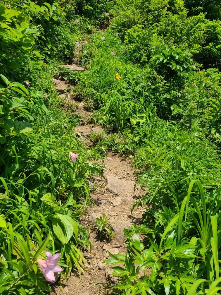 この日、長岡市が最高気温35.4度とニュースで言っていた通り暑い日でした。暑くなると思い前夜発にして朝早くから歩き始めました。以前4月に来たときは雪がありかなり下からのスタートでしたが雪のないときはその時に行った最高点まで車で入れました。大岳までは樹林帯の急登です。前回の杣添尾根と同じ我慢の登りです。途中イワカガミやキクバオウレンの実、チゴユリなど高山植物に癒されます。ヒメサユリもありましたがまだ蕾。2時間で大岳に着きました。三角点のところに1輪だけ咲いていて出迎えてくれました。大岳からの守門岳は雄大で男前。雪のある時はここから東洋一といわれる雪庇が見られるようです。次回ぜひ見てみたい。ここからの下りがお待ちかねのヒメサユリ街道です。蕾が多かったですがたくさん咲いていました。キスゲも3つほどありました。青雲岳まではお花がいっぱい。シラネアオイ、ショウジョウバカマ、カタクリ、オトギリソウ、ミツバオウレン、ゴゼンタチバナ、マイズルソウ、アカモノ等々撮影が忙しかったです。青雲岳は台地の湿原で木道がありそこから間もなく守門岳最高点の袴岳です。遮るものがなくとても暑かったですが、展望を楽しみながら休みました。浅草岳、越後駒ケ岳、燧ケ岳、北には御神楽岳も。下りは暑さも増してきたのでゆっくり下りました。大岳の下り、道をふさいで水を入れ替えてる人がいてその人を注意している声に聞き覚えが、顔を見るとなんと同じ日に股関節手術をして病院で友達になりその後リハビリ山行を共にしたKさん、道をふさいでいたのはIさんでした。またまたばったりの遭遇でびっくりしました。13時に下山し守門温泉の白石荘で汗を流し、何度も休憩しながら帰りました。ヒメサユリは少し早かったけど全部咲くころはシラネアオイは見られなかったかもしれないので良かったです。