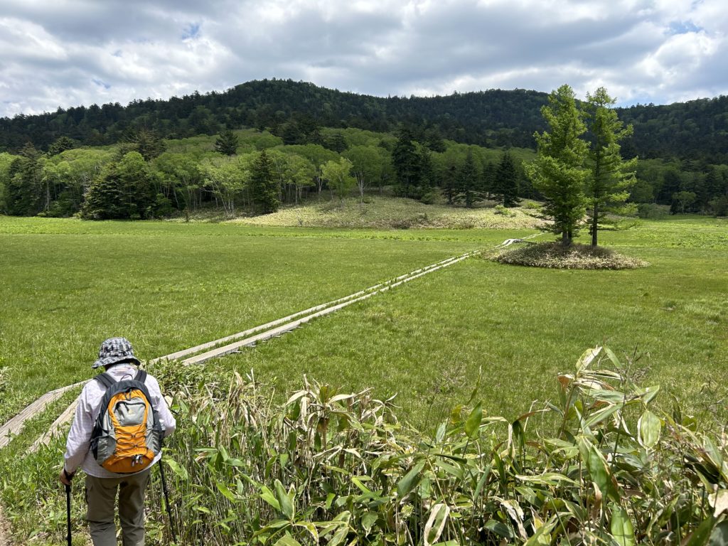 <詳細報告>宿(プチホテルハーベスト)で朝食をお弁当にしてもらい、5:50には宿を出発したので、御池発6:30シャトルバスに乗車することができ良かった。シャトルバスの混みを予想していたのだが、この時間帯でのバスの乗車人員は7名と少なかった。だだっ広い御池駐車場も車は20台程と少なく以外だった。時期もあるが、平日の水曜日あたりは穴場かもしれない。6:50沼山峠に到着、登山口を7:10に出発し、ゆっくりのんびりと歩く。沼山峠で腹ごしらえ、おにぎり弁当が凄く美味しかった。峠を下ると目の前は大江湿原だ。キスゲの開花にはまだまだ早いようだ。グリーン一面の湿原では白いワタスゲがゆらゆらと気持ちよく揺れていて凄く可愛らしかった。私たちの歩きはビスタリーなので、幸いにも湿原には私たちの他には誰も居ず、湿原を独り占めならぬ二人占め、凄くラッキーだった。湿原にはワタスゲの他に、背丈の低い薄紫のタテヤマリンドウが一面に咲き誇り我を主張、数は少ないが紅紫色のハクサンチドリや高さがあまりないイワカガミ、所々に僅かながら水芭蕉も残っていて目を楽しませてくれた。尾瀬沼ビジターセンター近くで小休止、ここでも2人のハイカーとすれ違っただけだった。今回は、三平下でピストンの予定だったが、6:30のバスに乗車できた事で時間に余裕ができ、天気も安定していて連れも元気でまだまだ歩けるとの事だったので、急遽沼一周に切り替える事にした。三平下手前の開けた湖畔からの尾瀬沼と燧ケ岳の山容がとても美しかった。この先から、反時計回りで歩いてきた15名程のハイカーとすれ違った。時間的に7時のシャトルバスに乗車した人達だろう。少しずつハイカーが増えだした。沼尻手前の小沼湿原にもワタスゲ、タテヤマリンドウ、水芭蕉、イワカガミ、僅かにモウセンゴケも見られた。沼尻休憩所に着いたら売店でコーヒーを注文し、燧ケ岳と尾瀬沼の景色を眺めながら至福の一時をと思っていたのだが、残念なことに休業中だった。驚いたのことに、休憩所の中に自動販売機が設置されていた。(まだ中は空の状態)沼尻休憩所は不定期にオープンするそうだ。公衆トイレはとても奇麗だった。(靴を履いたままで、大きいスリッパを履きトイレに入る)沼尻休憩所出発が10:40、のんびり歩きながら12:00にはビジターセンター方面と大江湿原方面への分岐に着いた。予定では15:50のバスに乗車するはずだったが、時間が早いので、乗車時間を13:30に早めることにした。ここからもだんだんとハイカーが増え出し、小学生の団体ともすれ違うようになり早朝の静けさとは打って変わり、賑やかな中での戻りとなった。バス出発時刻ギリギリ6分前に沼山峠に着き安堵、14:00前には御池到着、今日も桧枝岐に宿泊するので気持ちに余裕が持てた。14:30に御池を出発し駒の湯で汗を流し民宿(翌檜)に向かった。