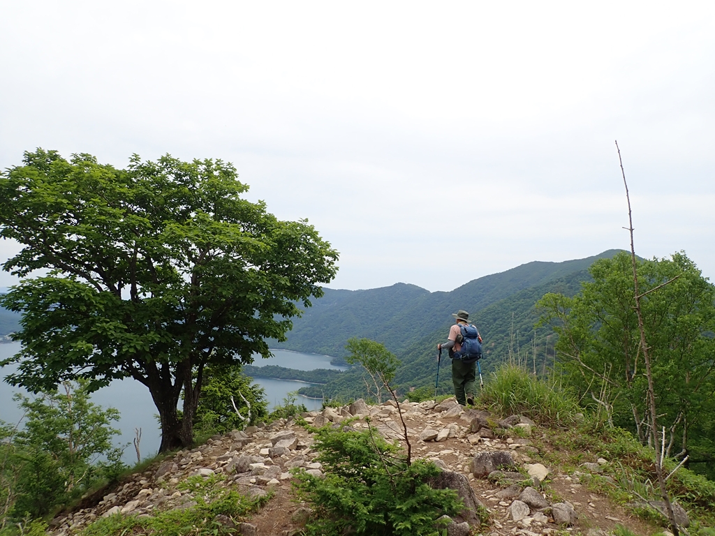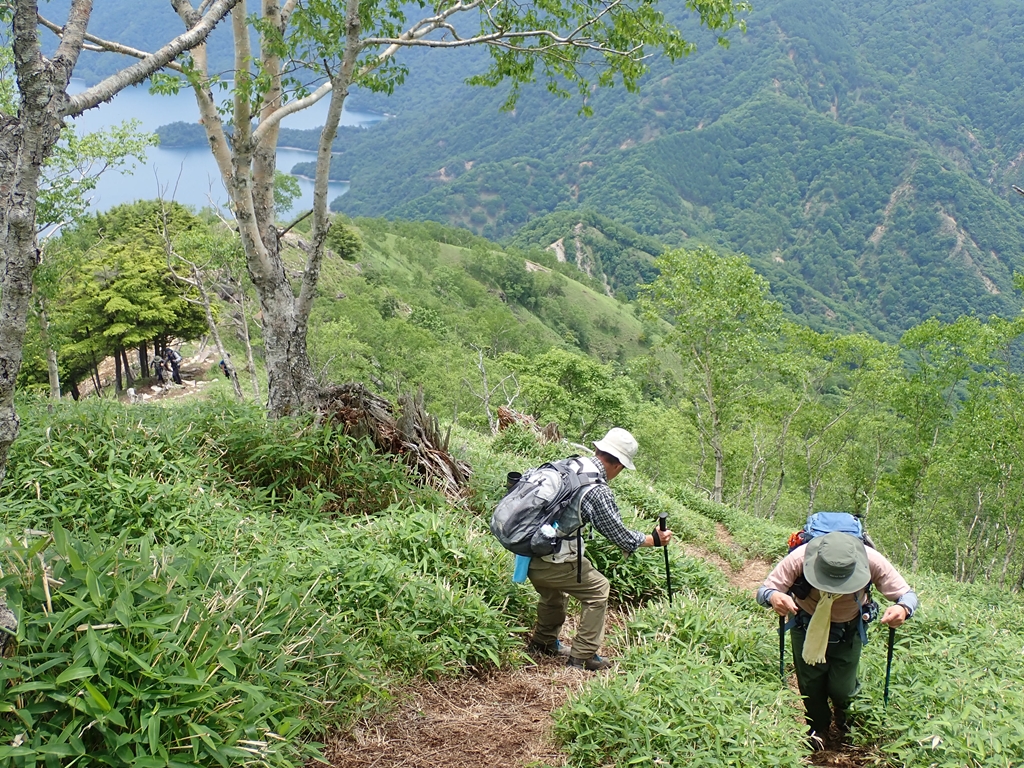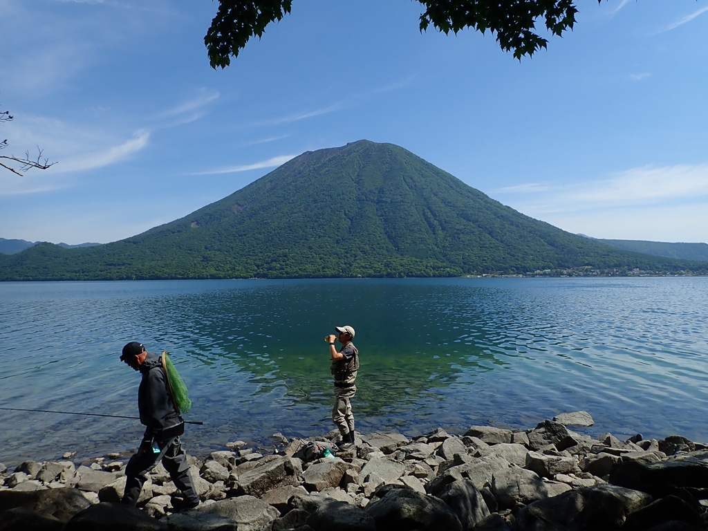 しばらくは湖畔のルートで、ショートカットして英国大使館別荘とイタリア大使館別荘前を通過した。その先では呑気にあちこちの倒木を見ながら歩いたが、かつてショウキランの大株を見て感動したこともあるのだが、今回は全くそれを見ることはできなかった。ただ時期が変わっただけなのか、消滅してしまったのか気になる。八丁出島に行ってみることにした。私はまだ歩いたことがない。東側から入ったが踏み跡が薄く面倒なので途中で尾根に登った。なだらかなコルに下りて次の尾根の東側を進んだが歩きづらいトラバースだった。突端近くに降りると少し平らな場所があった。階段状になったところを下りると出島の突端に出た。男体山が正面に聳えている。釣り人が糸を垂れていた。ブラウントラウトを狙っているというが我々が見ている間に竿がしなることはなかった。突端からは西側の斜面を戻った。東側に比べると踏み跡が明確で歩きやすかった。