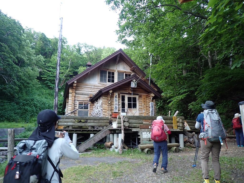 朝3時前に起きて、野営場を4時少し前に出発した。岩尾別温泉「地の涯」の前には約30分で着いた。未舗装部分に空きがあり2台駐車できた。登山者用トイレもあり利用できた。そこから数分で木下小屋で、その脇が登山口となっている。