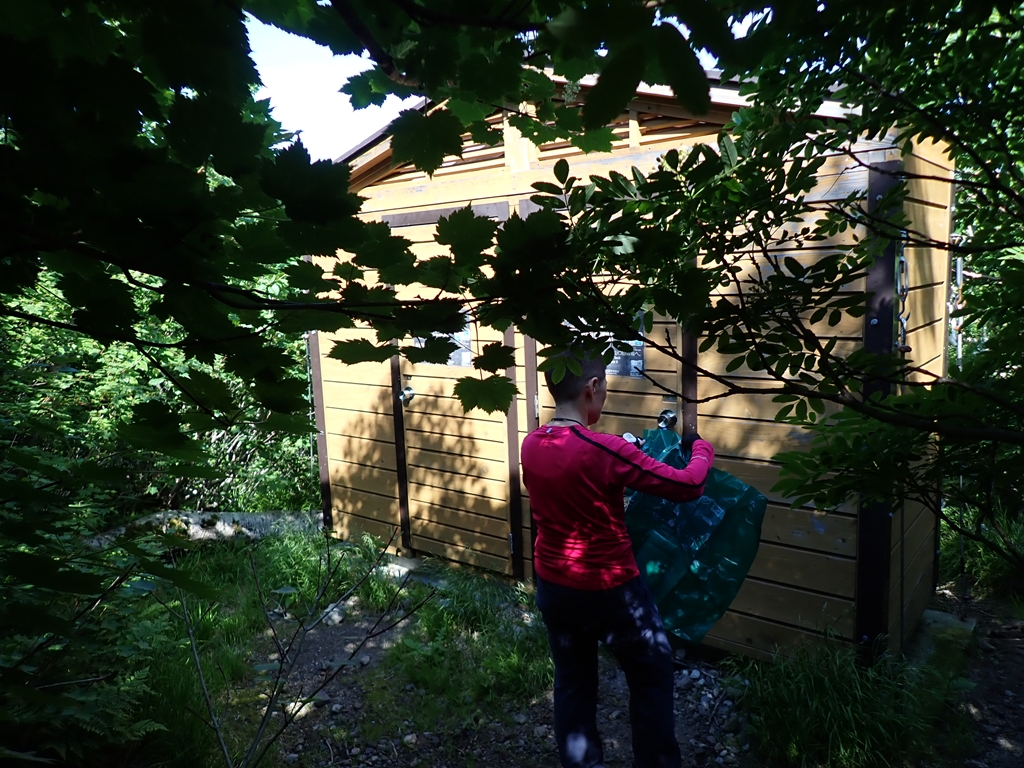 登山口を1段登ると木の祠が祀られていて、そこで安全登山を祈願した。ジグザグに登り、20分少々で尾根に乗ることができた。そこでウエア調整。今日は暑くなりそうだ。周りは針葉樹と広葉樹の混合林で、樹林の密度は粗く割と明るい尾根だ。1時間弱で「オホーツク展望」に着いたが、オホーツクの海は樹間にぽっかり空いた隙間からぼんやりと見えるだけだった。弥三吉水はすぐ上で水が湧いているようなので浄水せずに飲んだ。水は冷たくて美味しい。水量も多かった。その先の極楽平はごく緩い傾斜が続き歩きやすいのだが、ヒグマが出没する場所らしいので気が休まらない。今日はショルダーバッグに熊スプレーを携帯している。前日に封を破いたものだ。そこから先は所々で木が登山道に張り出しているので頭をそれにぶっつけないように注意しなくてはならない。私は昨年斜里岳の記憶が鮮明だったのでヘルメット装着していたので少し気楽だった。仙人坂はジグザグに登って行く。銀冷水で大休止。そこの水場は小さな沢でかなり上から流れてきているので、エキノコックス対策で浄水してから飲んだ。その水場の横に携帯トイレブースが2つあるのだが、男小用は裏でせよとなっているのでそれに従った。登山者が多いと行列ができるので致し方ないのかもしれない。