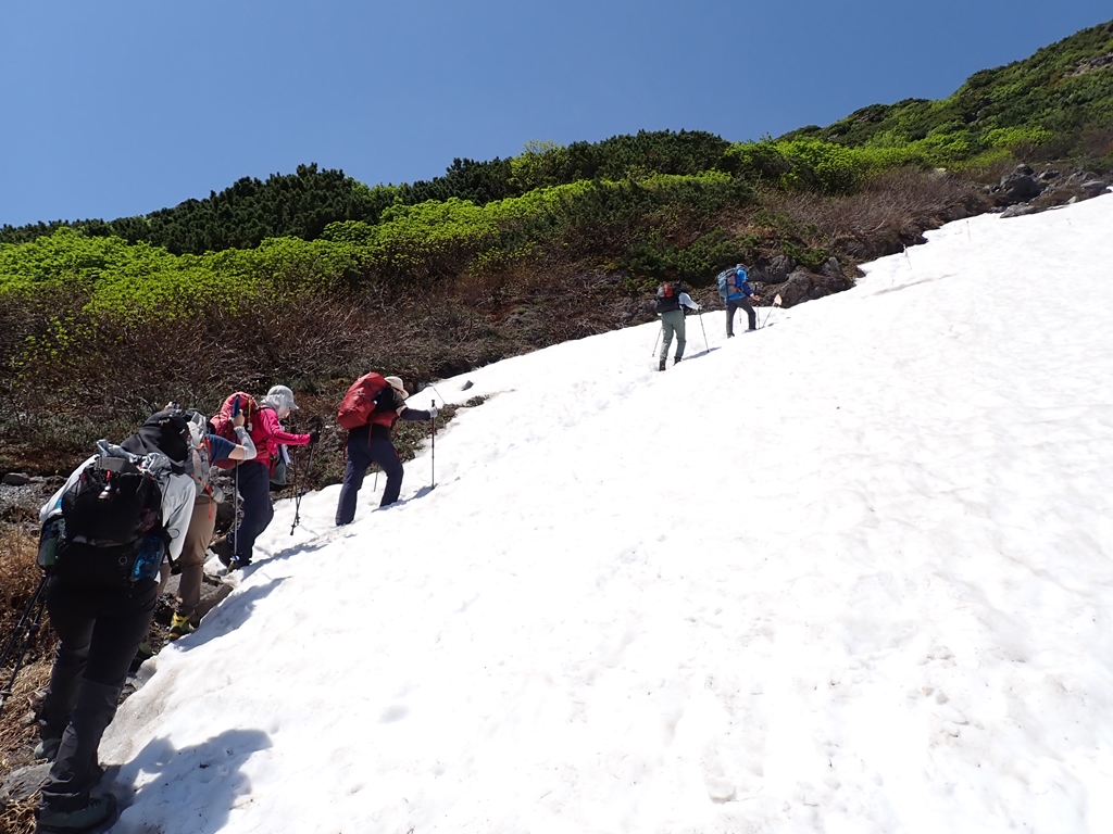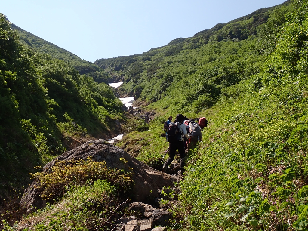 小休止して下山開始。岩場を慎重に下り、羅臼平で小休止。大沢の雪渓の下で大休止。雪解けの沢水は冷たくて美味しかった。浄水してポットに入れた。その後は小休止を何度か取りながらひたすら下る。最後に尾根から木下小屋への下る地点に着いた時はホッとした。心配していたヒグマとの遭遇は、幸運なことに経験せずに下山することができた。下山中は各所で嫌な臭いを感じたが、それがヒグマのものかどうかはわからない。