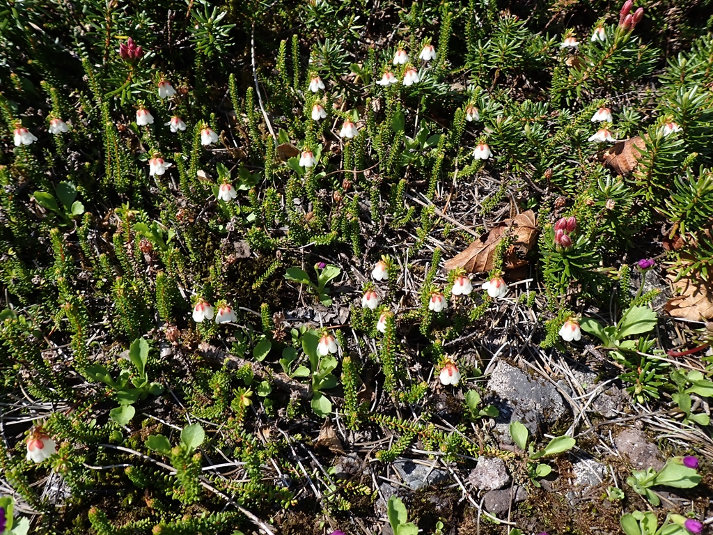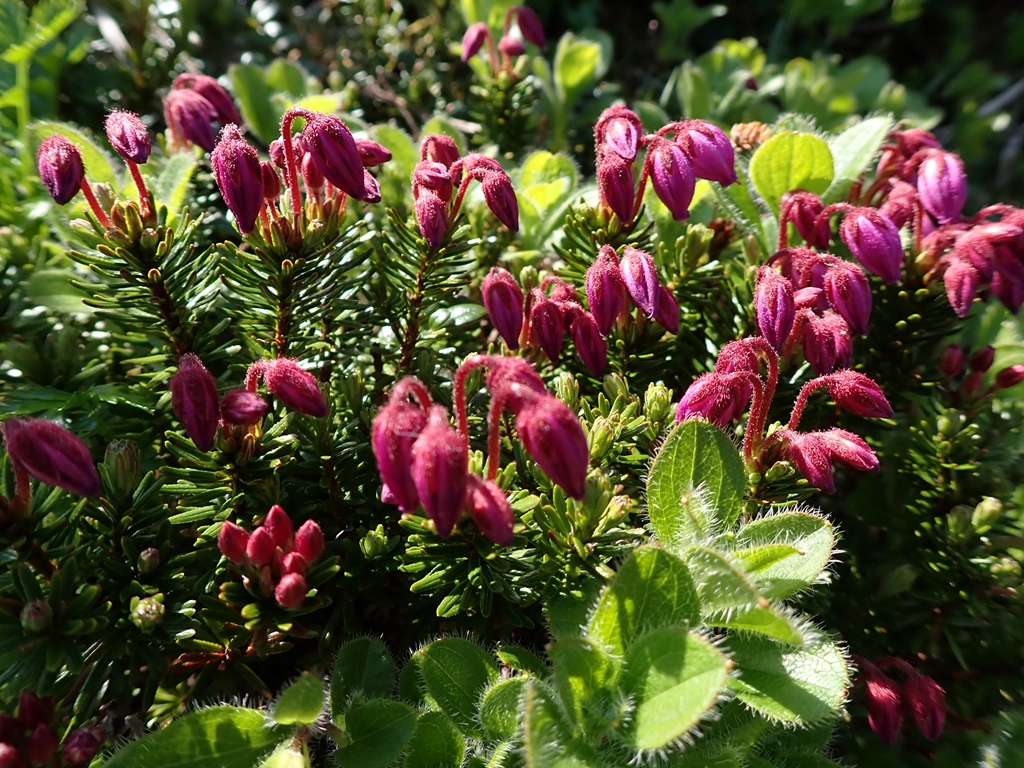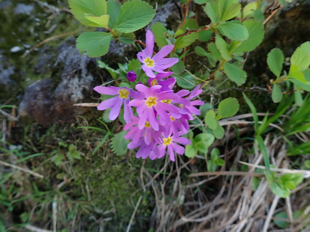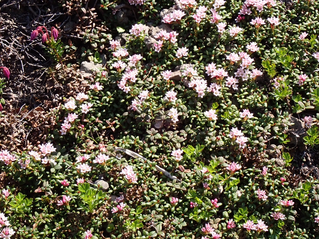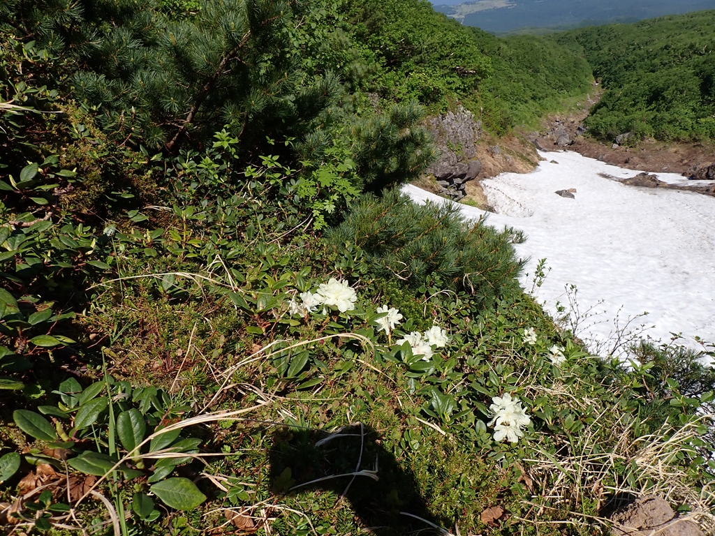 大沢入口の標識を過ぎると、エゾコザクラが見られるようになった。本州ではハクサンコザクラだがエゾ~との違いは分からない。雪は少し残っていて少しばかり雪渓歩きを楽しめるが、大部分は雪解け後の汚れた踏み跡を辿ることになる。段差の大きい箇所もある。コザクラだけでなく、ツガザクラ、チングルマ、キバナシャクナゲ等の花を見ながら標高を上げていく。振り返ると知床の海が見えた。日差しが眩しい。傾斜が緩やかになると羅臼平に着いた。大休止してエネルギー補給した。見上げると羅臼岳の頂上部分が要塞のように見える。あの要塞に登るのだ。だれかが「私ここで待っている」といえば簡単に同調しそうだった。だが、誰もそのような声をあげない。行くしかないのだ。前日まで「私は羅臼平で待ってるわ」と言っていたひなぎくさんも快調のようだ。