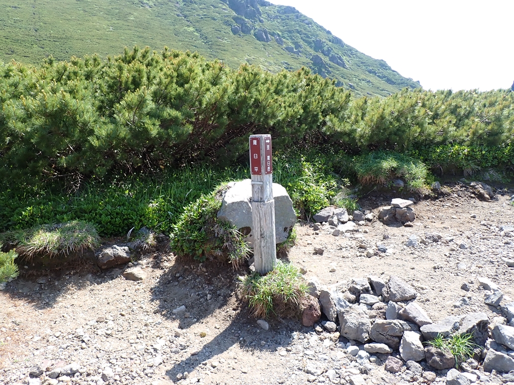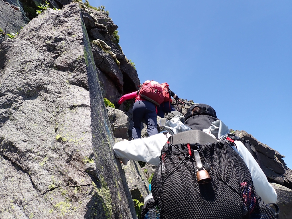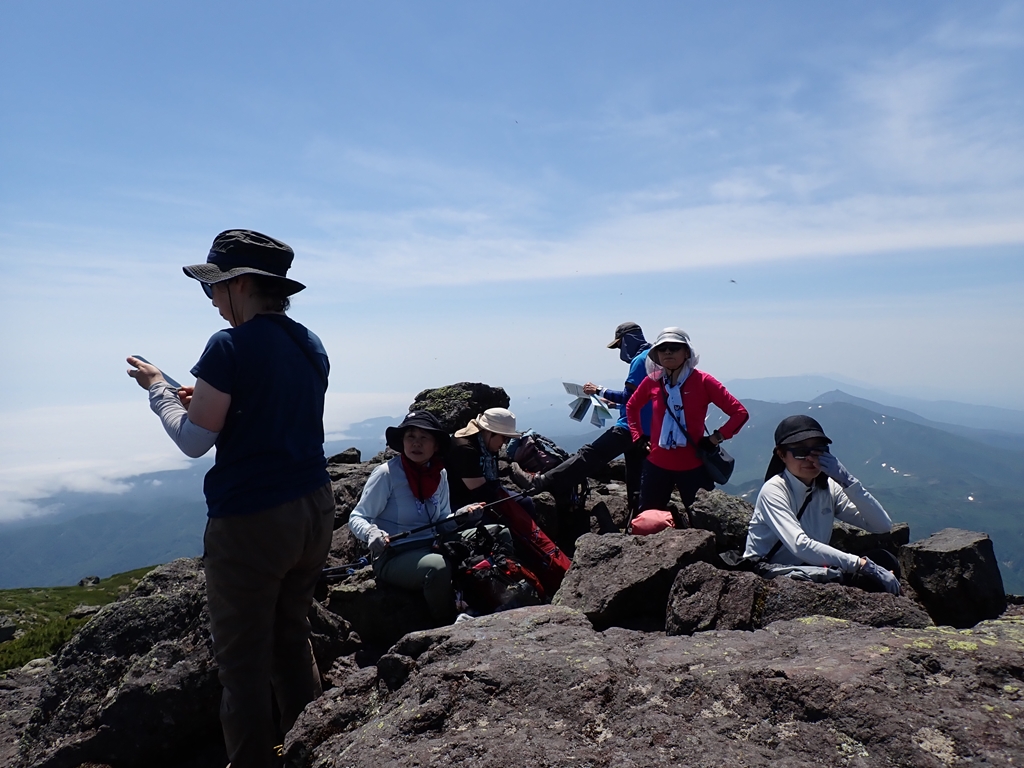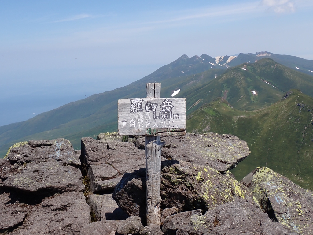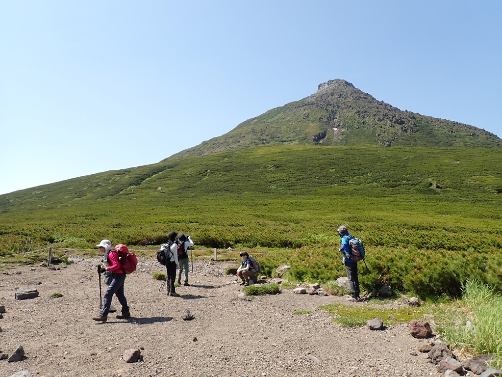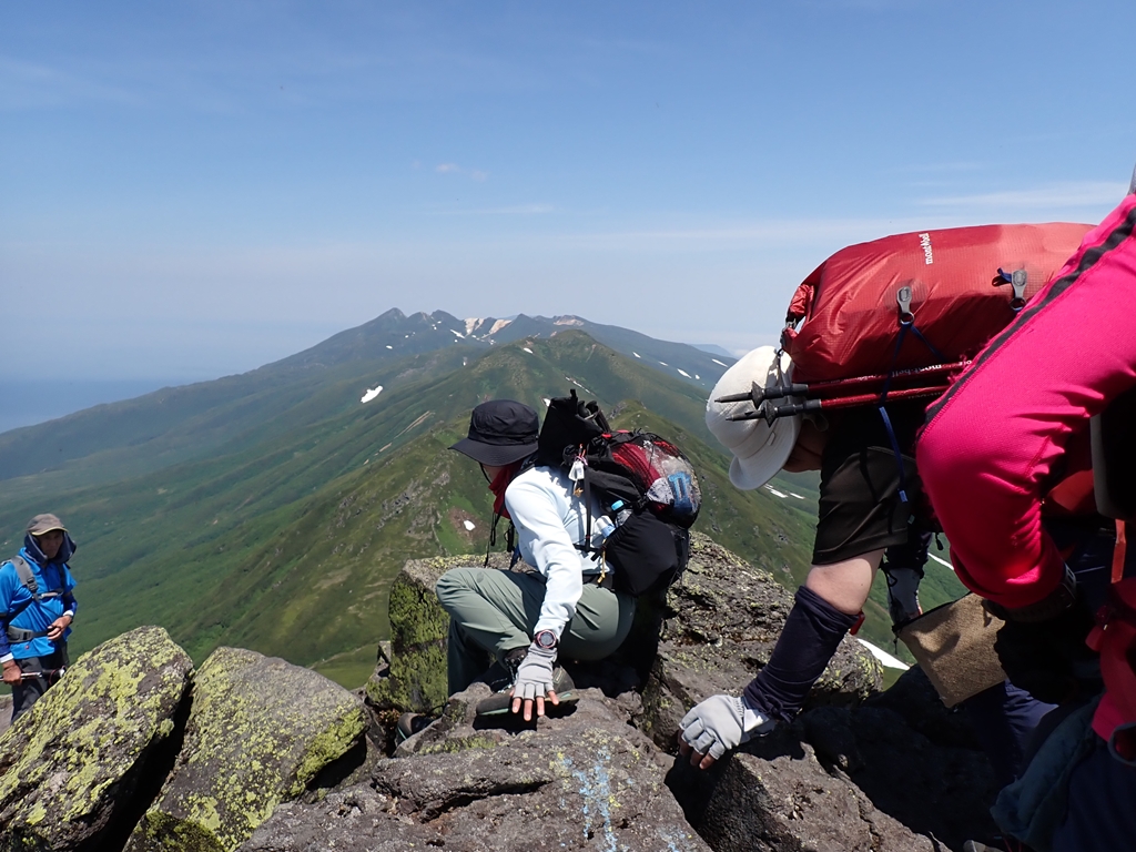 羅臼平からはハイマツに囲まれた登山道を緩やかに登って行く。羅臼温泉への分岐のすぐ上に岩清水があるのだがどこで水が出るのか分からなかった。岩からポタポタ雫が落ちているのだがそれを集めるのなら気の遠くなる話だ。岩清水から急登となる。その先で少し雪渓を登る。その上で賑やかなグループと行き交う。ツアー一行らしい。岩場の急登が続くが岩は安定していた。だが、日に照らされた岩は熱かった。ペンキで進行方向を案内してくれていたのが有難かった。最後に大きな割れ目を跨ぐ場面が緊張した。