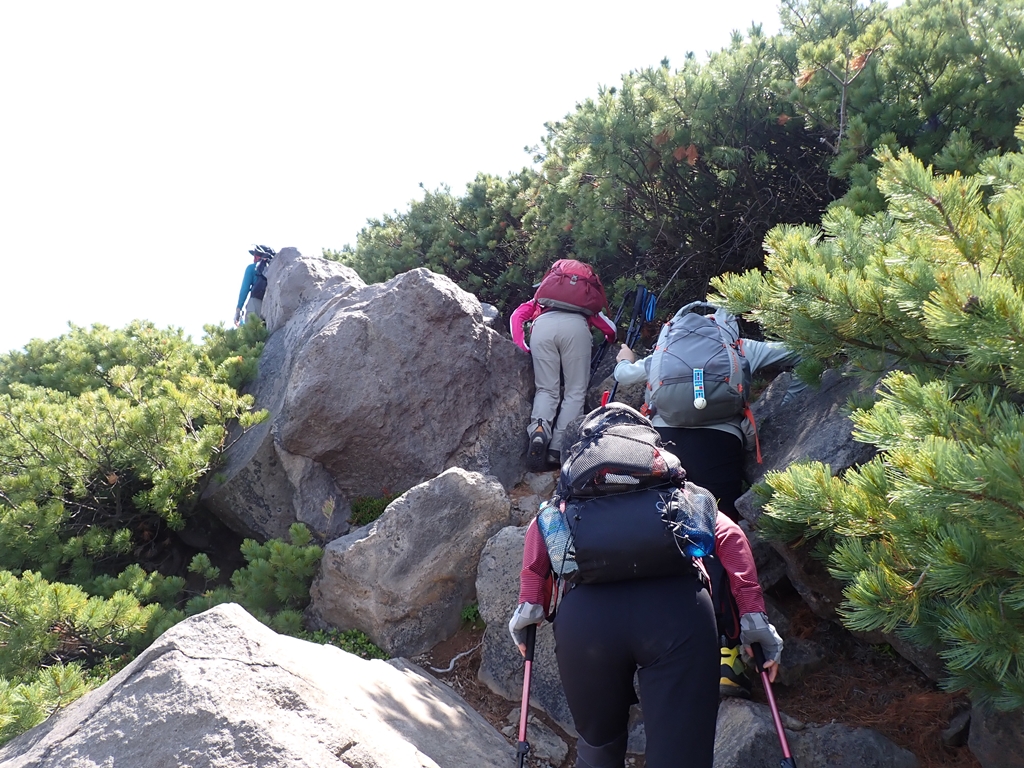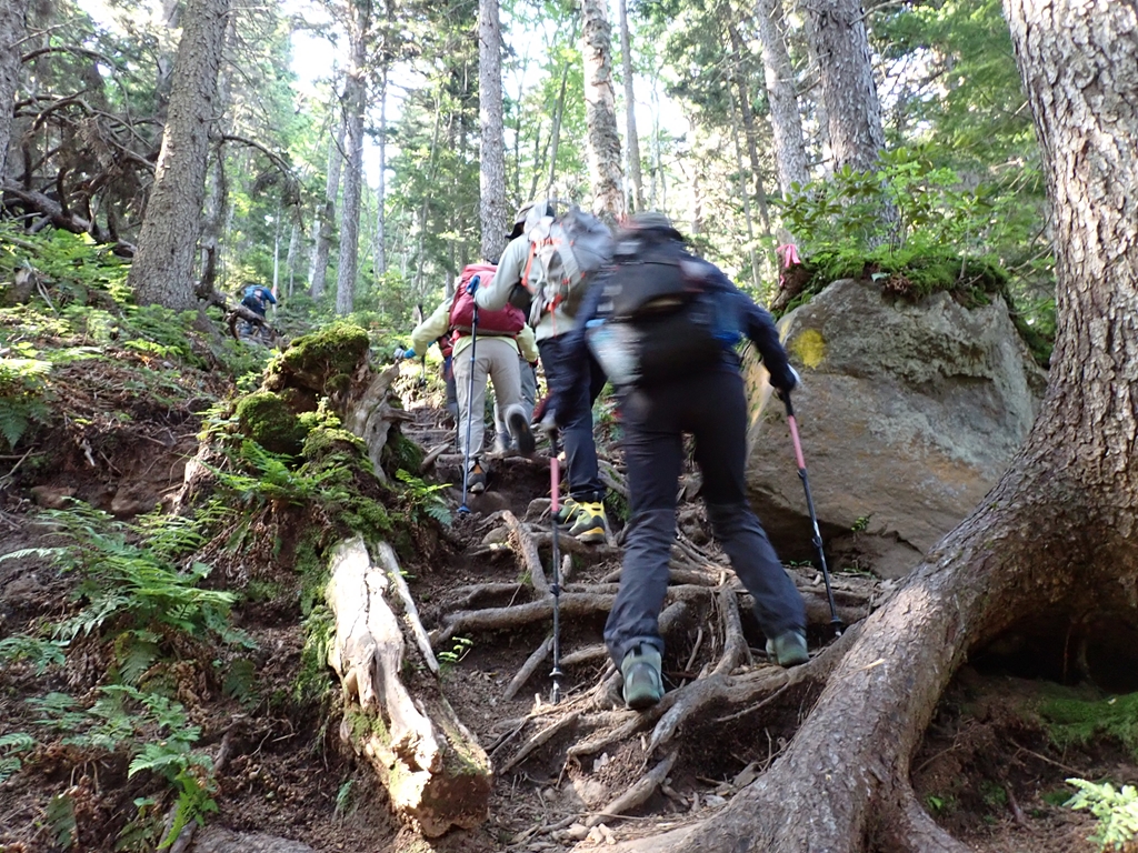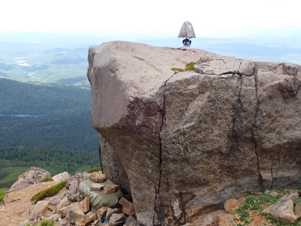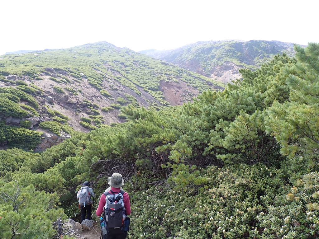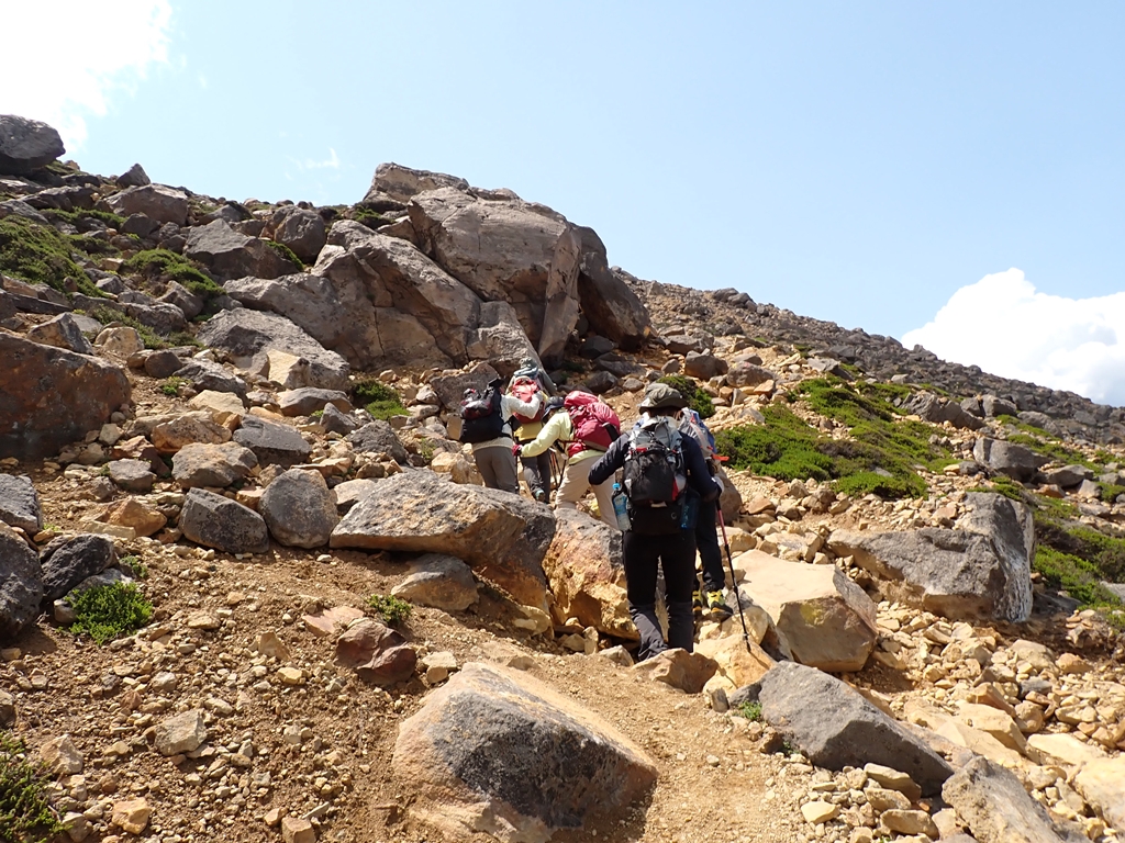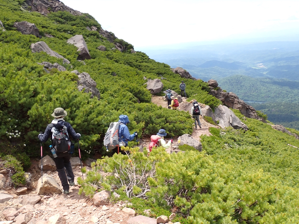 最初は針葉樹林内の根っ子が多い登山道を登る。合目標識が小刻みに出てきて分かりやすい。3合目を過ぎるとやがて周りはハイマツ帯となり、枯沢を渡るとメアカンキンバイが目立ってくる。ハイマツが少なくなってザレ地にコマクサが咲いていたがロープが張られていて近寄れなかった。5合目に着いた。麓のオンネトーが綺麗に見えた。8合目を過ぎる頃にはハイマツは一気に減って丈も低くなる。ハイマツでも生育しずらい厳しい環境なのだろう。風が強くなった。下山してくる人が「山頂は爆風ですよ」と伝えてくれる。予報では朝は強いが次第に弱くなる筈なのだが。9合目を過ぎると一気に強風が吹き荒れた。重心を低くして、火口内を覗きこむと、数か所から噴煙が噴き出していた。強風の中、ザレた登山道を登る。ストックのゴムは外して、体のバランスを維持しやすくした。風が強くなると動きを止めて耐風姿勢をとる。
