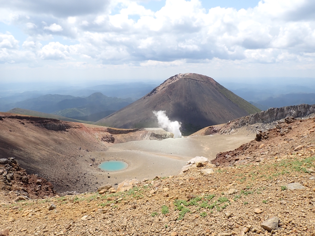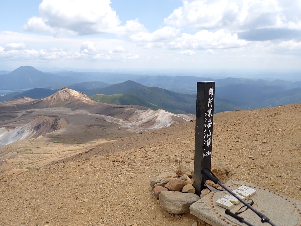 山頂に到着。山頂標識が昨年あったものと違って、随分と立派なものに置き換わっていた。そこで引き返すものと思っていたら、ともさん夫がザレ場を少し下って行った。何かが見えるようだ。私達も続くと、火口にエメラルド色の池が見えた。高原地図に「青沼」と記されているものだろう。その先に阿寒富士が聳えて良い構図だった。