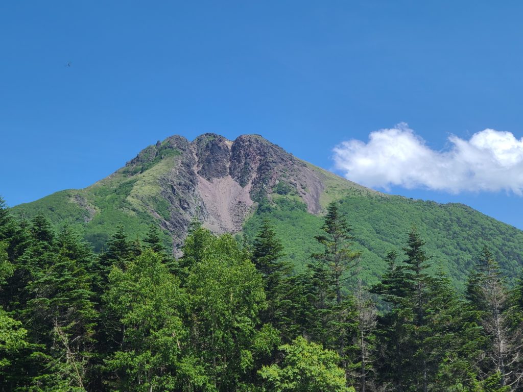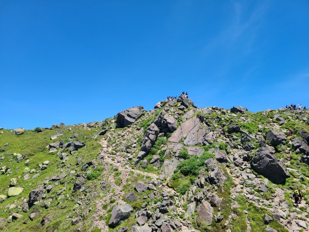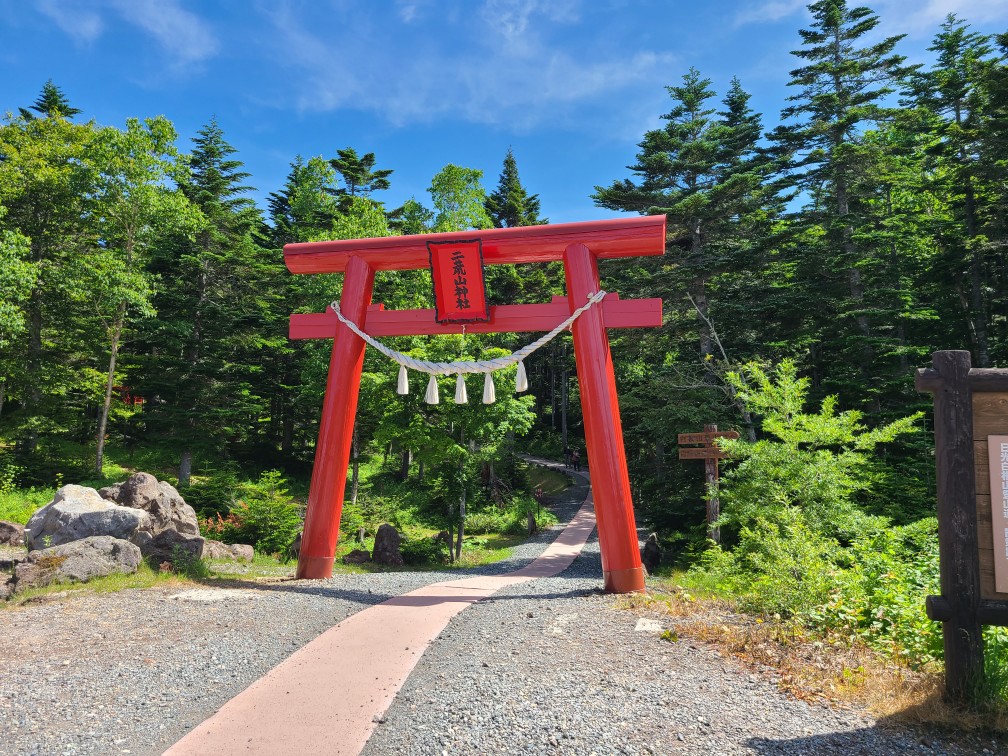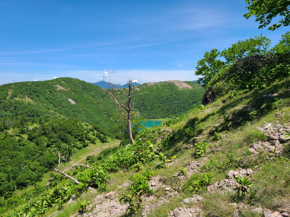 ロープウエイ駅からのコースは歩いたことがないため、清掃登山を兼ねて下見に行ってきました。開会式を終えてからロープウエイ駅に移動しました。遊雪会の会長さんがロープウエーチケットをまとめてくださりいただいてすぐに乗り込みました。山頂駅から鳥居をくぐり樹林帯の整備された道を進みます。高度が2000mを越えているので暑くありません。周遊コースの分岐をいくつか通過し白根山方面へ向かいます。ロープウエーで手軽に来られるため親子登山が多く見られました。肩からは森林限界となり富士山のようながれ場の道になりました。ここは慣れないと大変かなと思いました。天気が悪いはずでしたが快晴で展望が広がります。ハクサンフウロ、アズマシャクナゲ、コケモモなどの高山植物もいっぱい出てきました。山頂は大勢の人で賑わっていました。ゴミを拾った袋とともに写真を撮ってもらいどこでお昼にしようかとうろうろしているとkさんに会い周回したほうがいいよ~というので弥陀が池方面へ下山することにしました。こちらは岩場の急坂で4月下旬の雪のついたときのほうが歩きやすかったです。ひなぎくさんが待っているので足早に下山しました。ひなぎくさんはテラスで待っていてそこで一緒にソフトクリームを食べました。涼しい風が吹き下りたくないねと話しながら1時間くらい涼んでからロープウエーに乗り下山しました。入浴はパスして帰路につきました17時半には帰宅しました。