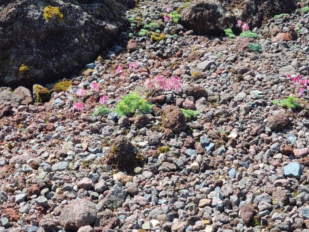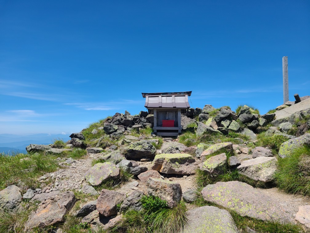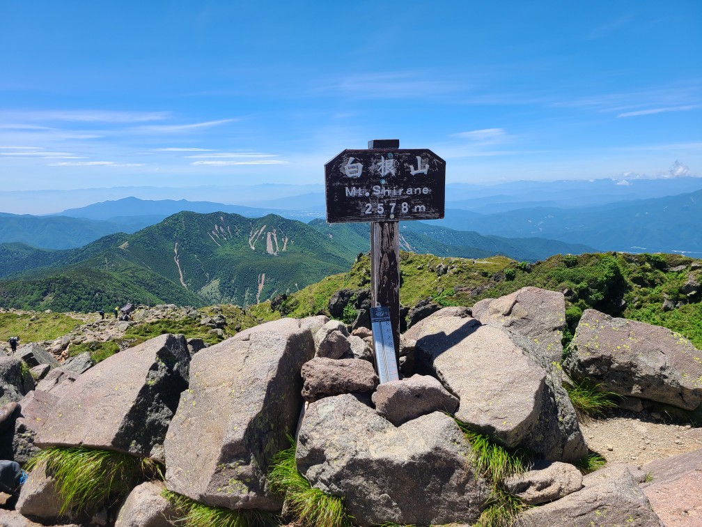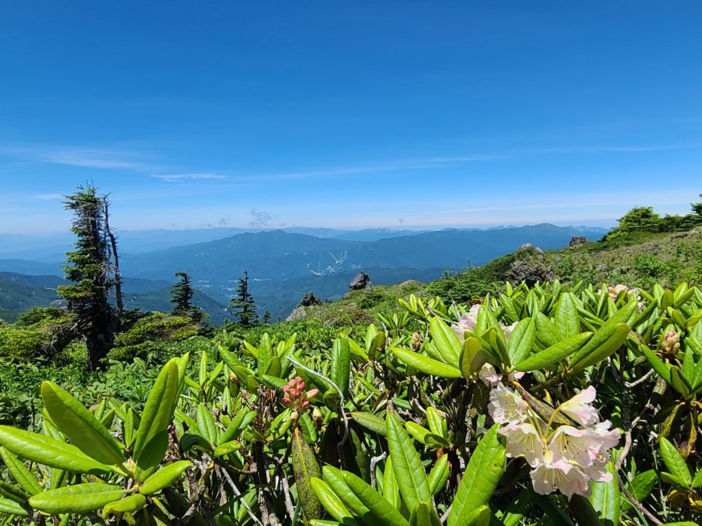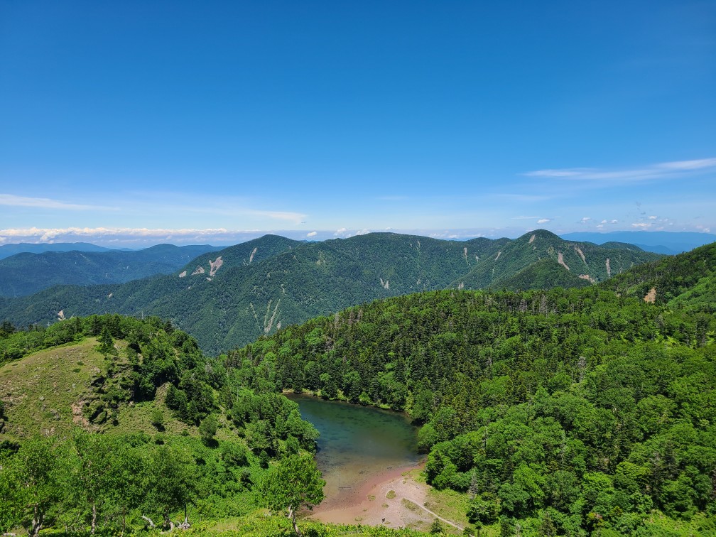 ロープウエイ駅からのコースは歩いたことがないため、清掃登山を兼ねて下見に行ってきました。開会式を終えてからロープウエイ駅に移動しました。遊雪会の会長さんがロープウエーチケットをまとめてくださりいただいてすぐに乗り込みました。山頂駅から鳥居をくぐり樹林帯の整備された道を進みます。高度が2000mを越えているので暑くありません。周遊コースの分岐をいくつか通過し白根山方面へ向かいます。ロープウエーで手軽に来られるため親子登山が多く見られました。肩からは森林限界となり富士山のようながれ場の道になりました。ここは慣れないと大変かなと思いました。天気が悪いはずでしたが快晴で展望が広がります。ハクサンフウロ、アズマシャクナゲ、コケモモなどの高山植物もいっぱい出てきました。山頂は大勢の人で賑わっていました。ゴミを拾った袋とともに写真を撮ってもらいどこでお昼にしようかとうろうろしているとkさんに会い周回したほうがいいよ~というので弥陀が池方面へ下山することにしました。こちらは岩場の急坂で4月下旬の雪のついたときのほうが歩きやすかったです。ひなぎくさんが待っているので足早に下山しました。ひなぎくさんはテラスで待っていてそこで一緒にソフトクリームを食べました。涼しい風が吹き下りたくないねと話しながら1時間くらい涼んでからロープウエーに乗り下山しました。入浴はパスして帰路につきました17時半には帰宅しました。