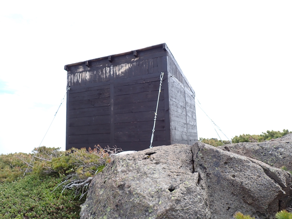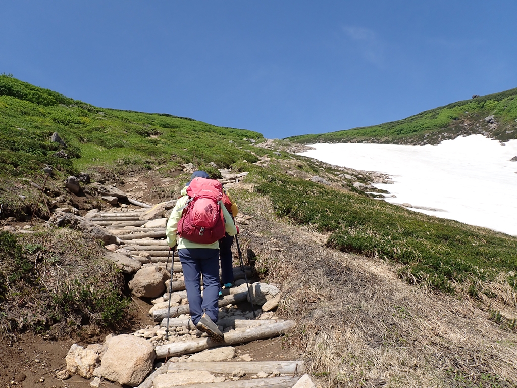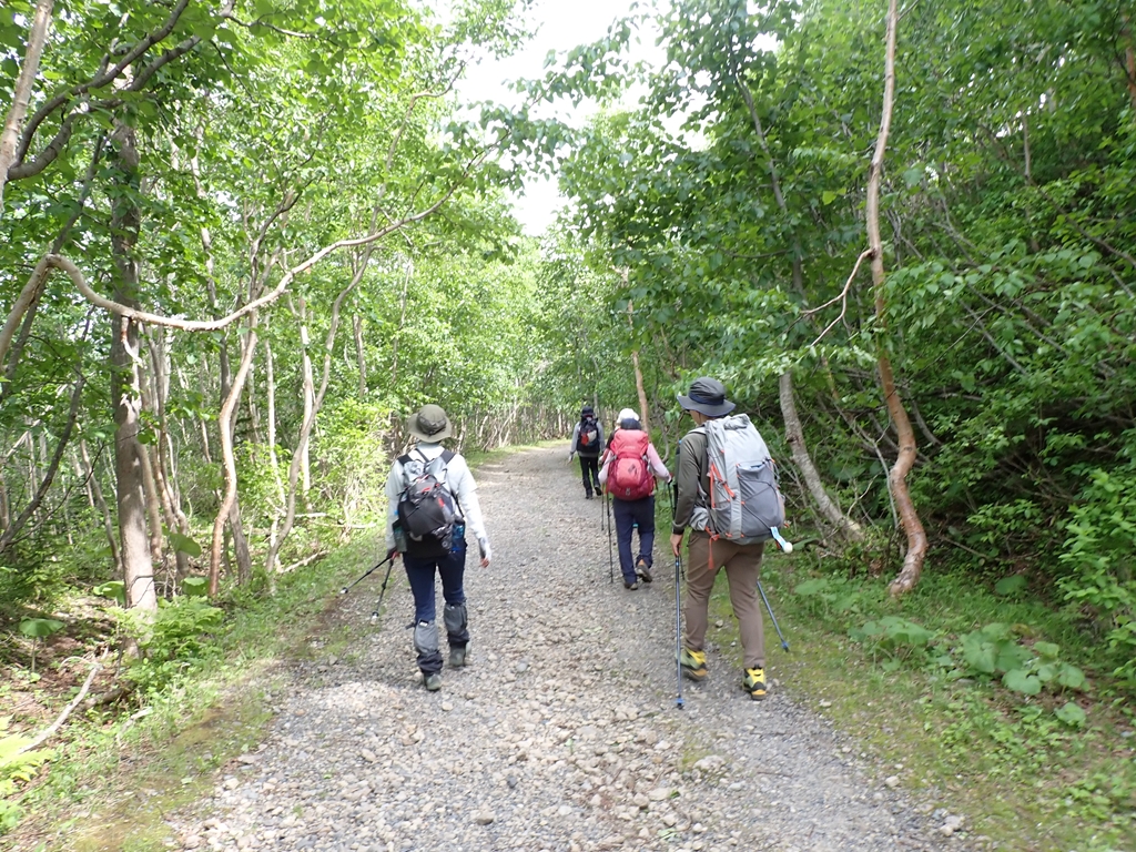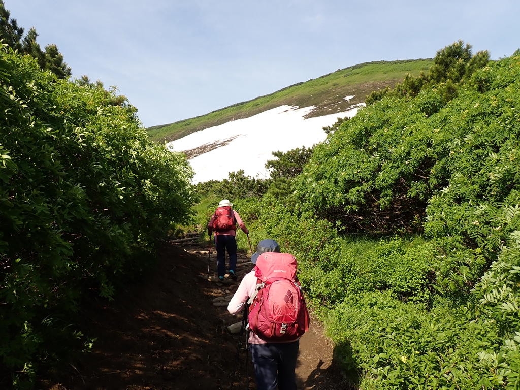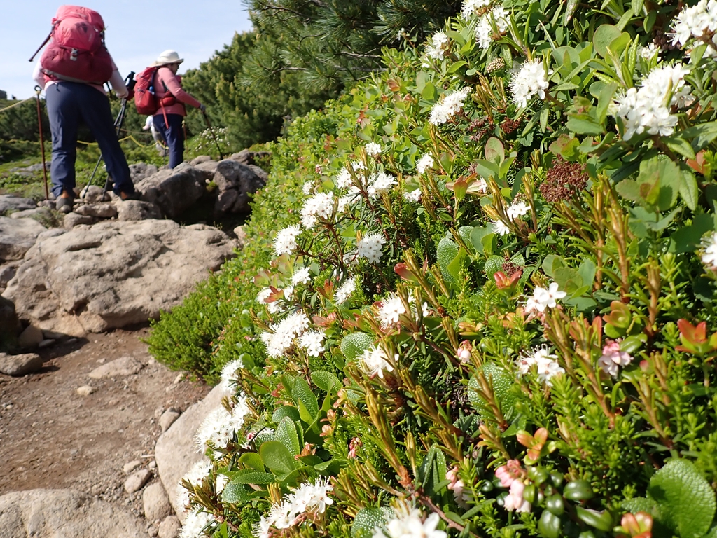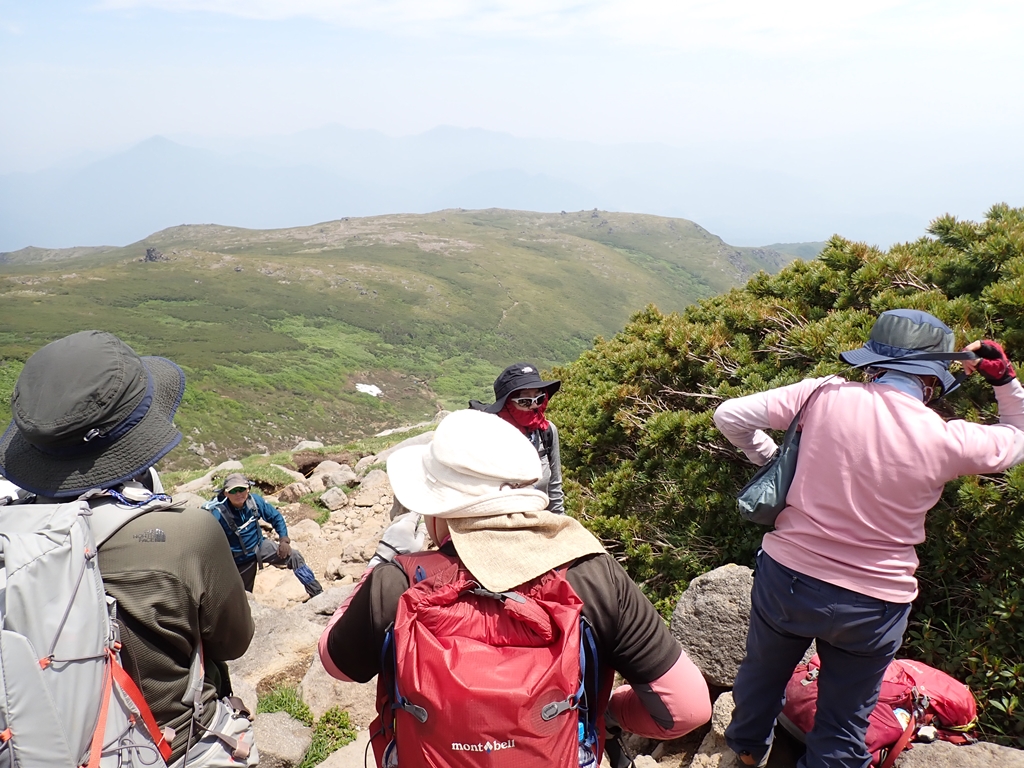 登山道わきにはいろいろな花が咲いている。多いのはイソツツジ、シモツケ、ゴゼンタチバナ、ウコンウツギなどだが、名前がでてこないものもいくつかあり、写真撮影に時間がかかる。チシマヒョウタンボクは面白い花だった。ところが、第一花園に着くと花が少ない。ひなぎくさんによると以前は花で埋まっていたそうなのだが。標高1700m辺りに木陰の展望台があったのでそこで一休み。今日は日差しがきつく、木陰がうれしい。展望すると屏風岳の尖った山容が見えた。