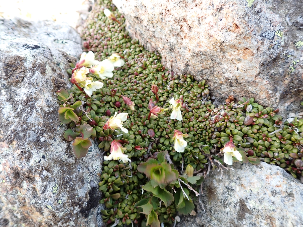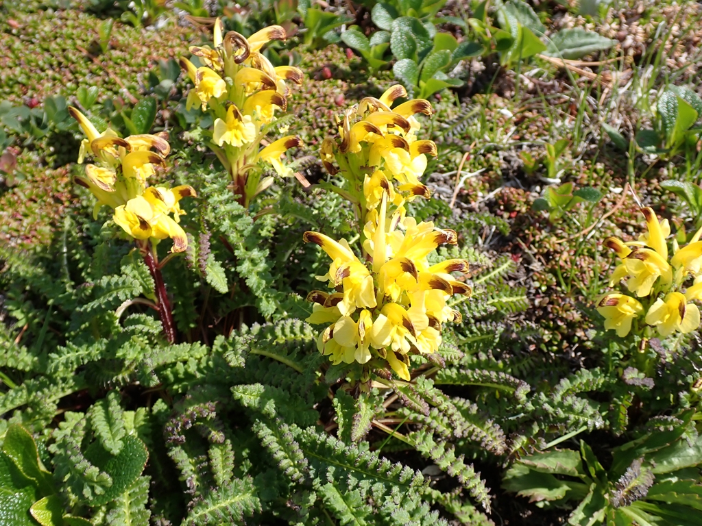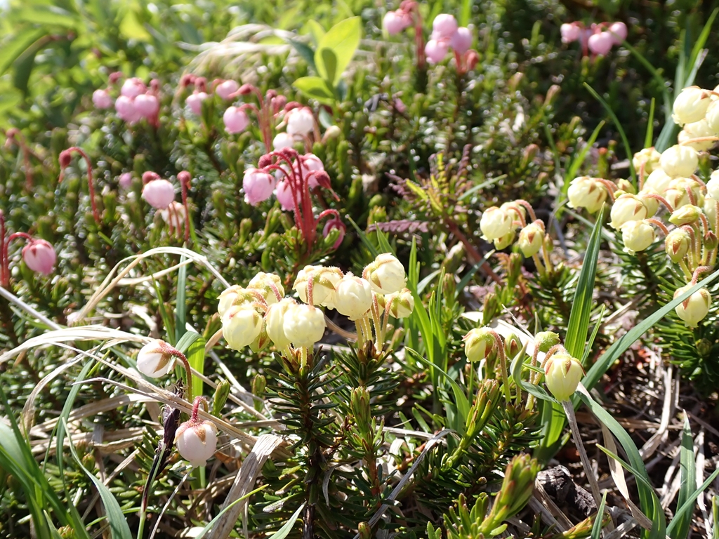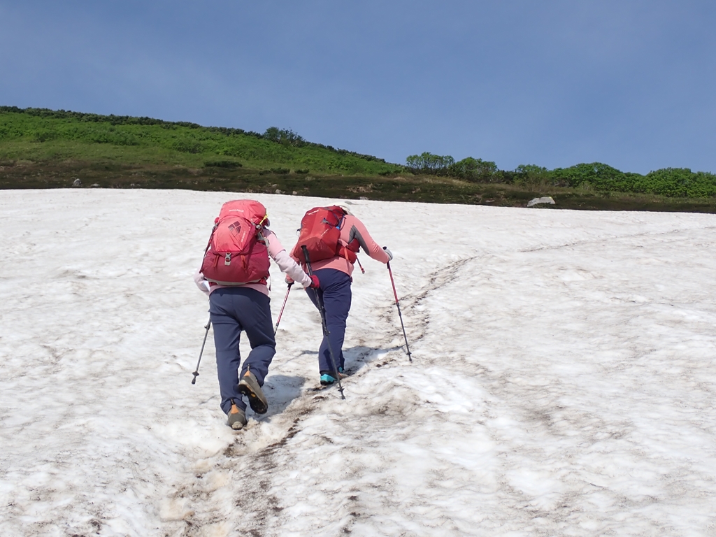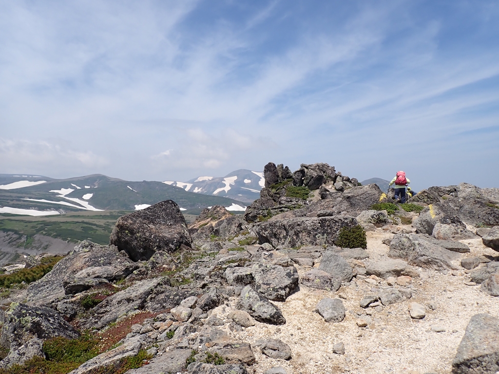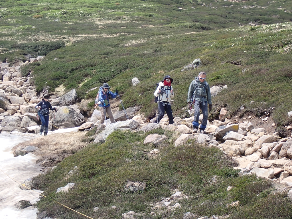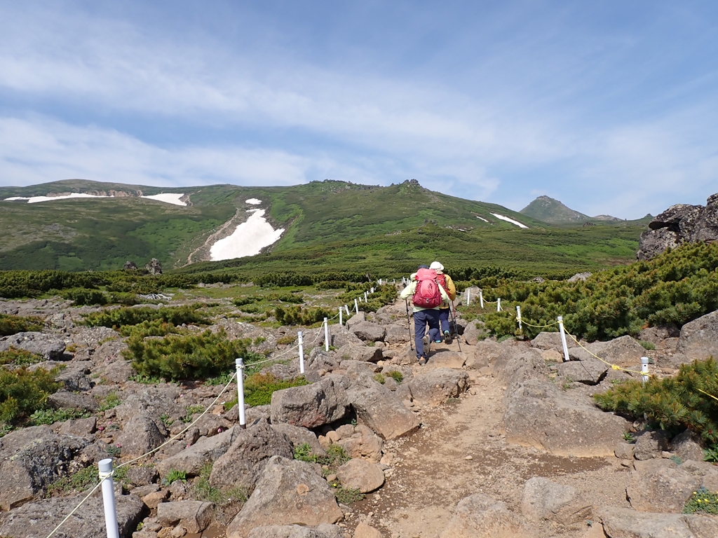 その先は傾斜が緩やかになって、エゾコザクラ、チングルマ、ミネズオウの群生が見られた。標高1750m辺りは残雪があり、雪上歩きが楽しめる。凍結していないので歩きやすい。ツガザクラ、イワヒゲの群落を見ながら少し登ると、コマクサ平に着いた。名の通り、コマクサが見られるが密度は高くない。携帯トイレブースがある。チシマキンレイカ、キバナシオガマが見られたのはうれしい。その先で緩やかな沢を渡るがそこで小休止。その上は雪渓が残っていて、冷たい水が飲めた。もちろん、浄水した。右側に雪渓を見ながら登ると、雪渓を下る登山者がいた。快適に下って行った。雪渓を歩けば花は楽しめないが、登山道脇にはツガザクラなどの群落が見られる。東平にでると、風が強くなって、ウインドブレーカーを着た。何とか赤岳に到着。岩陰で強風を避けて一休み。もう少し先に行ってお花畑を楽しもうと歩きだした。遠くの稜線に4人パーティが小さく見えた。一人が先に進んで3人が追いかけるグループだ。健脚組がもう白雲岳から戻って来たのだと思った。私達ももう少し先まで行きたかったがあまりにも風が強くて引き返すことにして、赤岳まで戻った。