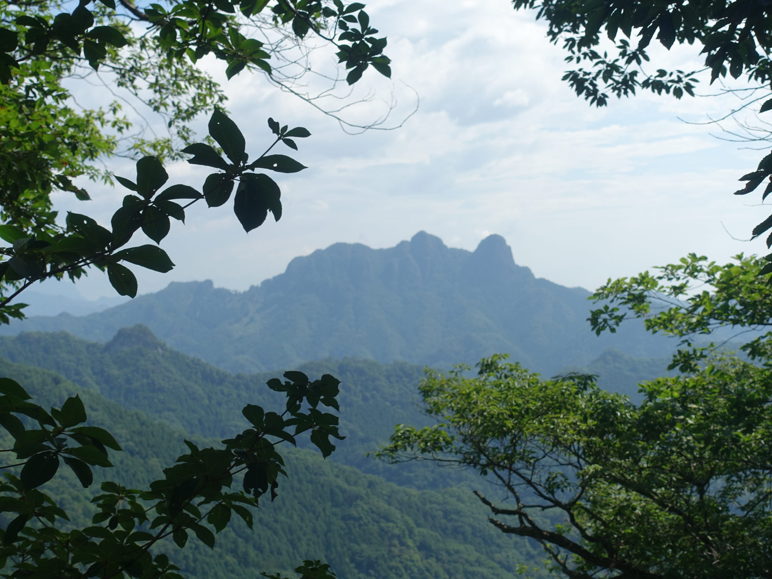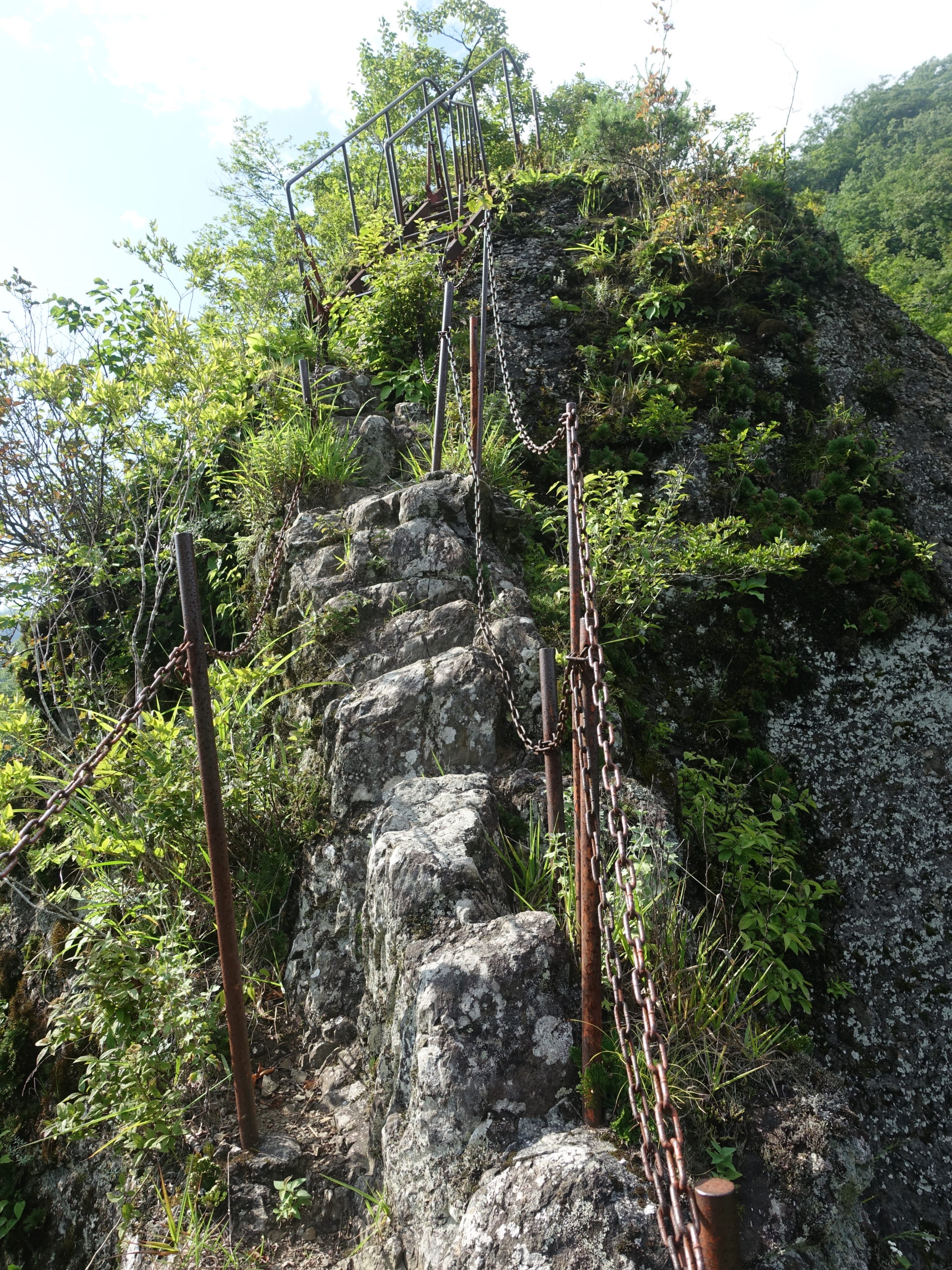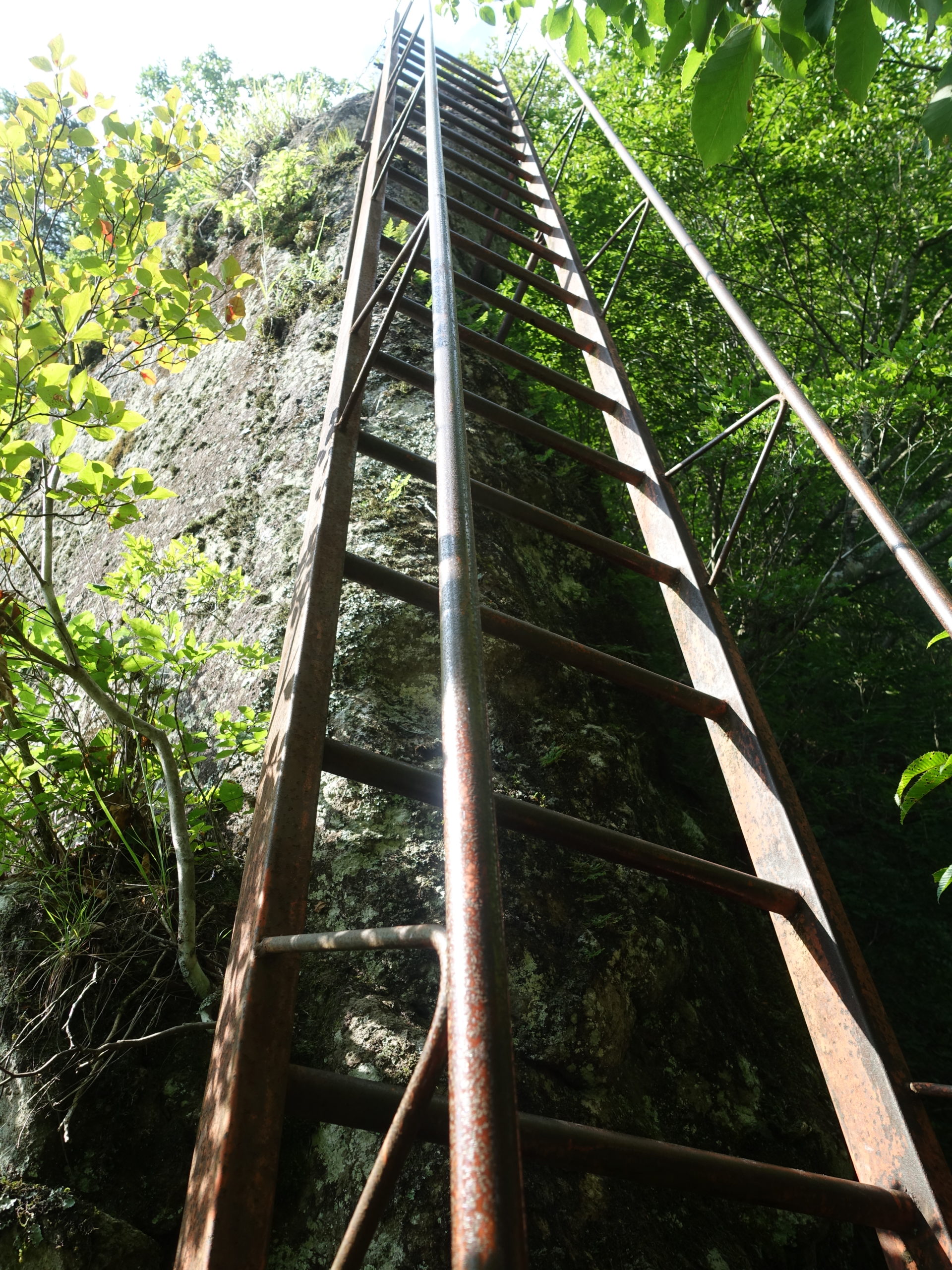駐車場から不動寺まで急坂を登り林道にでれば、ようやく馬の背の分岐だ。ここのクサリ場は他の山で見たことない様な足のすくむ状況で面白い。鉄のハシゴも垂直に近いものもあり、それなりの覚悟がないと通過できない。クサリ登りもようやく終わりやせ尾根を辿れば展望抜群の観音岩だ。以前ここから食料?を落としたことが思い出された。今日の天気は午後が不安定、その覚悟で早出してきた、腹ごしらえをして上底瀬へ降りる分岐まで戻った。下山ルートも記憶以上に危険個所が多く神経を使います。右側に九十九谷を見下ろしながら尾根からの分岐にきた。あとは急坂を慎重にたどり上底瀬の集落にでた。