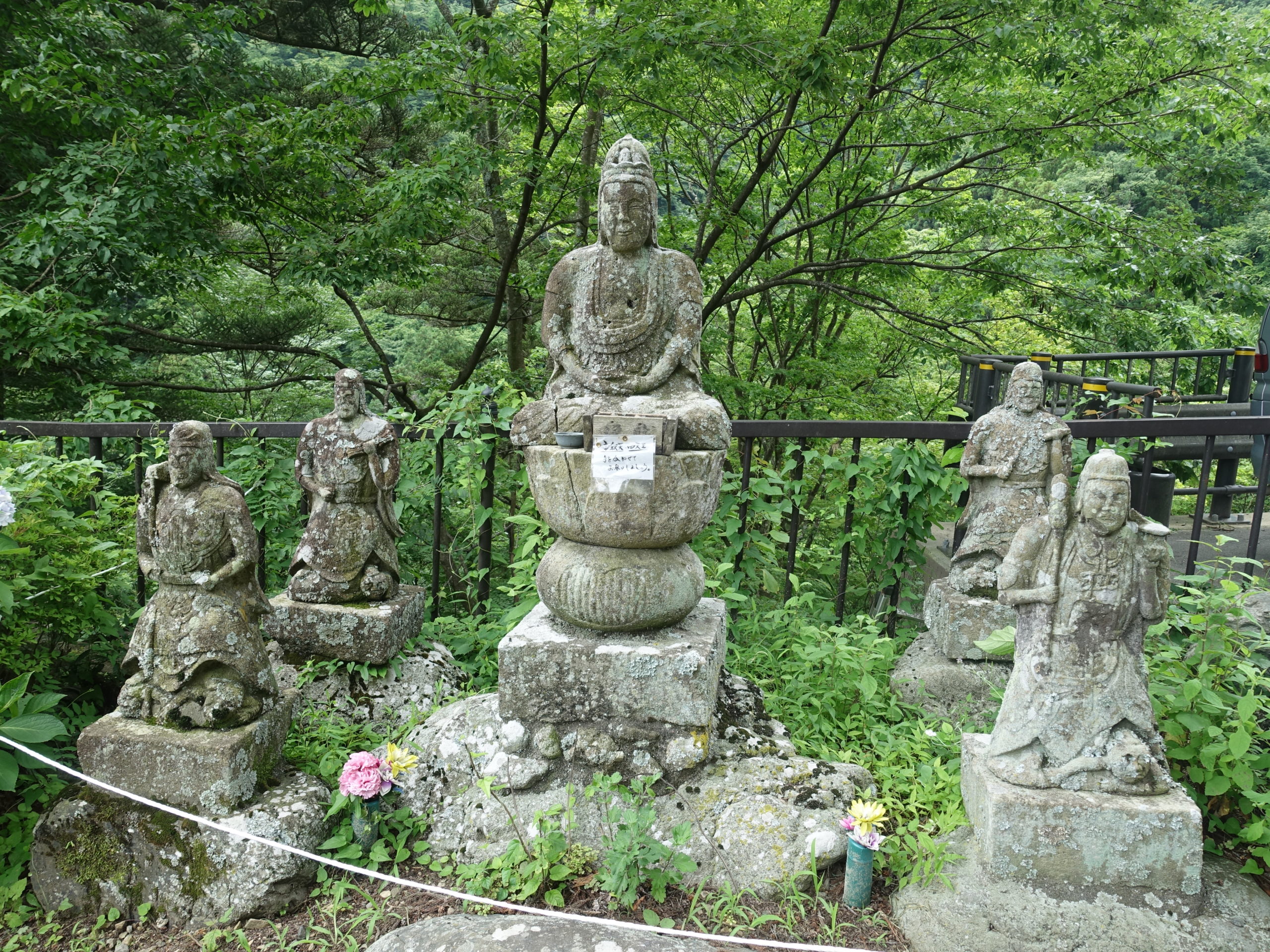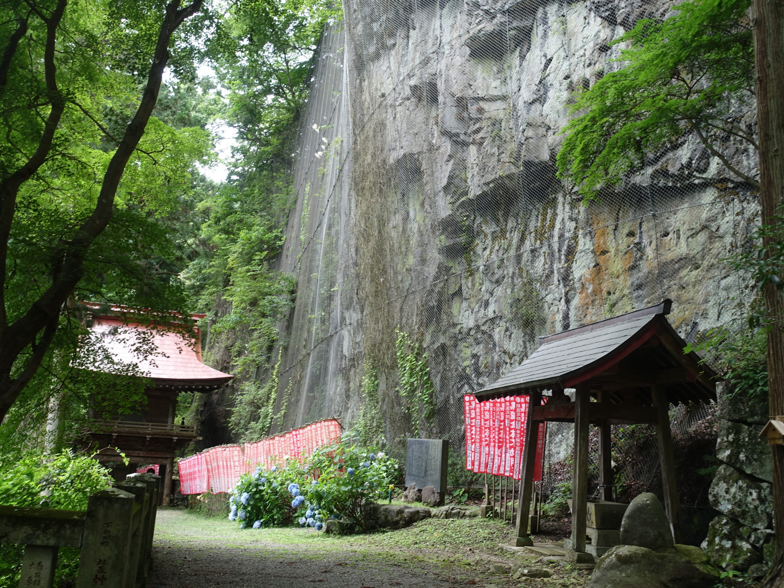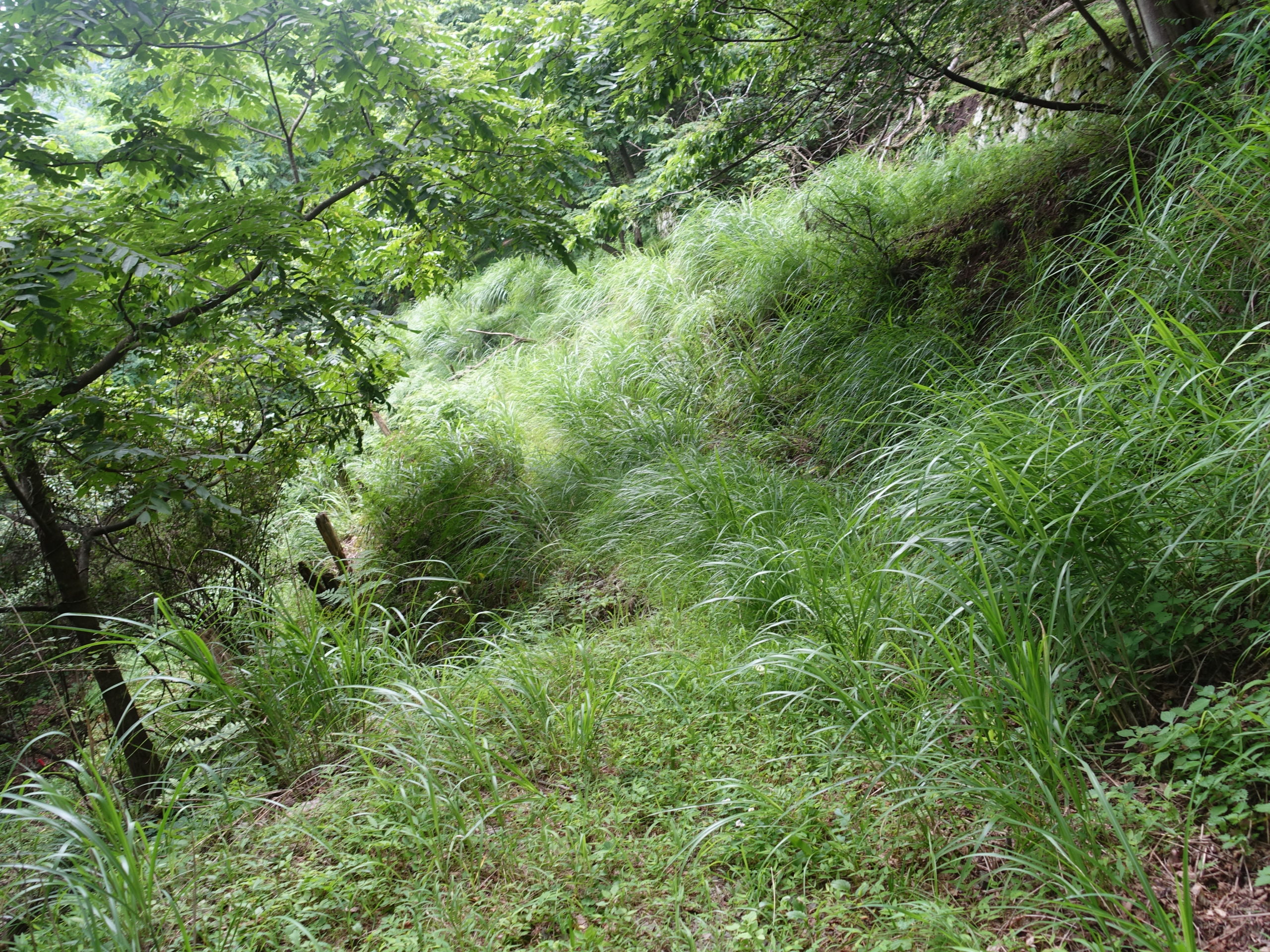 集落の道路を少し歩き不動寺への林道を行く。ところが問題が出てきた。林道最後のころ、ルートが不鮮明、大きくカーブする林道をつめたが行き止まり、登山道が無い。急斜面の崖は危険なので、途中まで戻って良く見ると、崖のすそに草ぼうぼうの中にルートらしき形跡あり。薄い踏み跡を辿るが、やはり途中でなくなり苦労する。最後は草の伸びた林道らしき跡をたどり、朝の馬の背の分岐に無事戻った。今では歩く人はいないのでしょう。不動寺に戻り、せっかくなのでお寺の見学、由緒あるお寺なので是非寄ってみてください。雨に降られず早めに帰還できました。