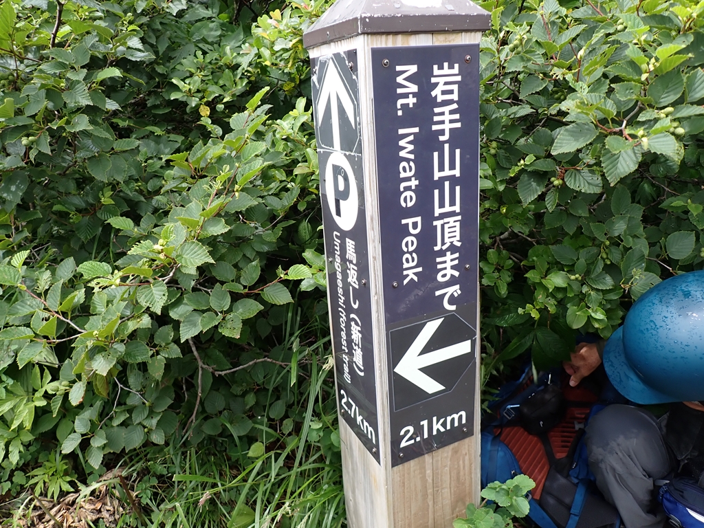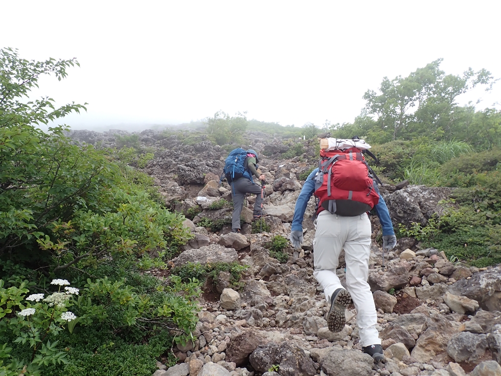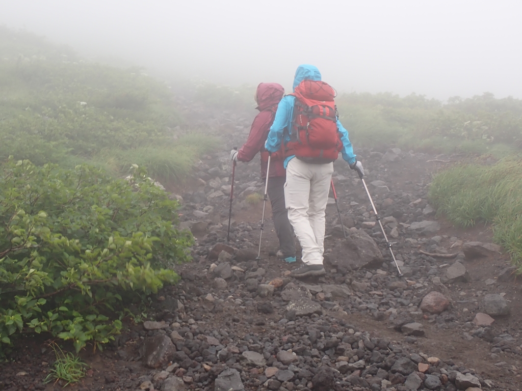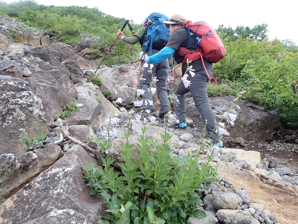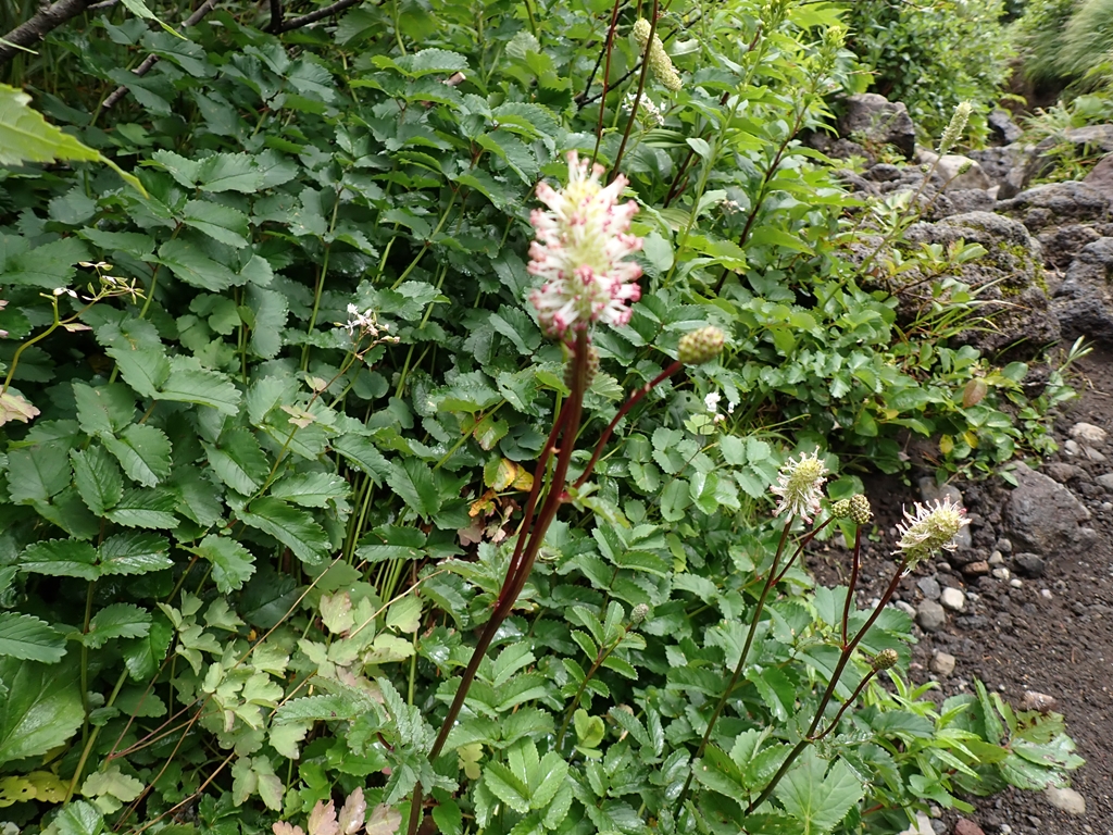 少し谷に下って登り返すと尾根に乗る。ここでクルマユリに迎えられた。他にトリアシショウマも多い。またシラネアオイは花は終わっているがユニークな形の実を付けていた(山ではサンカヨウの実だと思っていたが違っていた)。この実は標高700mからかなりの高所迄見られたので、岩手山にはシラネアオイの群生が広がっているようだ。「0.5合目」で道は2つに分かれる。高原地図には「広い道」「狭い道」と記されている。小休止して左側の「狭い道」を登った。一合目で2つの道は合流した。祠があり、広くなっているので休憩地に最適だ。私達もそこで再度小休止。そこからはクサボタンをよく見た。これは標高がかなり高くなった場所でも見ることができ、広い範囲に生えているようだった。豆腐岩を過ぎると、登山道はザレ気味になる。2合目にはウツボグサの群生があった。2.5合目は旧道と新道の分岐で、風が強くなると面倒なので新道を選んだ。新道は樹林帯の道で、カラマツソウが多かった。しかし、その先で行き交った元気なオバサン3人組に旧道をすすめられて、三合目で旧道にトラバースした。他にも4合目、5合目でも新旧の道を接続する道があるようだが、5合目のものは崩落して侵入禁止になっている。旧道に移って、最初は新道同様の樹林帯内の登山道だったが、次第にガレ場が登場してくる。踏み跡が辿りづらい場所もあったが、ペンキを追いかけて登って行けば大きく道を間違うことは無かった。ハクサンシャジンや橙色の実を付けた低木のヒロハヘビノボラズはよく見た。他に、オトコヨモギ、ヤマハハコ、ミヤマハンショウズル、セリ科の花、アザミの仲間(ガンジュアザミらしい)も見た。旧道では我々以外の人に会ったのは一人だけで、男性単独者と行き交った。彼は七合目で引き返してきたという。急に雨風が強くなり雷まで鳴りだしたので怖くなり引き返してきたという。しかし、私たちは雷鳴を聴いていない。どうやら、麓の自衛隊演習場の大砲音を雷鳴と勘違いしたようだ。確かに初めて聞くと勘違いしそうな轟音である。そう伝えたが彼はそのまま下って行った。5合目の上で一旦ガレ場から樹林帯に入り、ザレ場に出ると、ウスユキソウ、オンタデが生えていた。上を見ると大きく割れた「大蔵岩」があり、今にも崩落してこちらに転がってきそうで怖かった。その岩は残っている部分にも大きな亀裂がいくつも入っていた。「注意」とペンキで大書されていたが、近寄る気にもならない。大岩の後方に6合目の標柱があった。その先に「大願成就」と書かれた銅剣が置かれていた。1981.7.25と日付も入っている。どんな大願があったのだろう。聞いてみたいものだ。また低い樹林に入って出ると7合目で「新道」と合流した。小休止して避難小屋に向かう。風が強くなり、雨も少し混じってきた。八合目避難小屋は立派な3階建てで避難小屋らしくなかった。地元の山岳会が交替で管理しているらしい。薪をその管理人さんに手渡しした。軽い薪で申し訳なかったが感謝の言葉を掛けてくれた。山頂方面から二人下山してきた。外輪山まで登ったが、目の前に山頂が見えているのに強風で進めなかったという。私達も行けるところまで行こうとしたが、あんまんさんは小屋で休んでいるというので3人で行くことにした。小屋の先はしばらくは低い樹林のなかの登山道なので、風は強くは感じなかった。しかし、雨が強くなったので、雨具を着た。しかし、上着しか付けなかったのが失敗。9合目の上で、雨風が強くなってきた。せめてコマクサを見られるところまで頑張ろうと声を掛け合った。するとすぐ上でコマクサが咲いていた。登山道のロープがあったので近づくことはできなかったが、ボケた写真を撮ってそこで折り返すことにした。もし、雨具パンツも履いていたならもう少し上まで行けたかもしれない。私達が折り返そうとしたら、半ズボン姿でびしょ濡れになった男性が下りてきた。何とか山頂まで行ってきたという。私達は彼の後に付いて下った。小屋に戻ると雨風が少し弱くなってきた。管理人さんに「入って休んでいってください」と声を掛けられたが、靴を脱ぐのが面倒なので小屋に入るのを遠慮した。ペットボトルに御成清水の水を入れ替えてから下山開始。新道を下り、6合目あたりで雨具を脱いだ。それからはひたすら下る。滑って転んでということはなかったが、段差の大きいところは気を使った。三合目で休んでいると年配の夫人が登って来た。かなり疲れているようだったが、後ろに背の高い男性がついていた。避難小屋まで辿り着くのも大変だろうなと思った。所々で花を見ながら下り、鬼又清水まで下りてきた。そこで大休止。水をがぶ飲みしてゆっくりと休んでから駐車場に戻った。