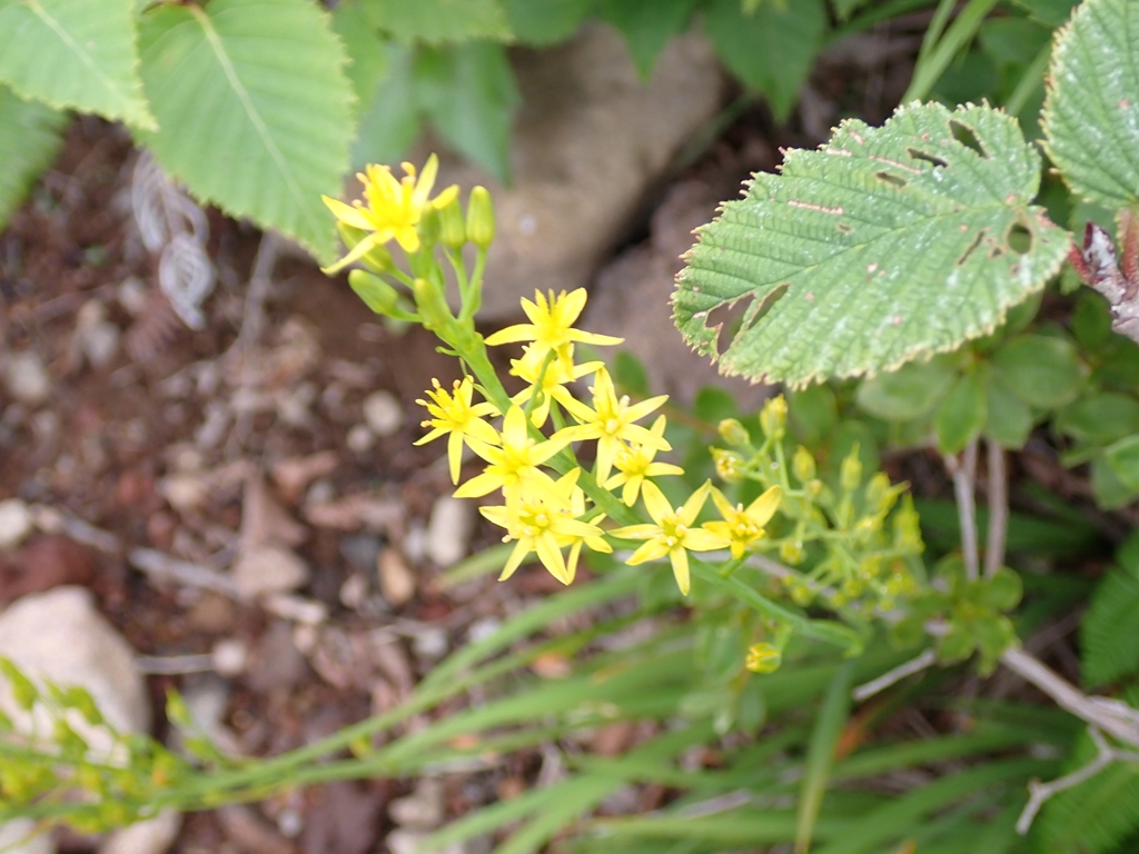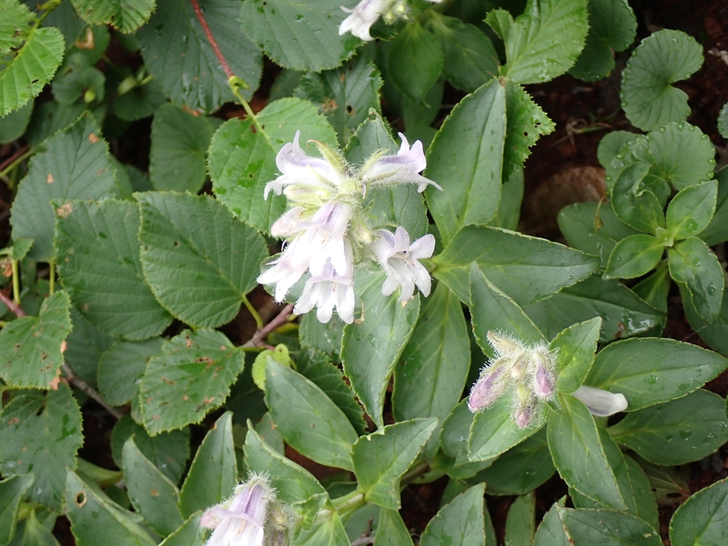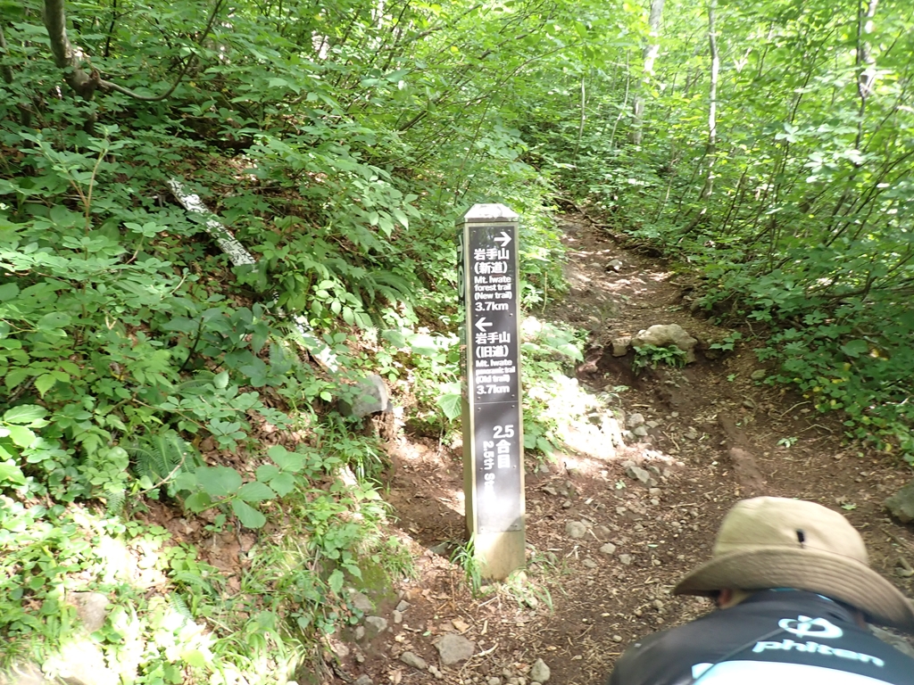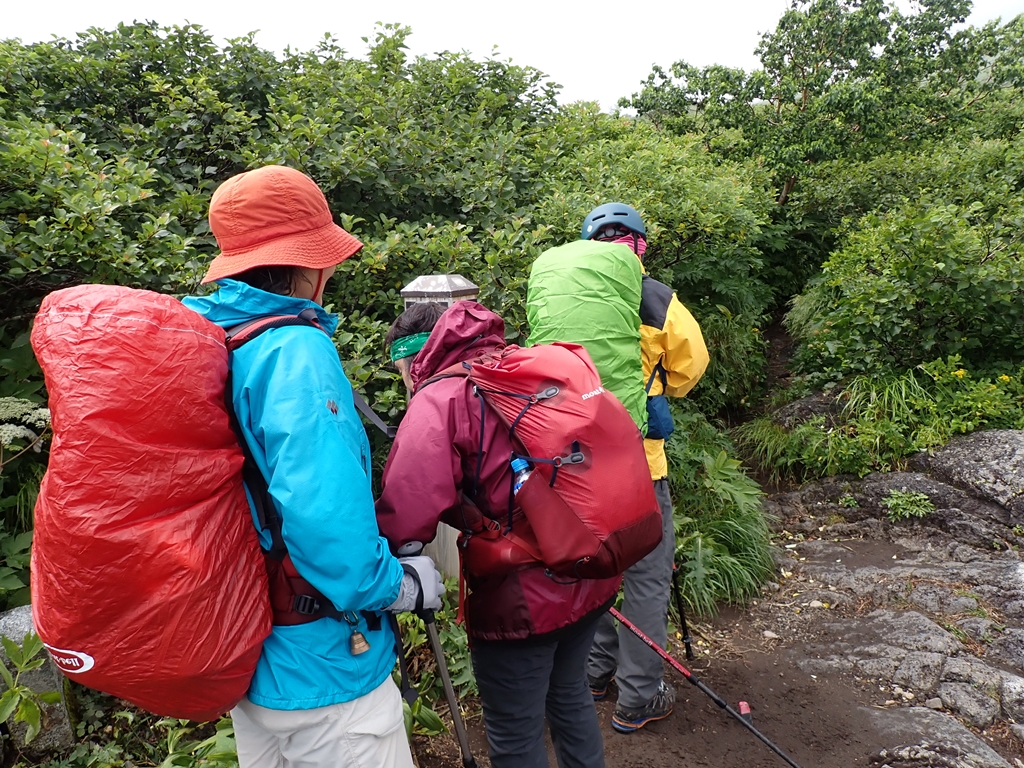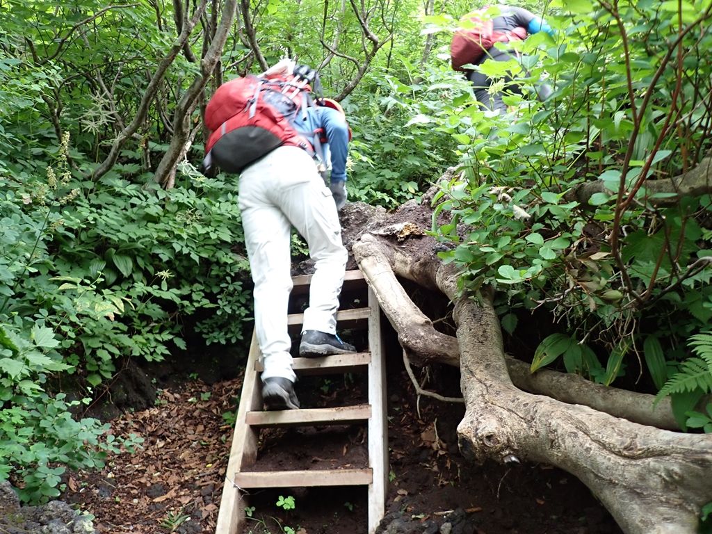 少し谷に下って登り返すと尾根に乗る。ここでクルマユリに迎えられた。他にトリアシショウマも多い。またシラネアオイは花は終わっているがユニークな形の実を付けていた(山ではサンカヨウの実だと思っていたが違っていた)。この実は標高700mからかなりの高所迄見られたので、岩手山にはシラネアオイの群生が広がっているようだ。「0.5合目」で道は2つに分かれる。高原地図には「広い道」「狭い道」と記されている。小休止して左側の「狭い道」を登った。一合目で2つの道は合流した。祠があり、広くなっているので休憩地に最適だ。私達もそこで再度小休止。そこからはクサボタンをよく見た。これは標高がかなり高くなった場所でも見ることができ、広い範囲に生えているようだった。豆腐岩を過ぎると、登山道はザレ気味になる。2合目にはウツボグサの群生があった。2.5合目は旧道と新道の分岐で、風が強くなると面倒なので新道を選んだ。新道は樹林帯の道で、カラマツソウが多かった。しかし、その先で行き交った元気なオバサン3人組に旧道をすすめられて、三合目で旧道にトラバースした。他にも4合目、5合目でも新旧の道を接続する道があるようだが、5合目のものは崩落して侵入禁止になっている。旧道に移って、最初は新道同様の樹林帯内の登山道だったが、次第にガレ場が登場してくる。踏み跡が辿りづらい場所もあったが、ペンキを追いかけて登って行けば大きく道を間違うことは無かった。ハクサンシャジンや橙色の実を付けた低木のヒロハヘビノボラズはよく見た。他に、オトコヨモギ、ヤマハハコ、ミヤマハンショウズル、セリ科の花、アザミの仲間(ガンジュアザミらしい)も見た。旧道では我々以外の人に会ったのは一人だけで、男性単独者と行き交った。彼は七合目で引き返してきたという。急に雨風が強くなり雷まで鳴りだしたので怖くなり引き返してきたという。しかし、私たちは雷鳴を聴いていない。どうやら、麓の自衛隊演習場の大砲音を雷鳴と勘違いしたようだ。確かに初めて聞くと勘違いしそうな轟音である。そう伝えたが彼はそのまま下って行った。5合目の上で一旦ガレ場から樹林帯に入り、ザレ場に出ると、ウスユキソウ、オンタデが生えていた。上を見ると大きく割れた「大蔵岩」があり、今にも崩落してこちらに転がってきそうで怖かった。その岩は残っている部分にも大きな亀裂がいくつも入っていた。「注意」とペンキで大書されていたが、近寄る気にもならない。大岩の後方に6合目の標柱があった。その先に「大願成就」と書かれた銅剣が置かれていた。1981.7.25と日付も入っている。どんな大願があったのだろう。聞いてみたいものだ。また低い樹林に入って出ると7合目で「新道」と合流した。小休止して避難小屋に向かう。風が強くなり、雨も少し混じってきた。八合目避難小屋は立派な3階建てで避難小屋らしくなかった。地元の山岳会が交替で管理しているらしい。薪をその管理人さんに手渡しした。軽い薪で申し訳なかったが感謝の言葉を掛けてくれた。山頂方面から二人下山してきた。外輪山まで登ったが、目の前に山頂が見えているのに強風で進めなかったという。私達も行けるところまで行こうとしたが、あんまんさんは小屋で休んでいるというので3人で行くことにした。小屋の先はしばらくは低い樹林のなかの登山道なので、風は強くは感じなかった。しかし、雨が強くなったので、雨具を着た。しかし、上着しか付けなかったのが失敗。9合目の上で、雨風が強くなってきた。せめてコマクサを見られるところまで頑張ろうと声を掛け合った。するとすぐ上でコマクサが咲いていた。登山道のロープがあったので近づくことはできなかったが、ボケた写真を撮ってそこで折り返すことにした。もし、雨具パンツも履いていたならもう少し上まで行けたかもしれない。私達が折り返そうとしたら、半ズボン姿でびしょ濡れになった男性が下りてきた。何とか山頂まで行ってきたという。私達は彼の後に付いて下った。小屋に戻ると雨風が少し弱くなってきた。管理人さんに「入って休んでいってください」と声を掛けられたが、靴を脱ぐのが面倒なので小屋に入るのを遠慮した。ペットボトルに御成清水の水を入れ替えてから下山開始。新道を下り、6合目あたりで雨具を脱いだ。それからはひたすら下る。滑って転んでということはなかったが、段差の大きいところは気を使った。三合目で休んでいると年配の夫人が登って来た。かなり疲れているようだったが、後ろに背の高い男性がついていた。避難小屋まで辿り着くのも大変だろうなと思った。所々で花を見ながら下り、鬼又清水まで下りてきた。そこで大休止。水をがぶ飲みしてゆっくりと休んでから駐車場に戻った。