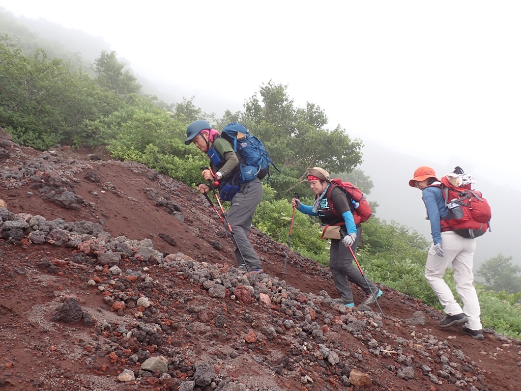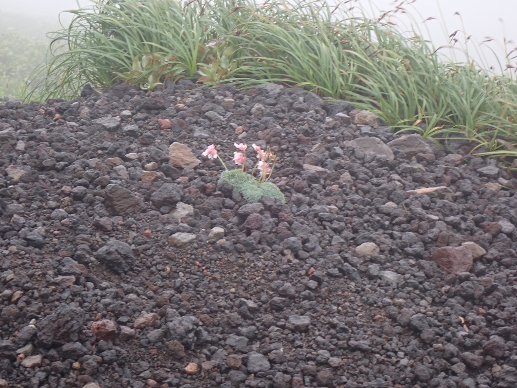 <概要>焼走りから馬返しまで、八合目避難小屋で1泊して縦走する計画だった。しかし、24日が25mの強風予報だったので、馬返しからの往復の日帰り山行に変更して出発した。だが、避難小屋に到着する頃から雨まで降り始めた。3人だけで行けるところまで行くことにして小屋を出発したが、標高1900m手前でコマクサを一輪見た所で雨と風が強くなったのでそこで折り返すことにした。風だけならもう少し先に行けたのだが。山頂到達はならなかったが、多くの花を見ることができた。特に旧道のガレ場に多かった。できれば来年再挑戦したい。