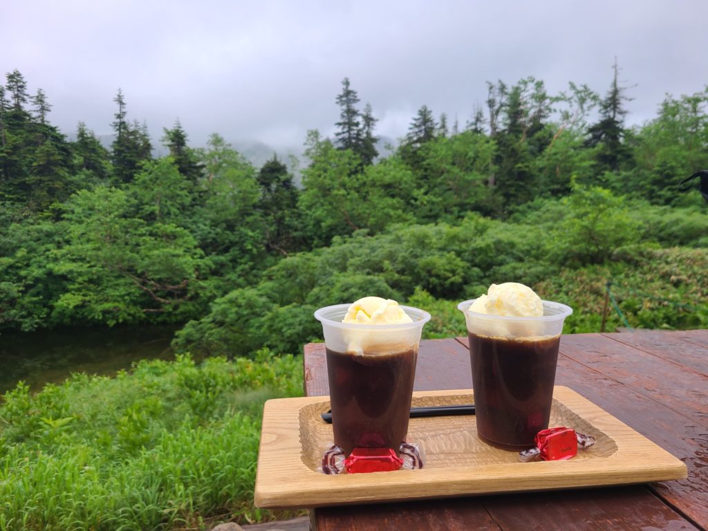 翌朝起きると雨音がしています。天気予報は午前中は晴れ予報だったのに。上に行くのは諦めて下山することにしました。りょうへいも七倉へ抜けるかもと言っていたのですが新穂高温泉に戻ってくるとラインに入っていました。カッパを着て下山開始。帰りの鏡平でコーヒーフロートを飲みました。焙煎珈琲とアイスクリームがマッチしてとてもおいしくお値段もまあ仕方ないかと納得するのでした。時間調整のためわさび平でもそうめんをいただきゆっくり下山しました。新穂高温泉に下山し駐車場へ車を回収しセンターに戻るとドンピシャ合わせたようにりょうへいも下山してきました。毎回寄っているひらひらの森で汗を流し、りょうへいが屋久島で出会った人の勤める松本の山道具やに立ち寄りおしゃべりして帰りました。