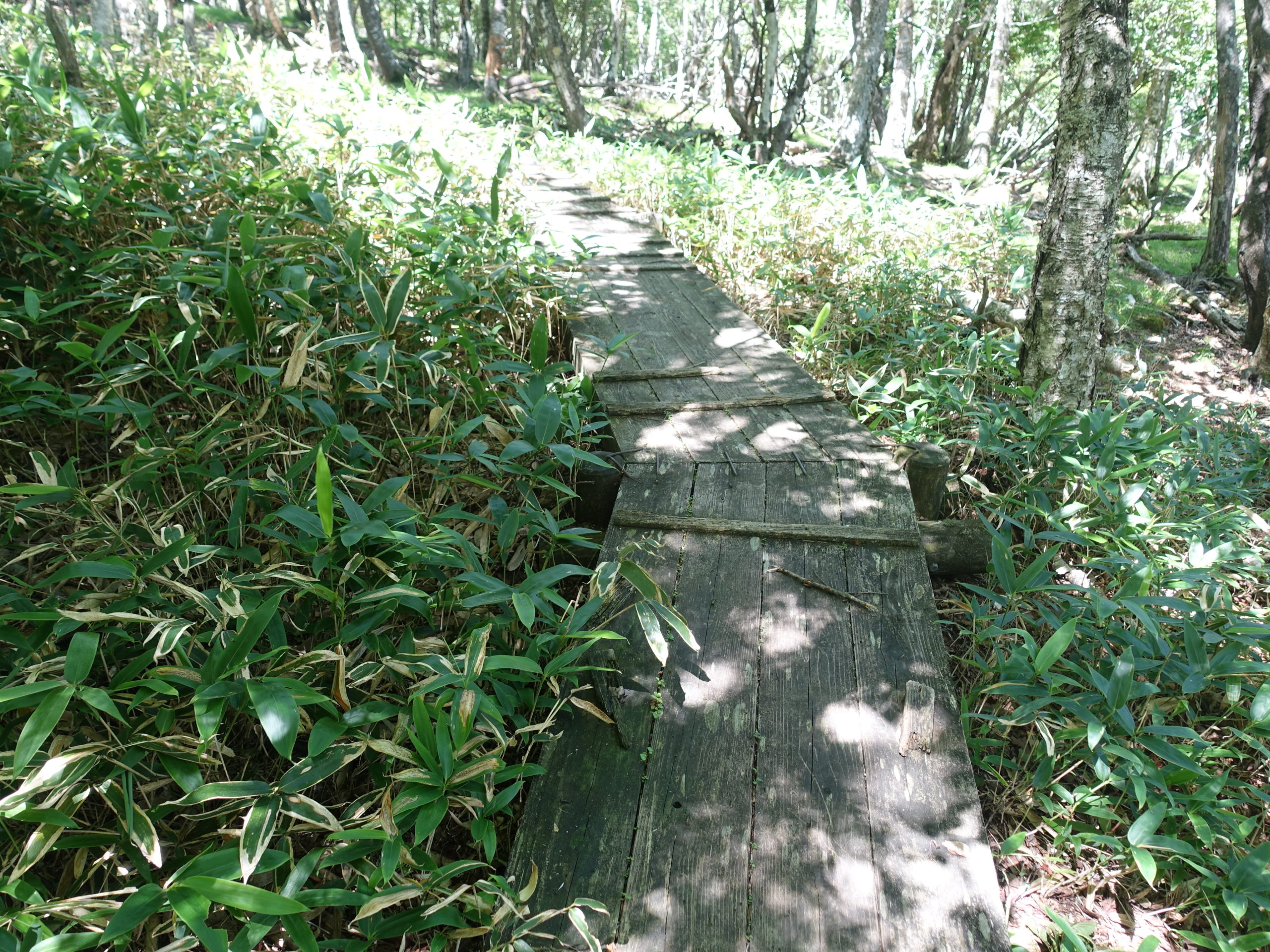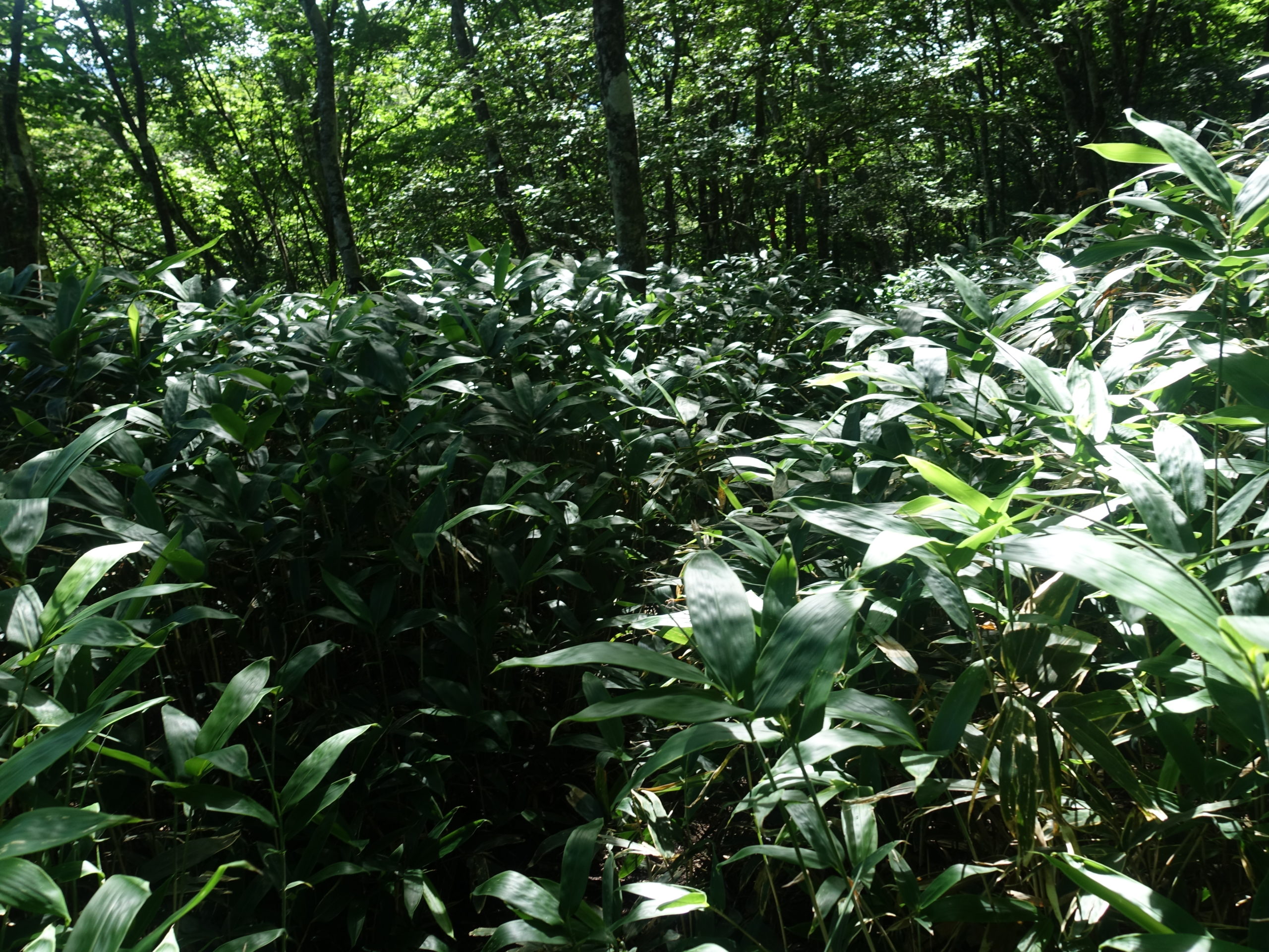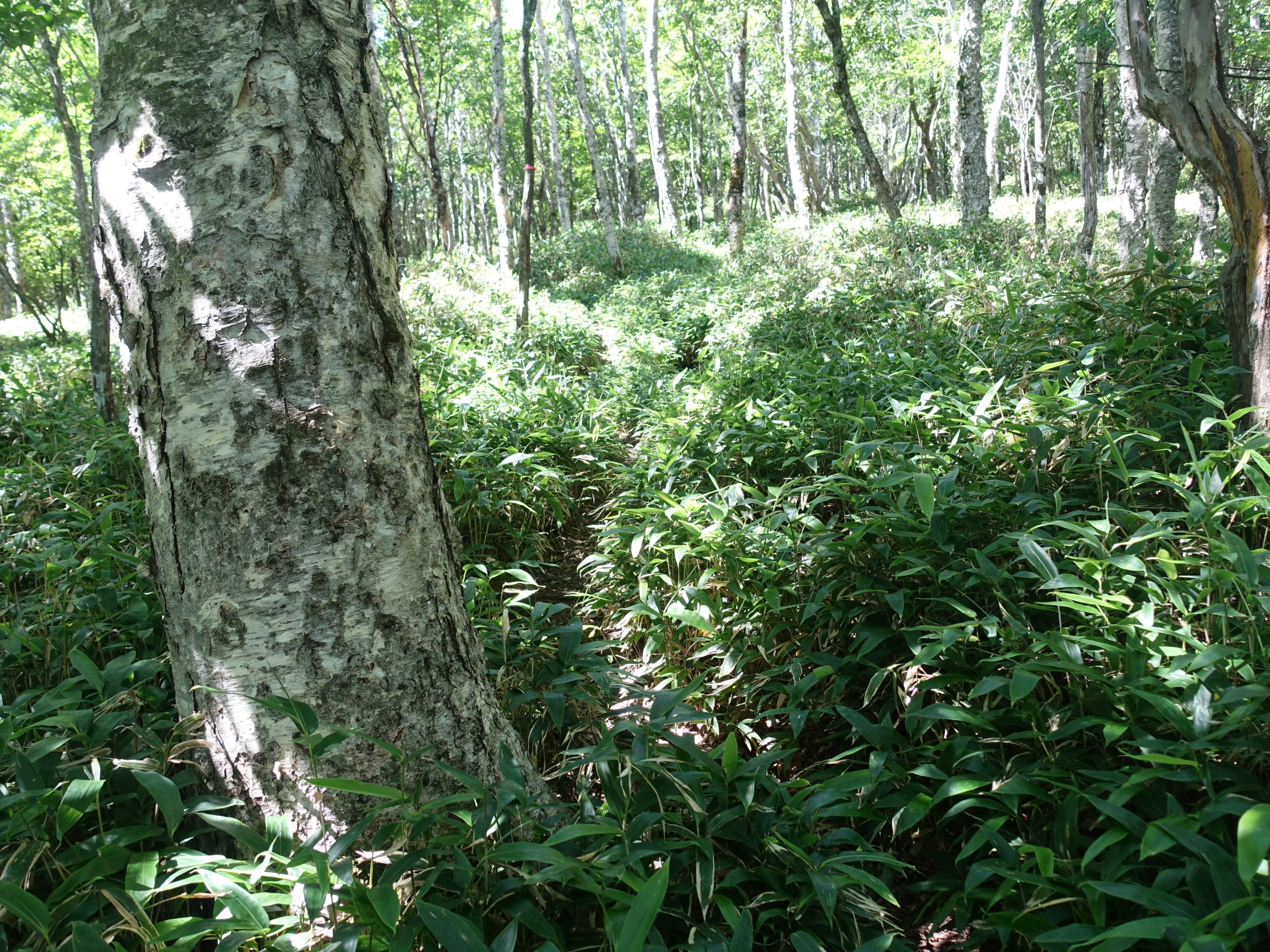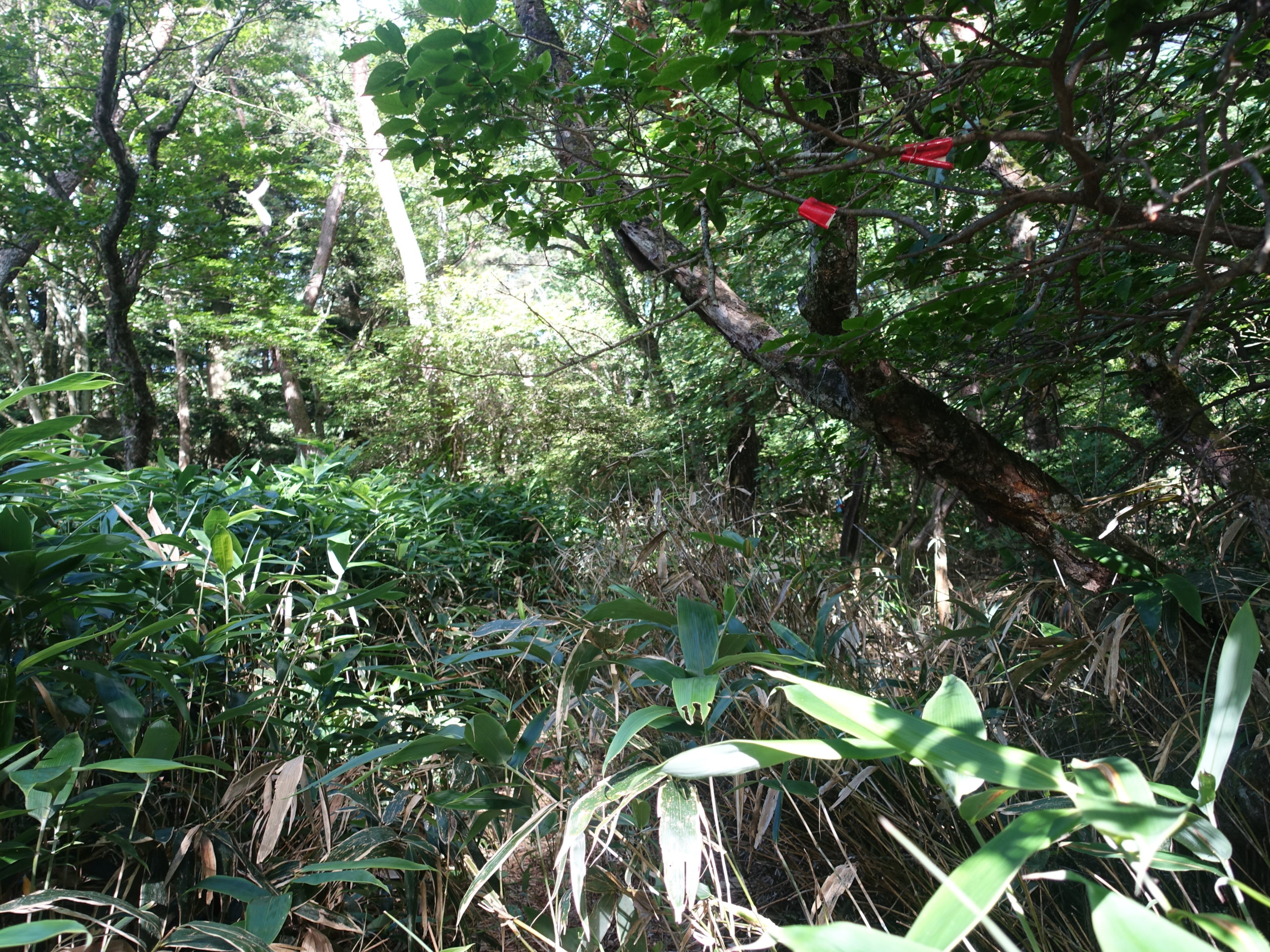 赤城の黒檜山には大沼側からは何度も登っているが、花見ケ原からのルートに興味があり、今回、トレーニングの為北東側からのルートを辿ってみた。栃木ICより太田藪塚まで高速を使い現地へ。途中、栗生山を登ったときの道と別れ、森林公園への山道をたどり駐車場へ。月曜日なのか森林公園は少し静かだ。管理棟、バンガロー、キャンプサイトを通り抜け山道に入った。いきなり道が薄くなり、笹薮がうるさくなる。山頂まで笹との戦いであった。ミヤコザサならともかく、丈の長いチシマザサらしき笹がやっかいだった。腕を剥き出しにしているので、笹かぶれか害虫にやられ、帰ったら皮膚科に世話になる覚悟で笹薮をこいだ。