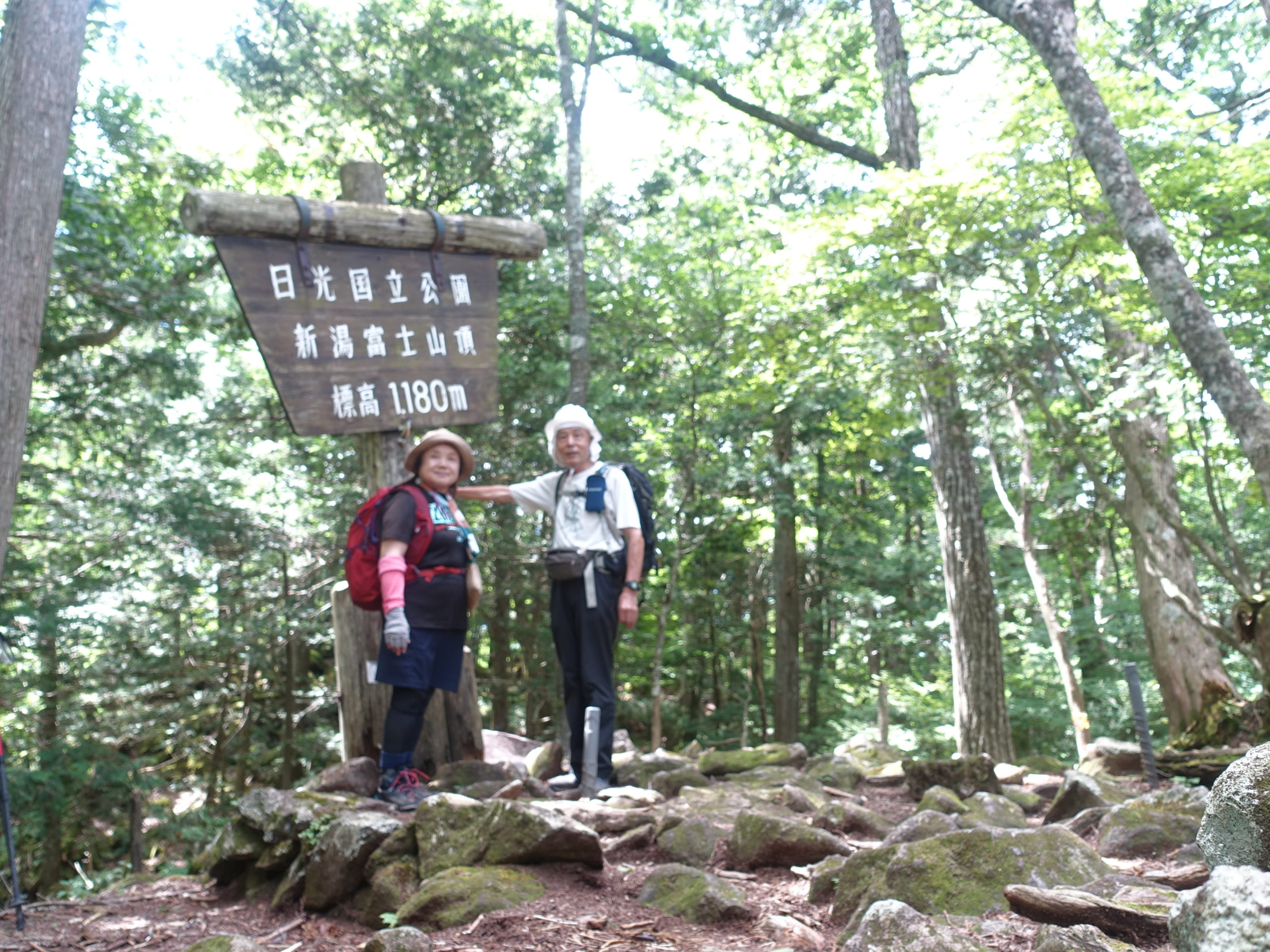 駐車場もトイレも立派で助かる。さっそく林道を少し戻り登山口へ。案内に従い少しで新湯富士の登山口に出る。今回は足慣らし目的、周回の為、直接登らずに山すそを辿る自然研究路を行く。一人では寂しいが、日頃のウップン話しで退屈しない。樹林帯の整理された歩道は暑さを感じず快適な陽気だ、途中、近所のおばさんがキノコ採り(チタケ)をして1個だけ持っていた。我々も可能性を期待し、探す気持ちをもって歩くが結局1日何も見つからなかった。